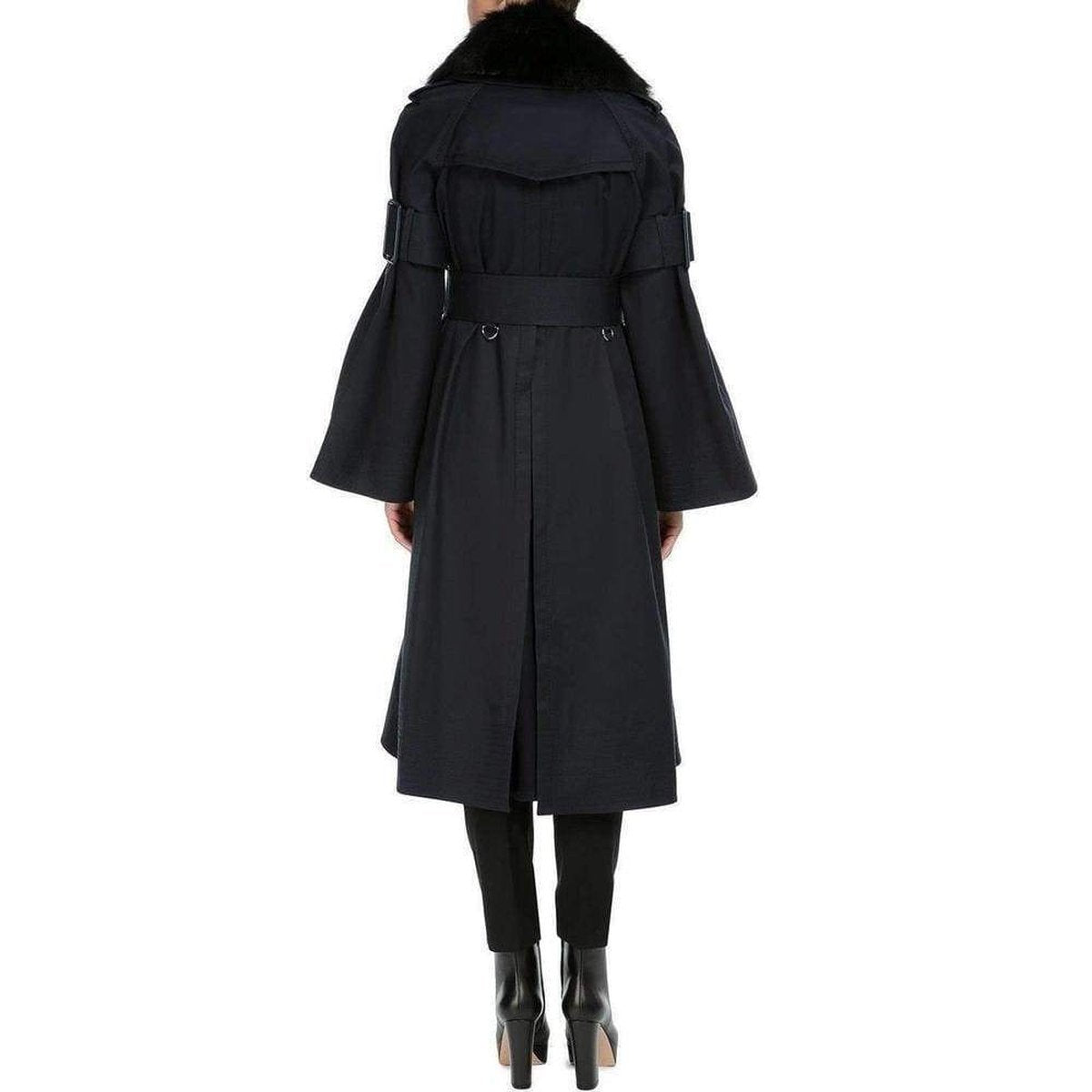 Double-breasted trench coat features buckle belt bell sleeves and a removable fur collar.