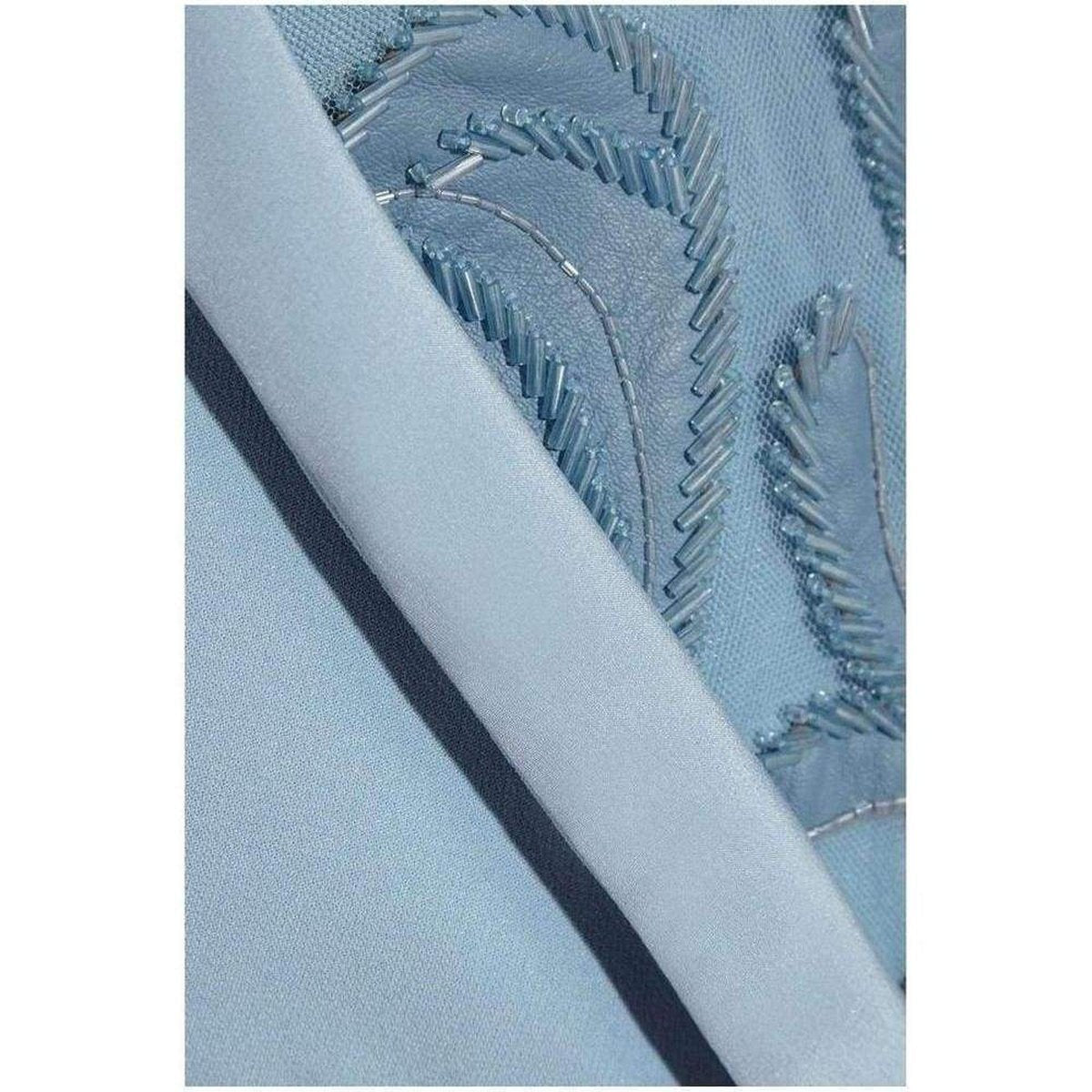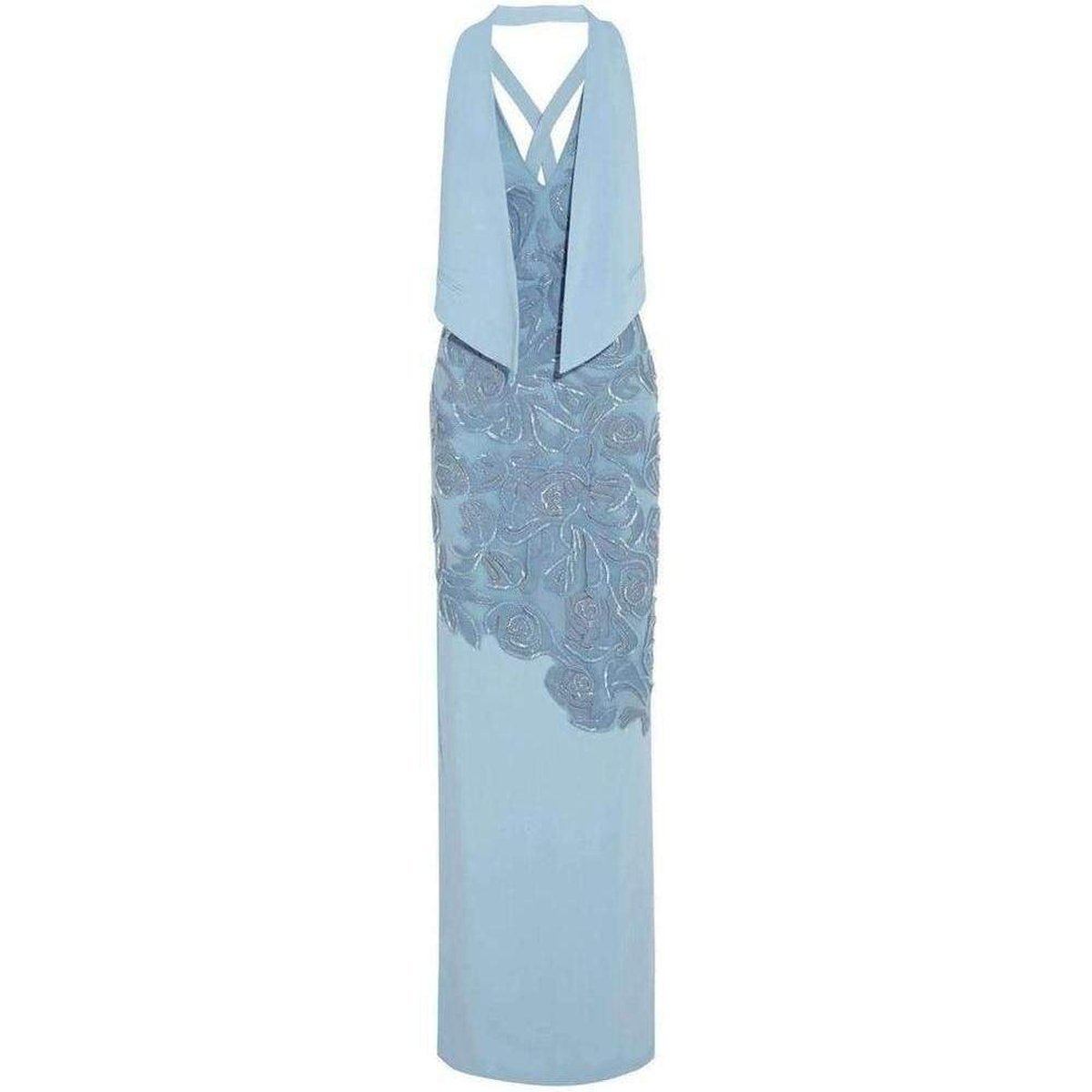 Versace leather cut out floral details embellished with Swarovski crystal and sequins over tulle sky-blue gown.