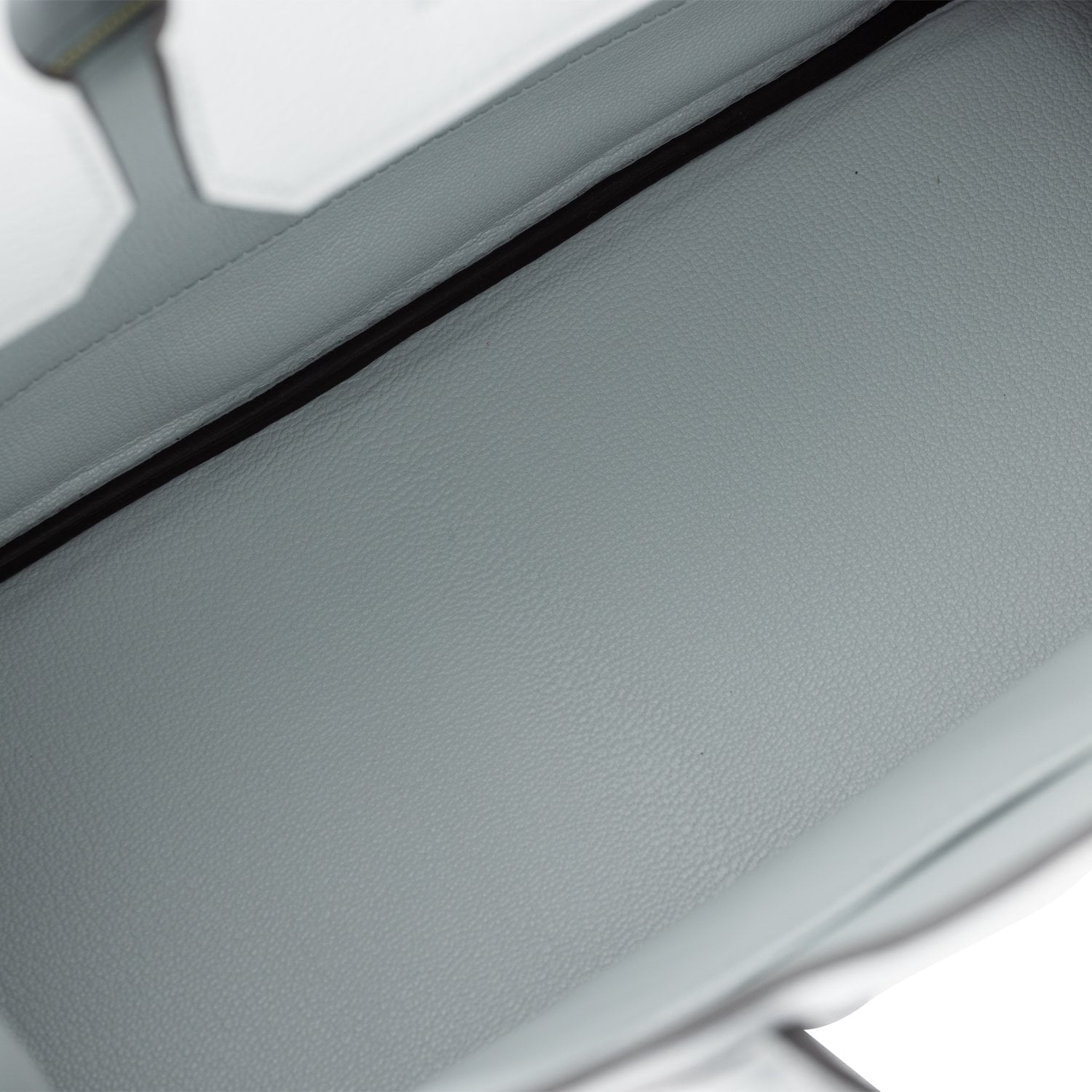This Birkin is in Bleu Pale clemence leather with gold hardware and has tonal stitching, front flap, two straps with center toggle closure, clochette with lock and two keys, and double rolled handles.