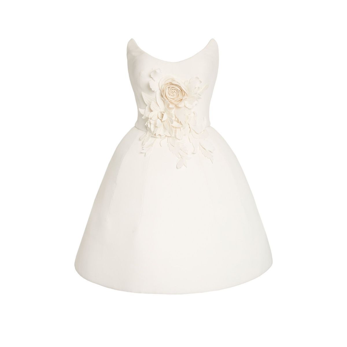 If you're looking to make a statement at your next soiree, look no further than Oscar de la Renta. All of his cocktail and evening dresses exude timeless glamour, especially this mini style. Cut from creamy crepe de chine, it's defined by a bustier bodice and embellished flower details at the waist. Show off your legs and a nice tan with neutral platform sandals.