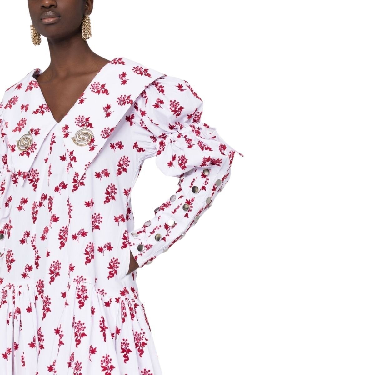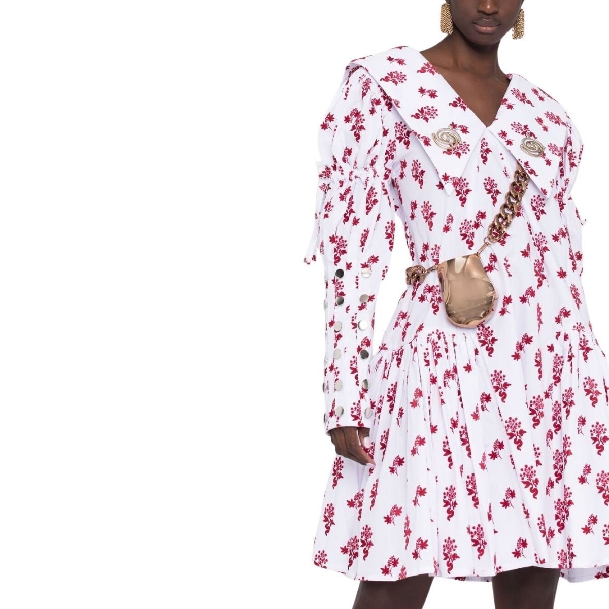 This feminine puff-sleeve mini dress has a drop-waist silhouette and edgy studded metal details that add signature moto flair to the piece.