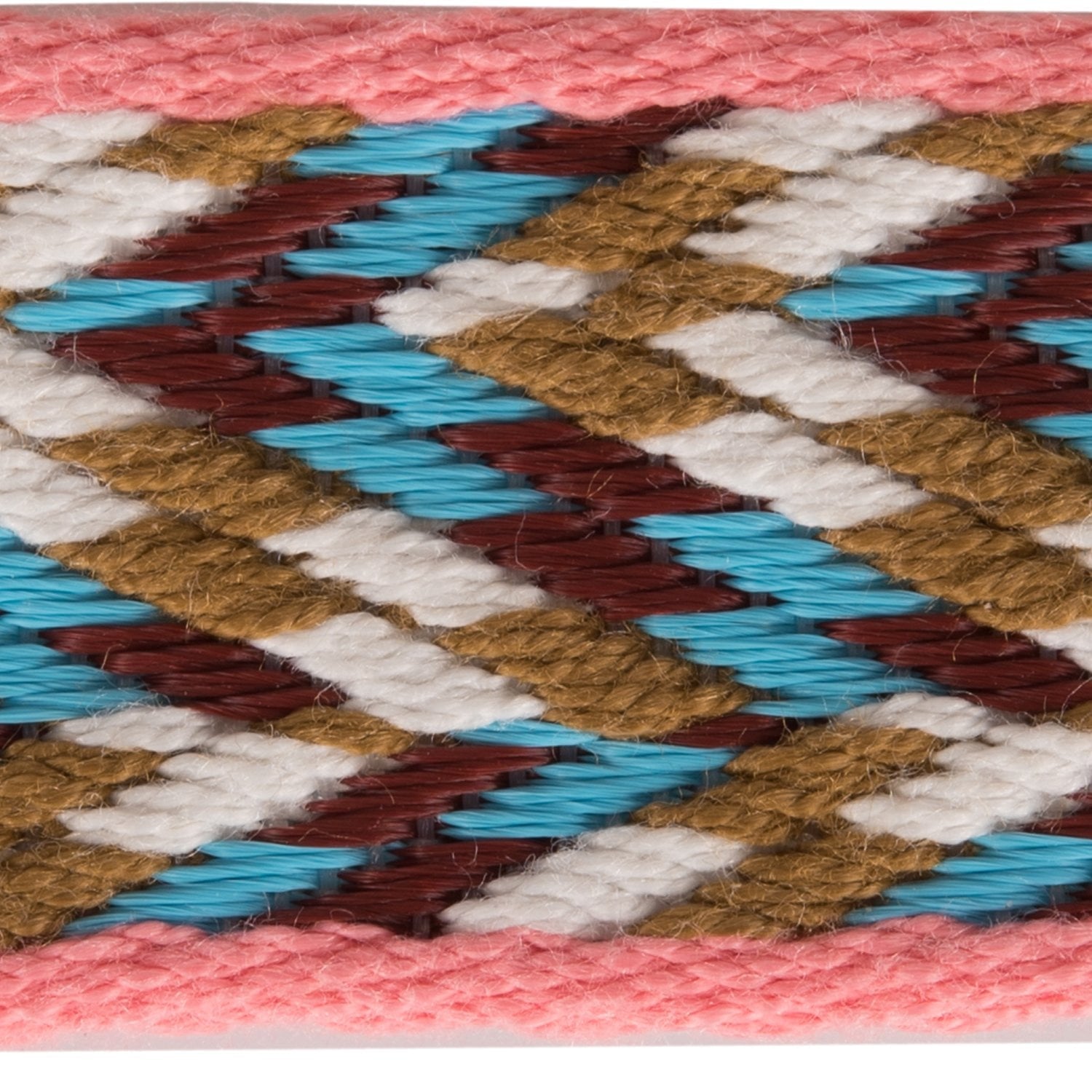 This multi-color strap is made of thick fabric, reinforced by gold swift leather at each end and gold snap hook closures.  It attaches to small kelly bags and bolides for a "new look" as an alternative to the traditional leather strap that accompanies the bag.