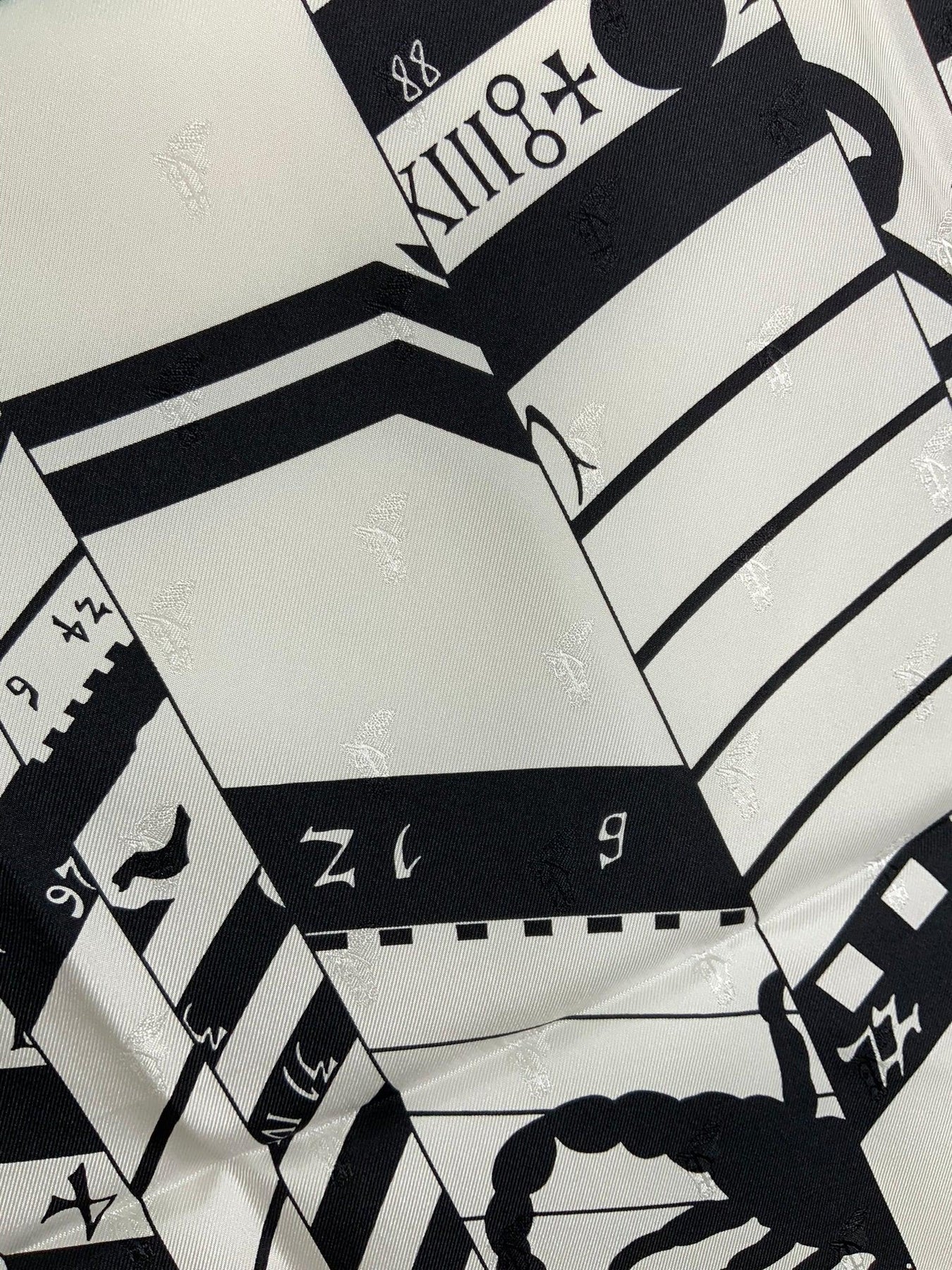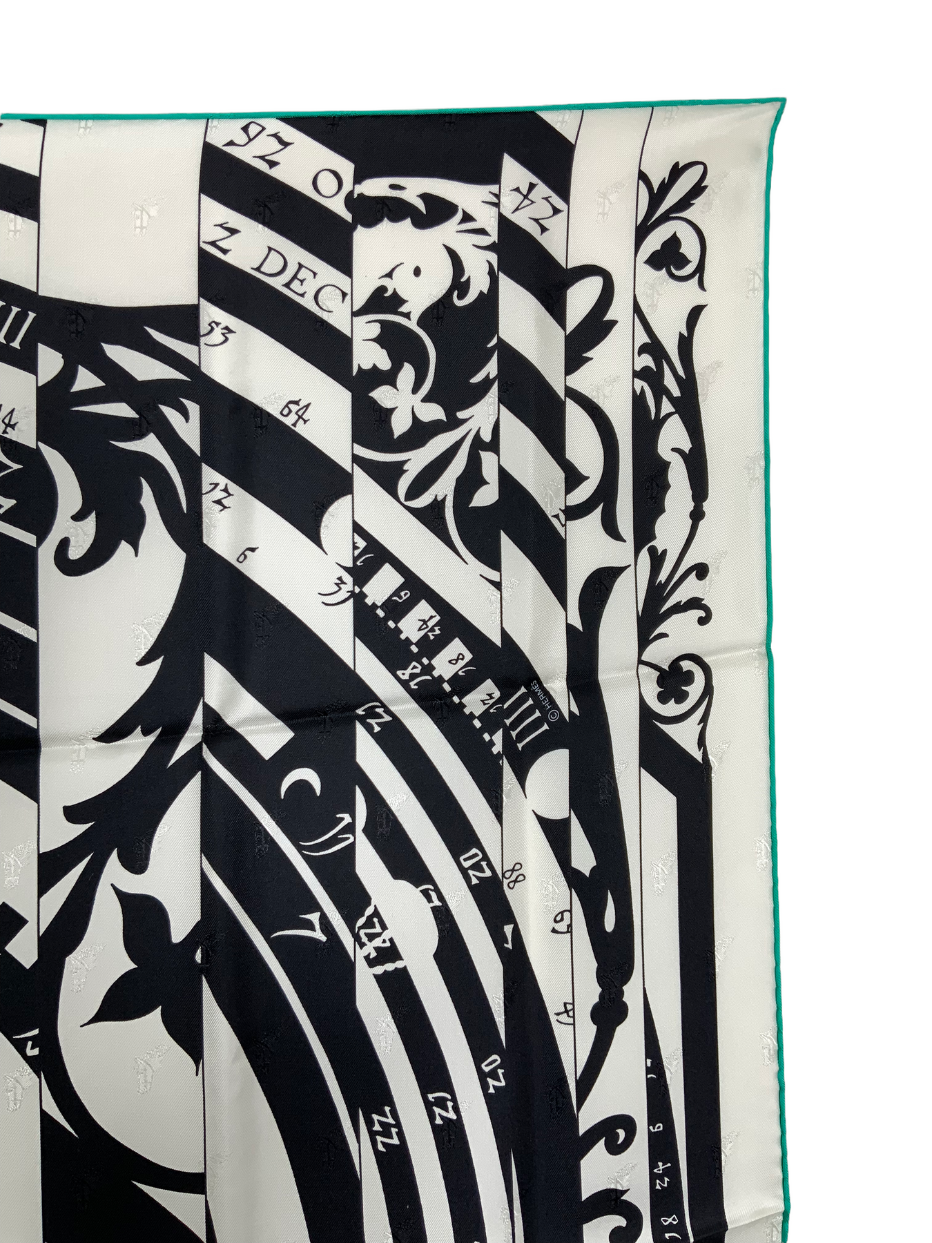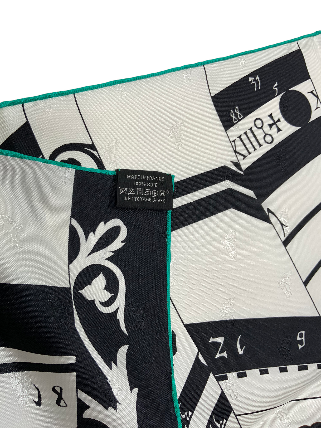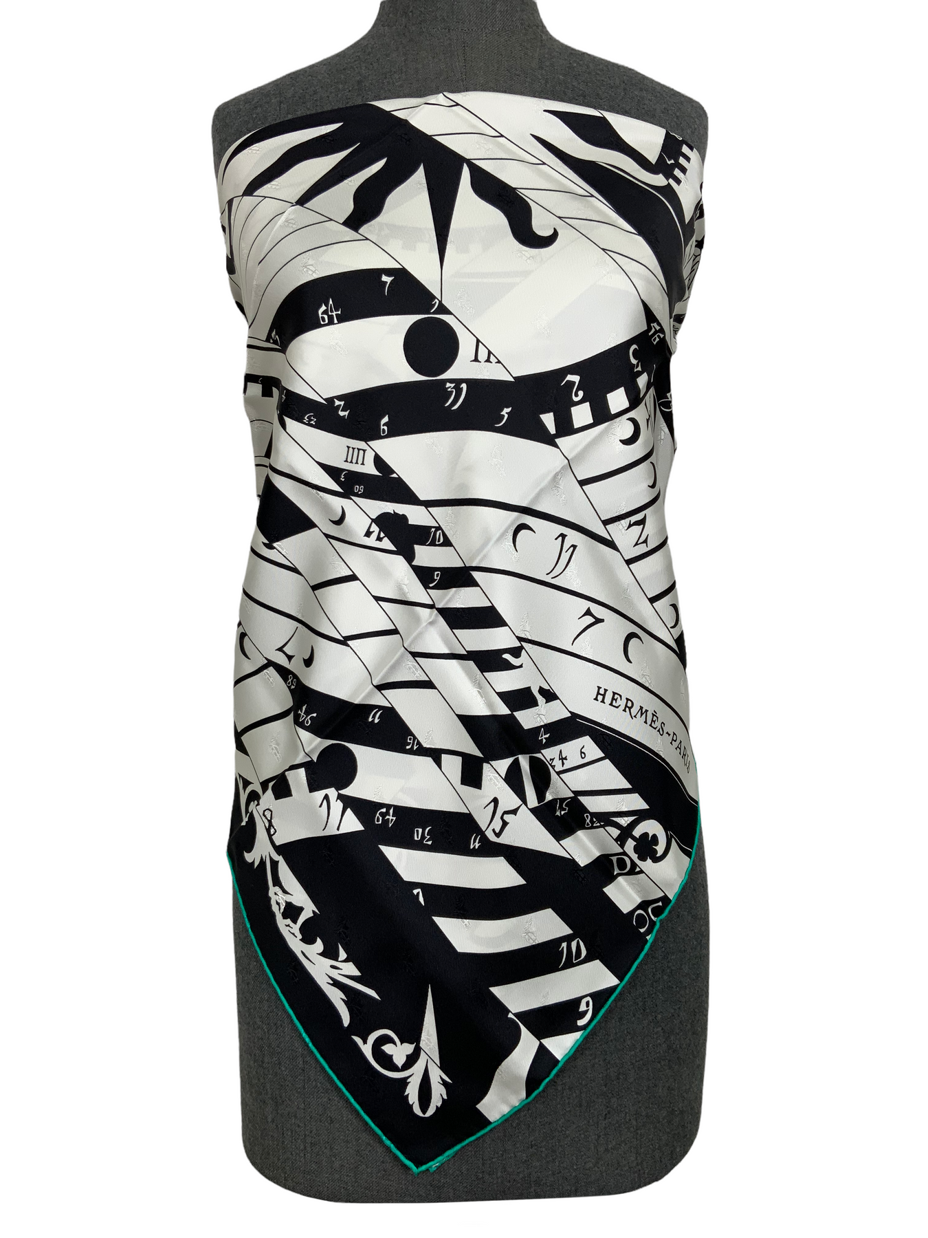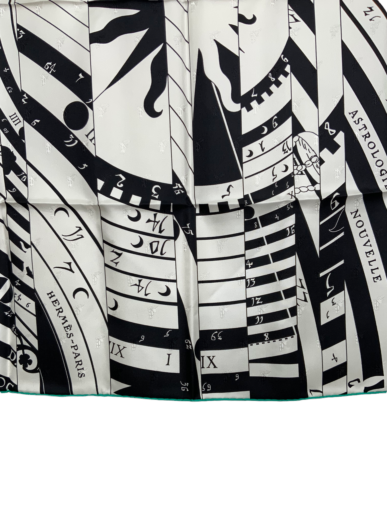 We the ity of this Hermes Astrologie Nouvelle Silk Scarf 90 designed by Cyrille Diatkine and first issued in 2013. This stunning scarf translates to 'New Astrology' features zodiac images on a white and black silk background with teal hand-rolled edges. This gorgeous scarf has become extremely popular for collectors as they have stopped producing jacquard scarves.