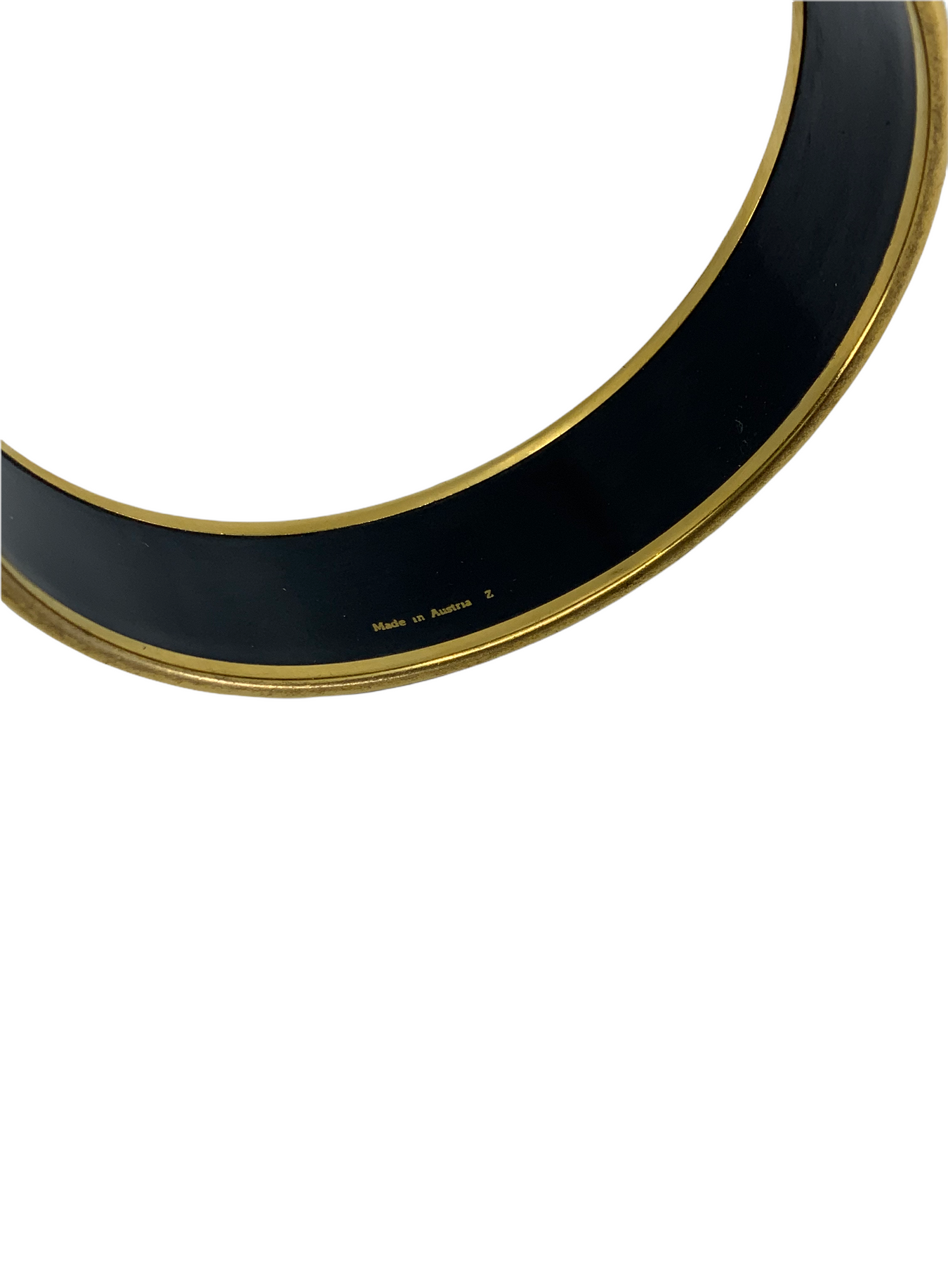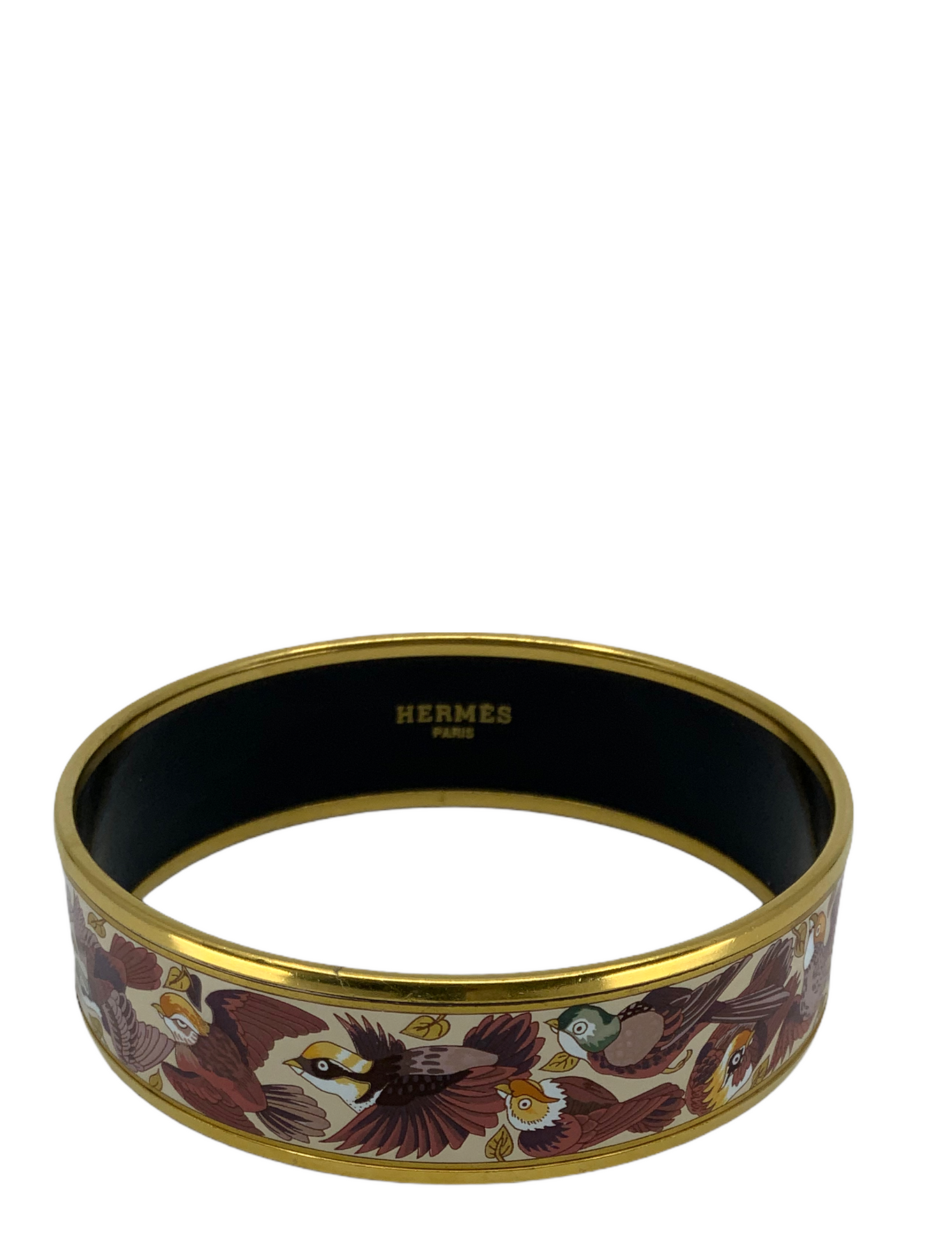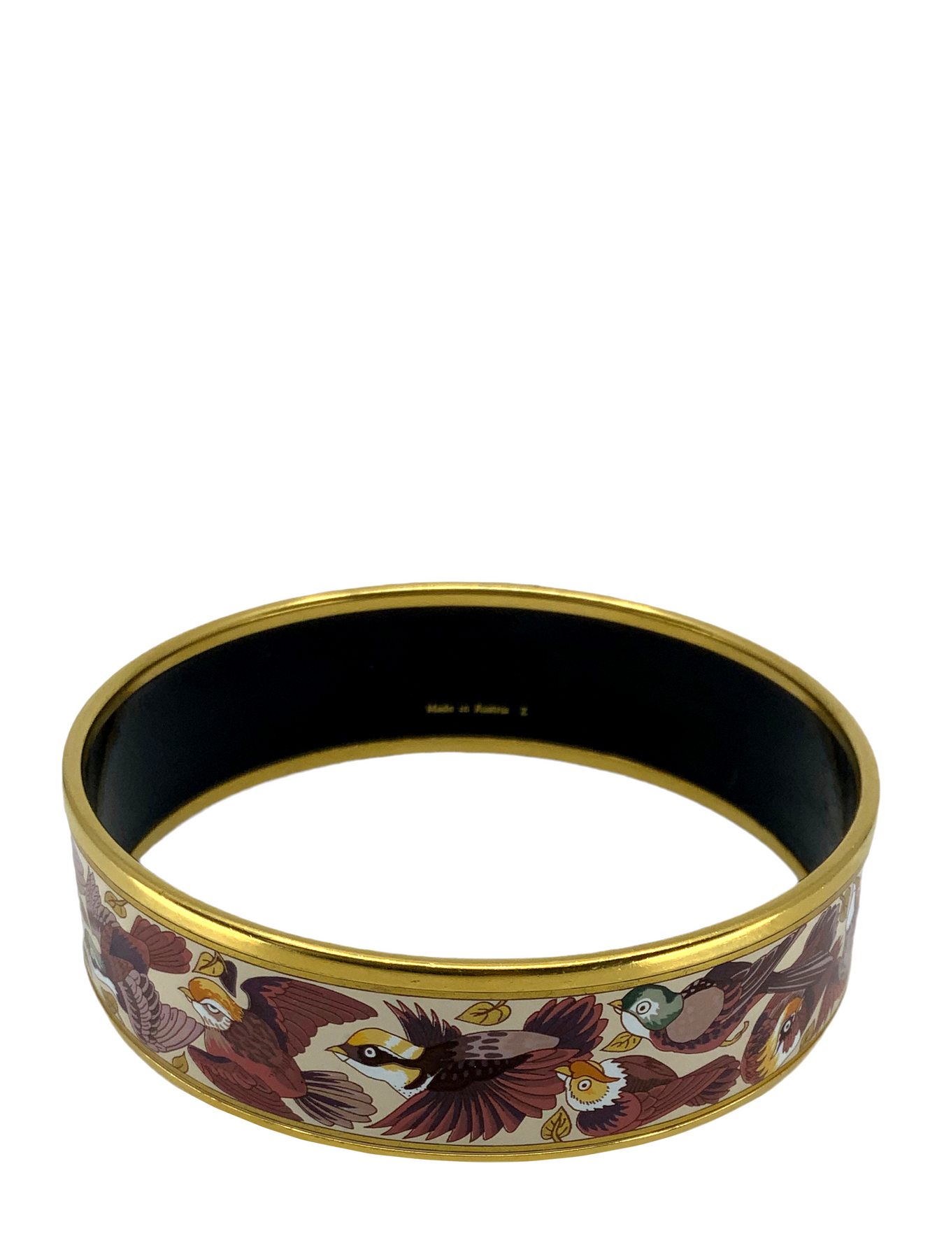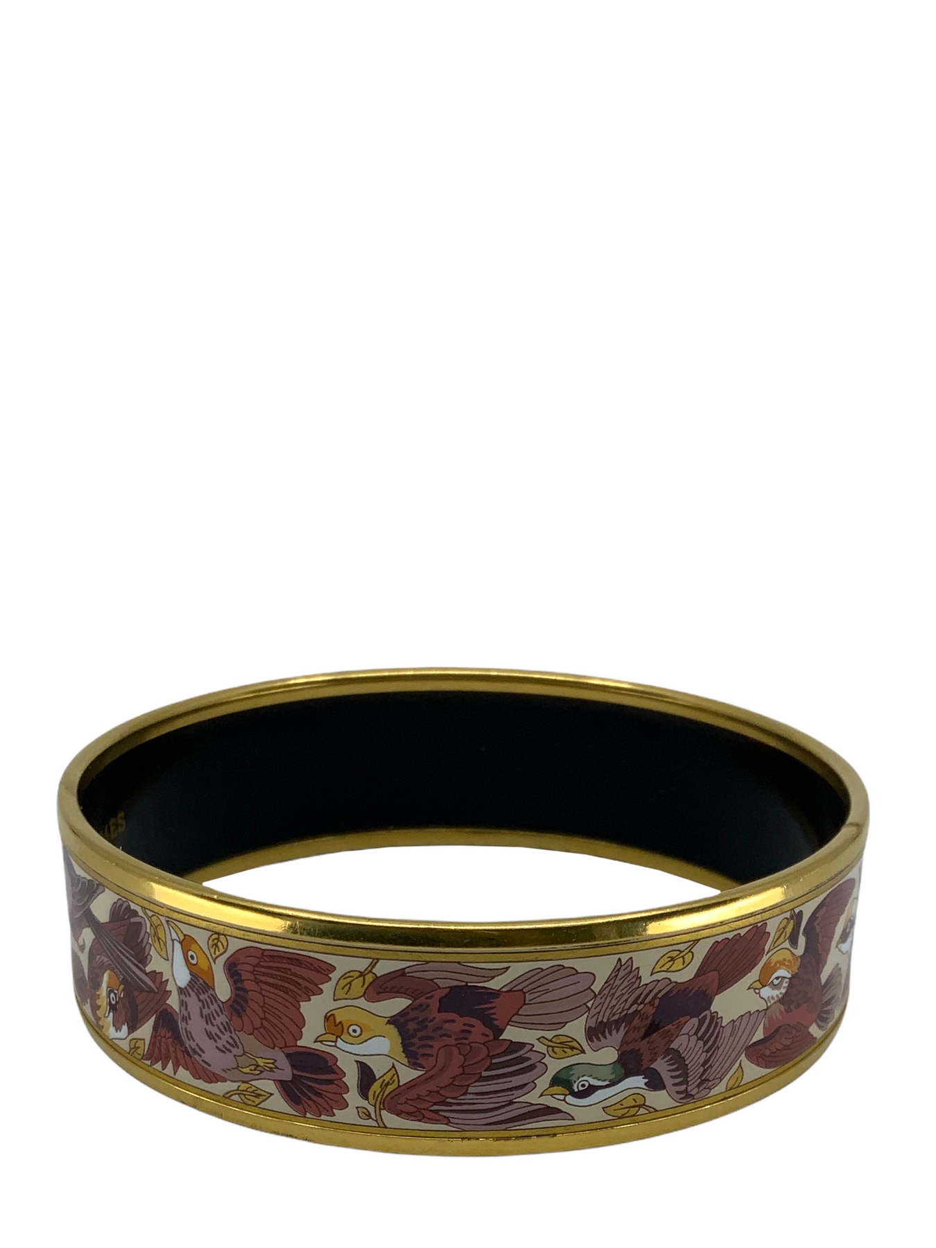 d ! This beautiful graphic Hermes Equestrian/Horse Themed Printed Enamel Wide Bracelet 70 features colorful exotic birds with a gold metal plated rim.