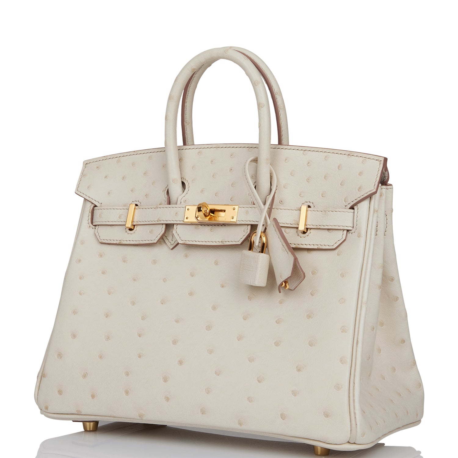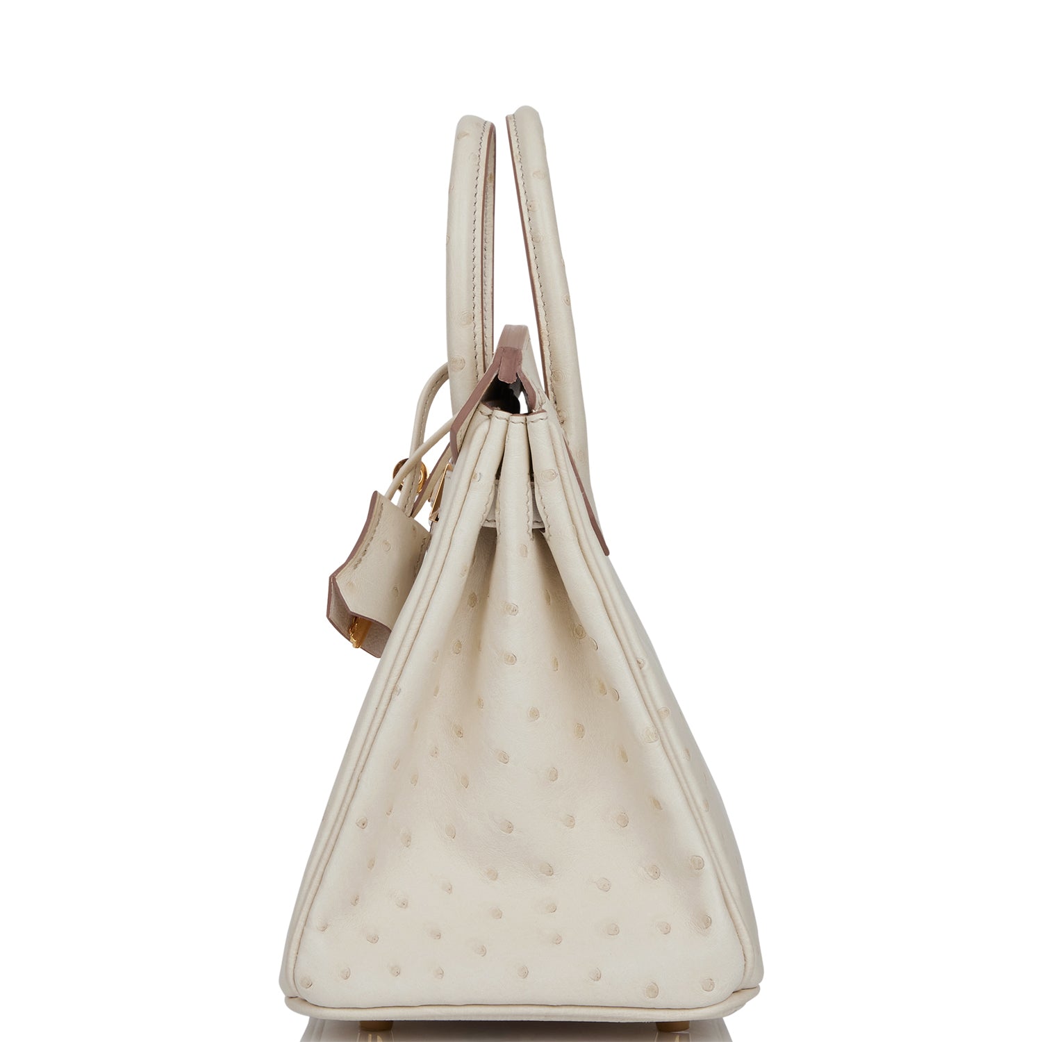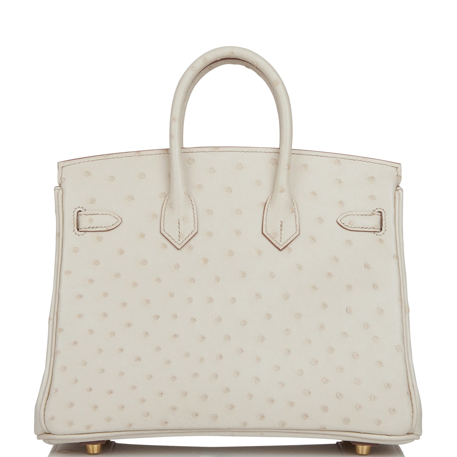 This Birkin is in Beton ostrich with gold hardware and features tonal stitching, front flap, two straps with center toggle closure, clochette with lock and two keys, and double rolled handles.