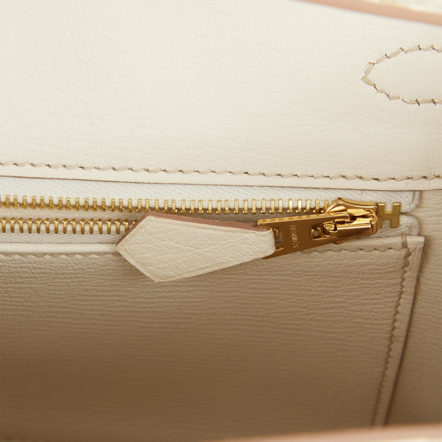 The interior is lined with Beton chevre and has a zip pocket with an Hermes engraved zipper pull and an open pocket on the opposite side.