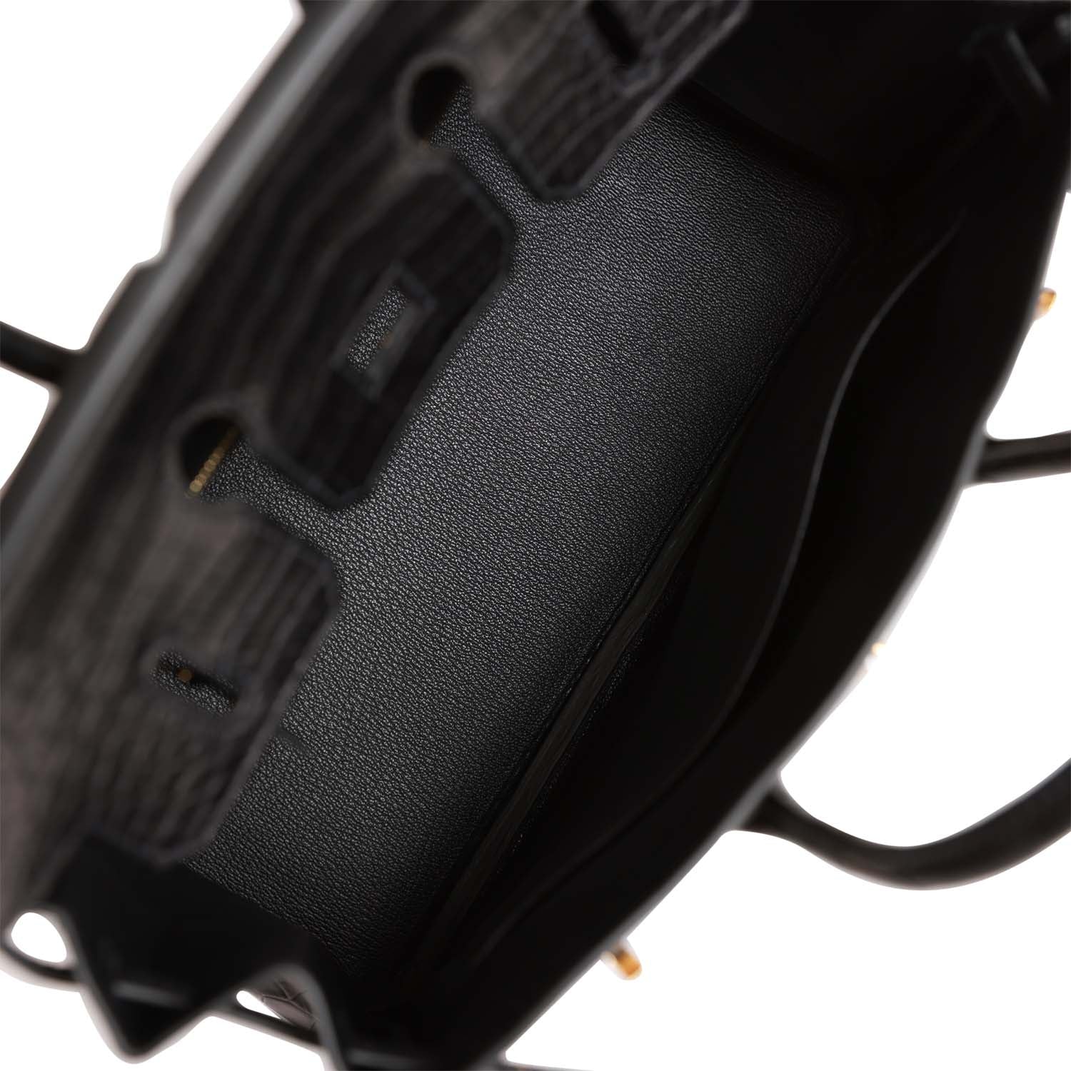 This Birkin is in Black matte porosus crocodile leather with gold hardware and has tonal stitching, front strap, two straps with center toggle closure, clochette with lock and two keys and double rolled handles.