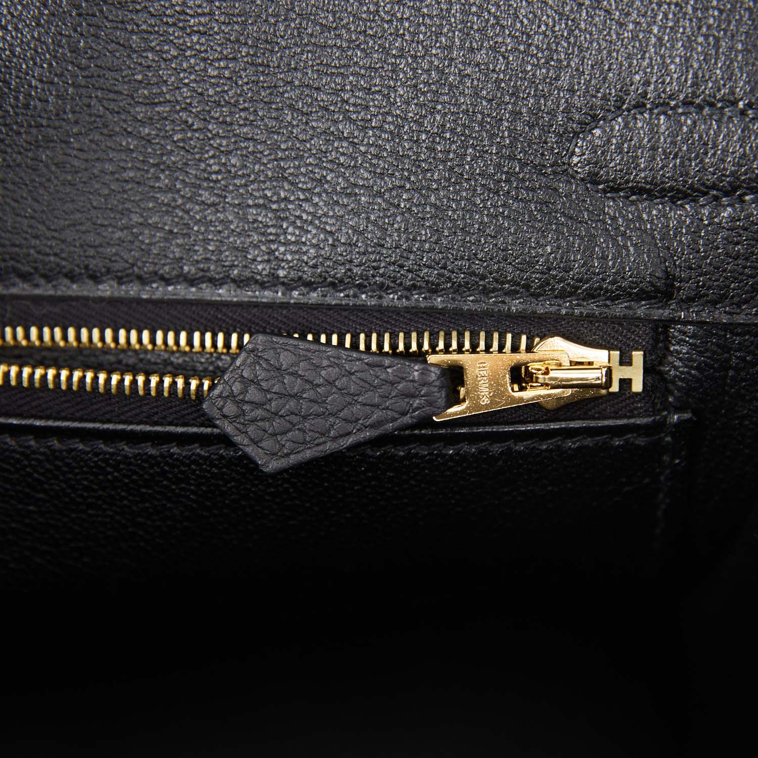 The interior is lined with black chevre and has a zip pocket with an Hermes engraved zipper pull and an open pocket on the opposite side.