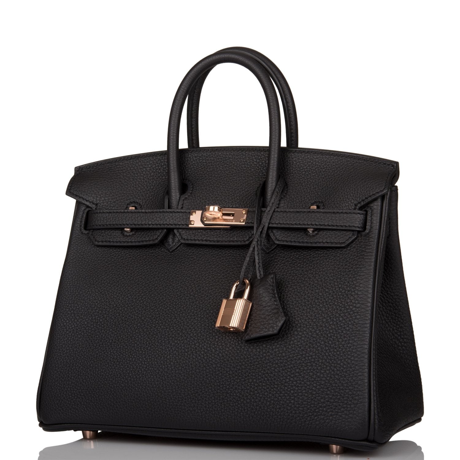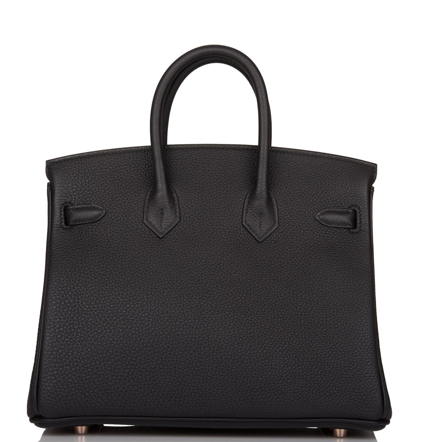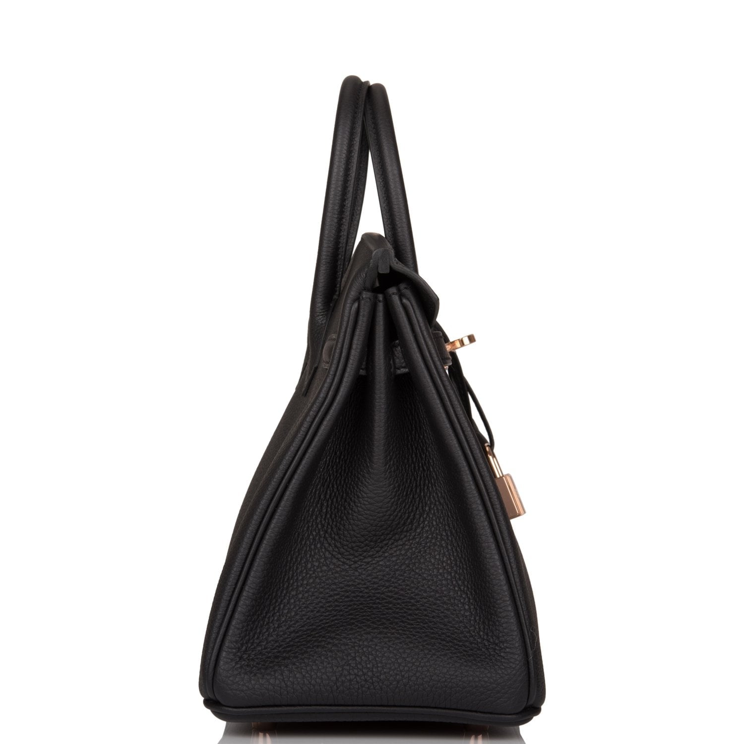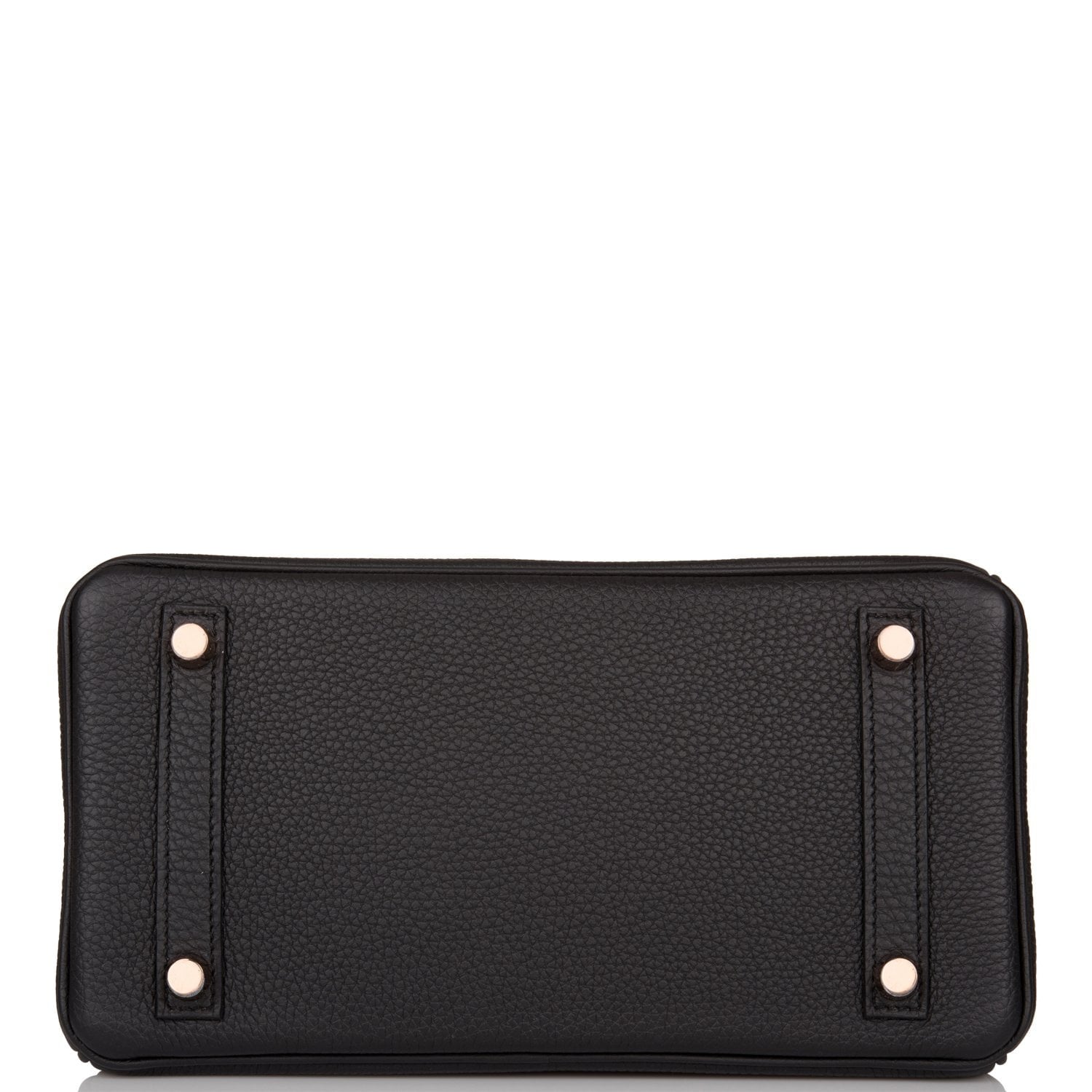 This Birkin is in Black togo leather with rose gold hardware and has tonal stitching, front flap, two straps with center toggle closure, clochette with lock and two keys, and double rolled handles.