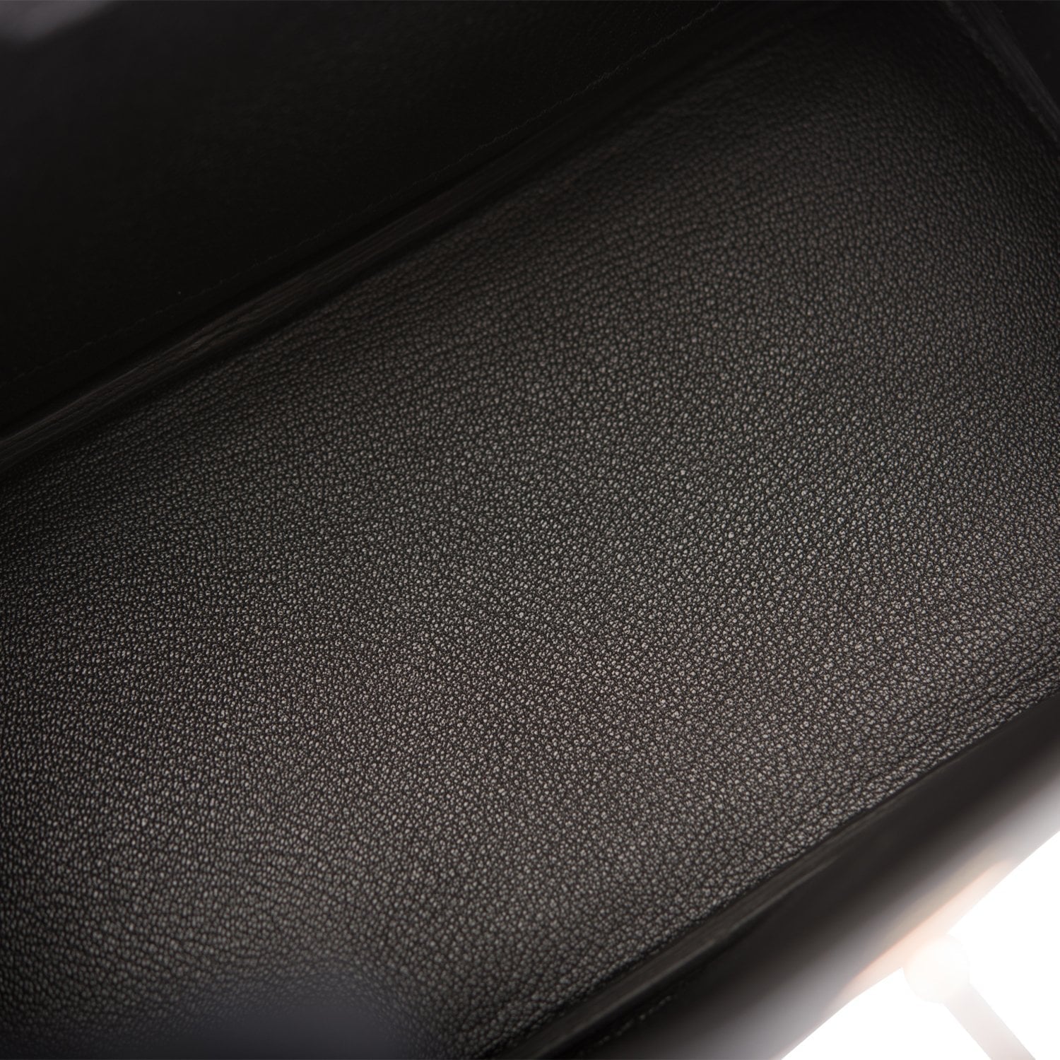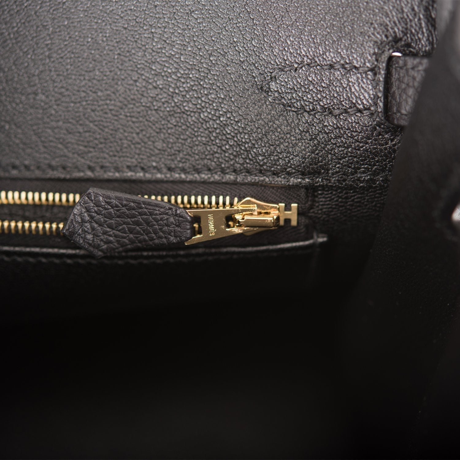 The interior is lined with black chevre and has a zip pocket with an Hermes engraved zipper pull and an open pocket on the opposite side.