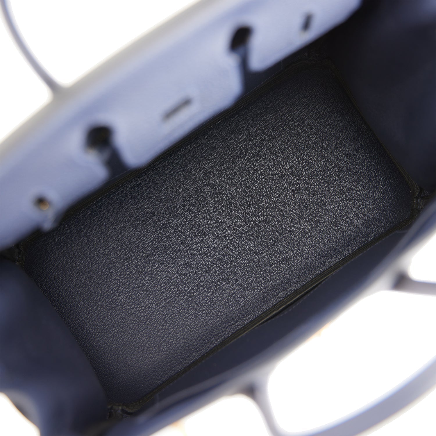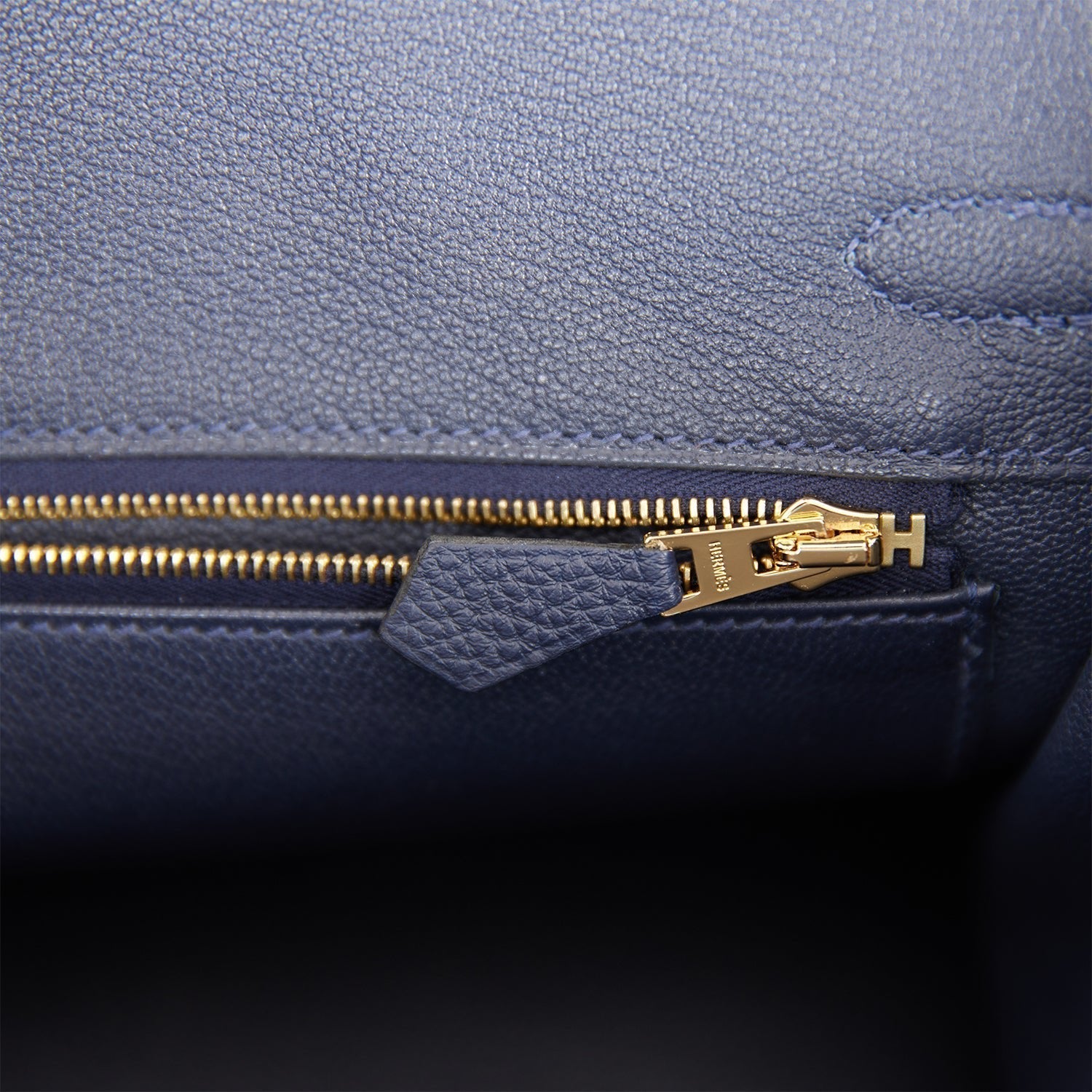 The interior is lined with Bleu Nuit chevre and has a zip pocket with an Hermes engraved zipper pull and an open pocket on the opposite side.