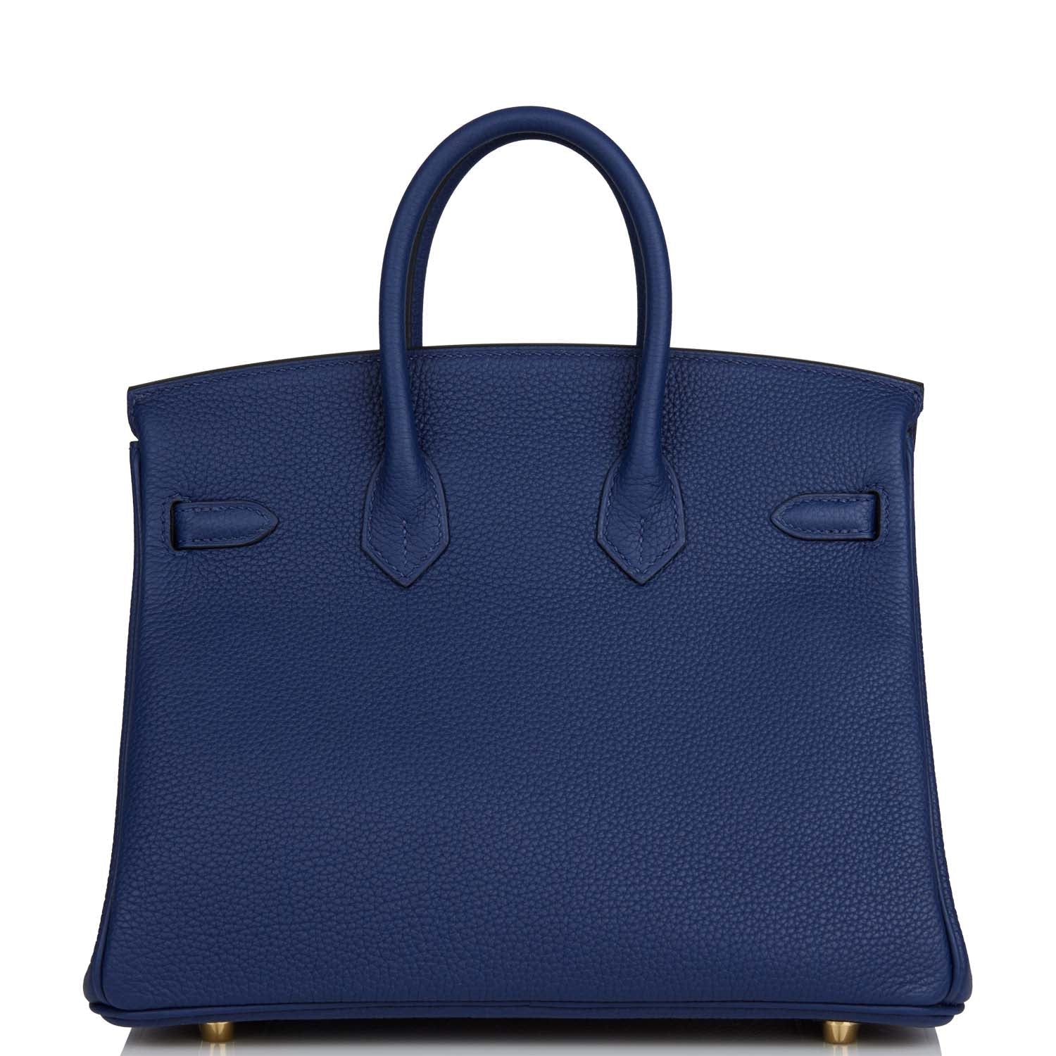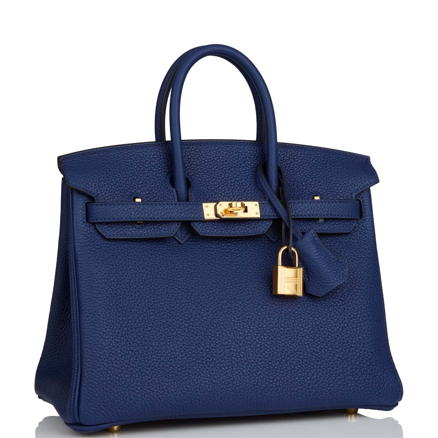 This Birkin is in Bleu Saphir togo leather with gold hardware and has tonal stitching, front flap, two straps with center toggle closure, clochette with lock and two keys, and double rolled handles.