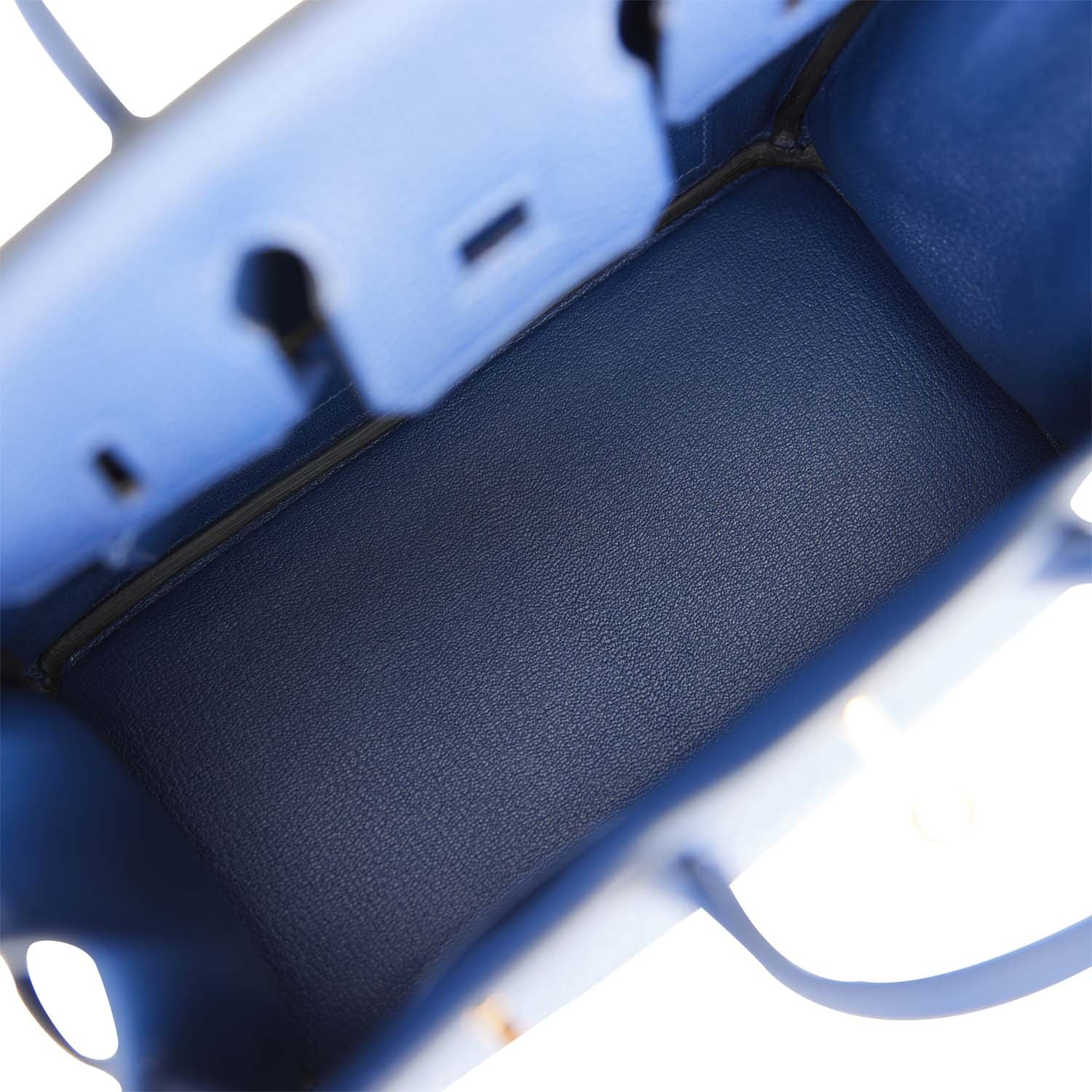 The interior is lined with Bleu Saphir chevre and has a zip pocket with an Hermes engraved zipper pull and an open pocket on the opposite side.
