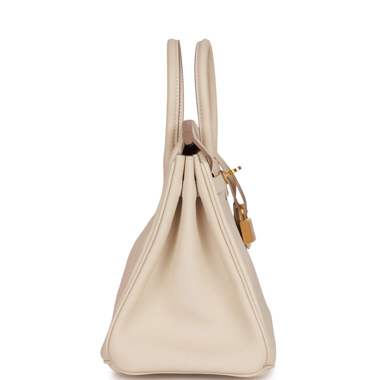 This Birkin is of Craie swift with gold hardware and features tonal stitching, front flap, two straps with center toggle closure, clochette with lock and two keys, and double rolled handles.