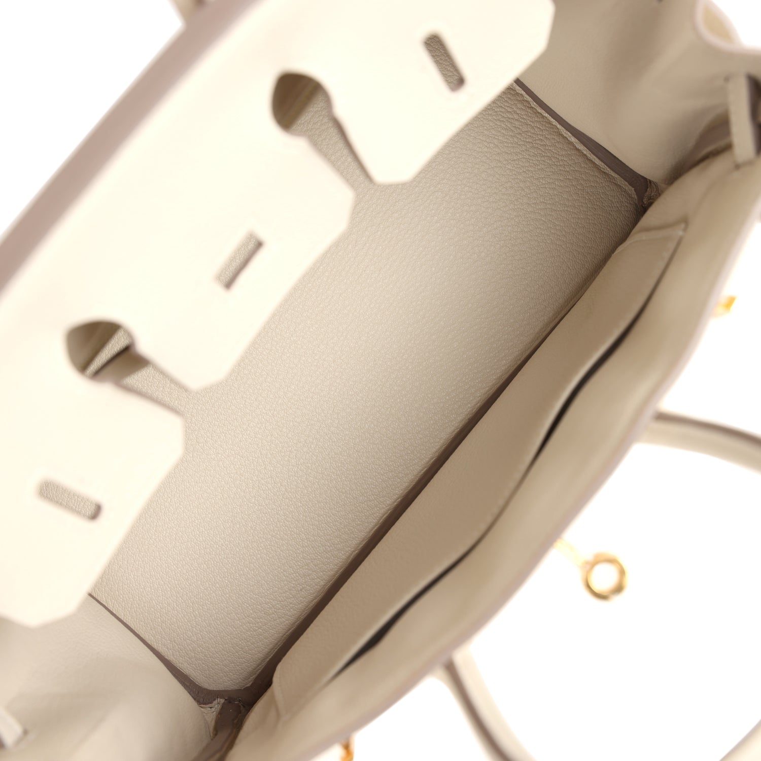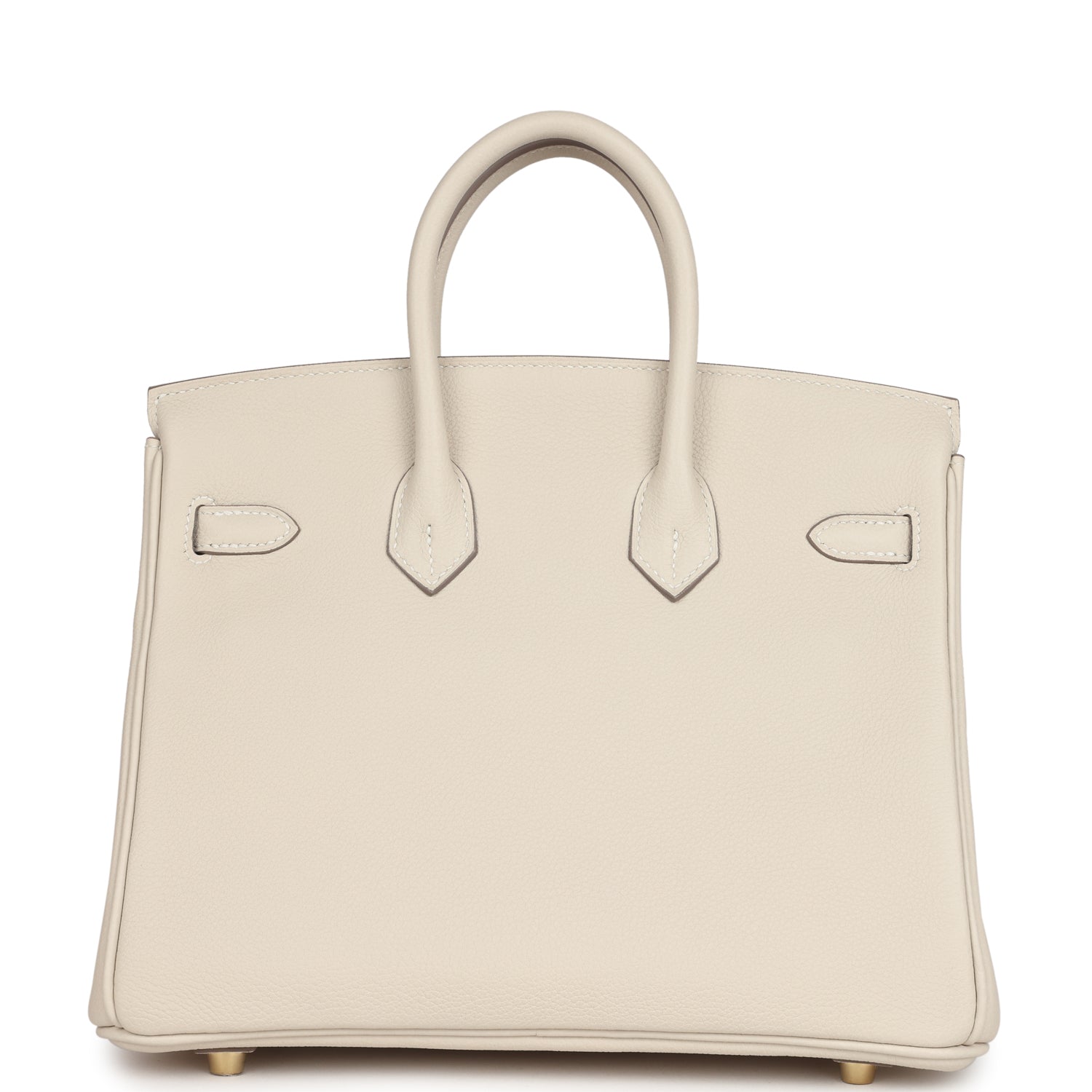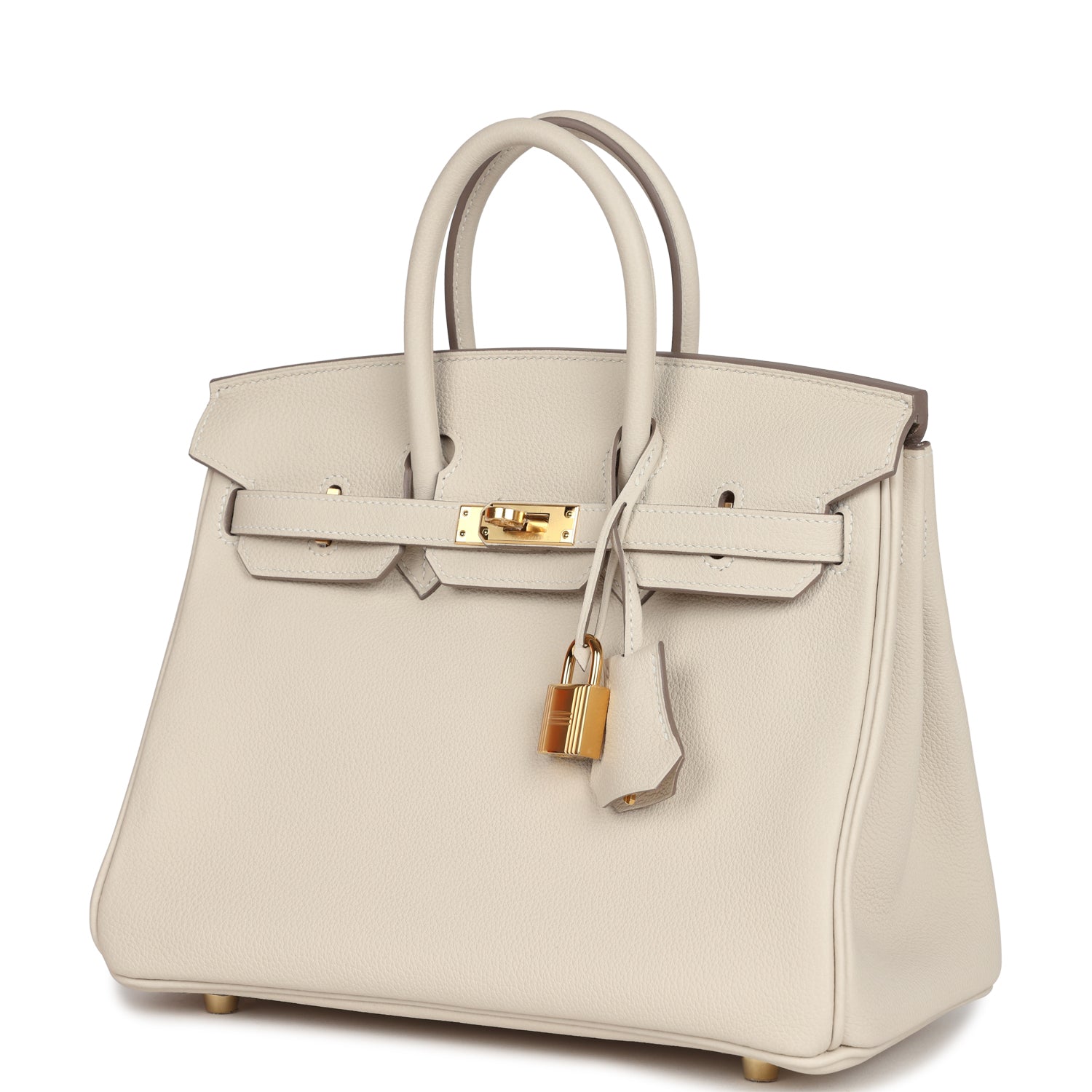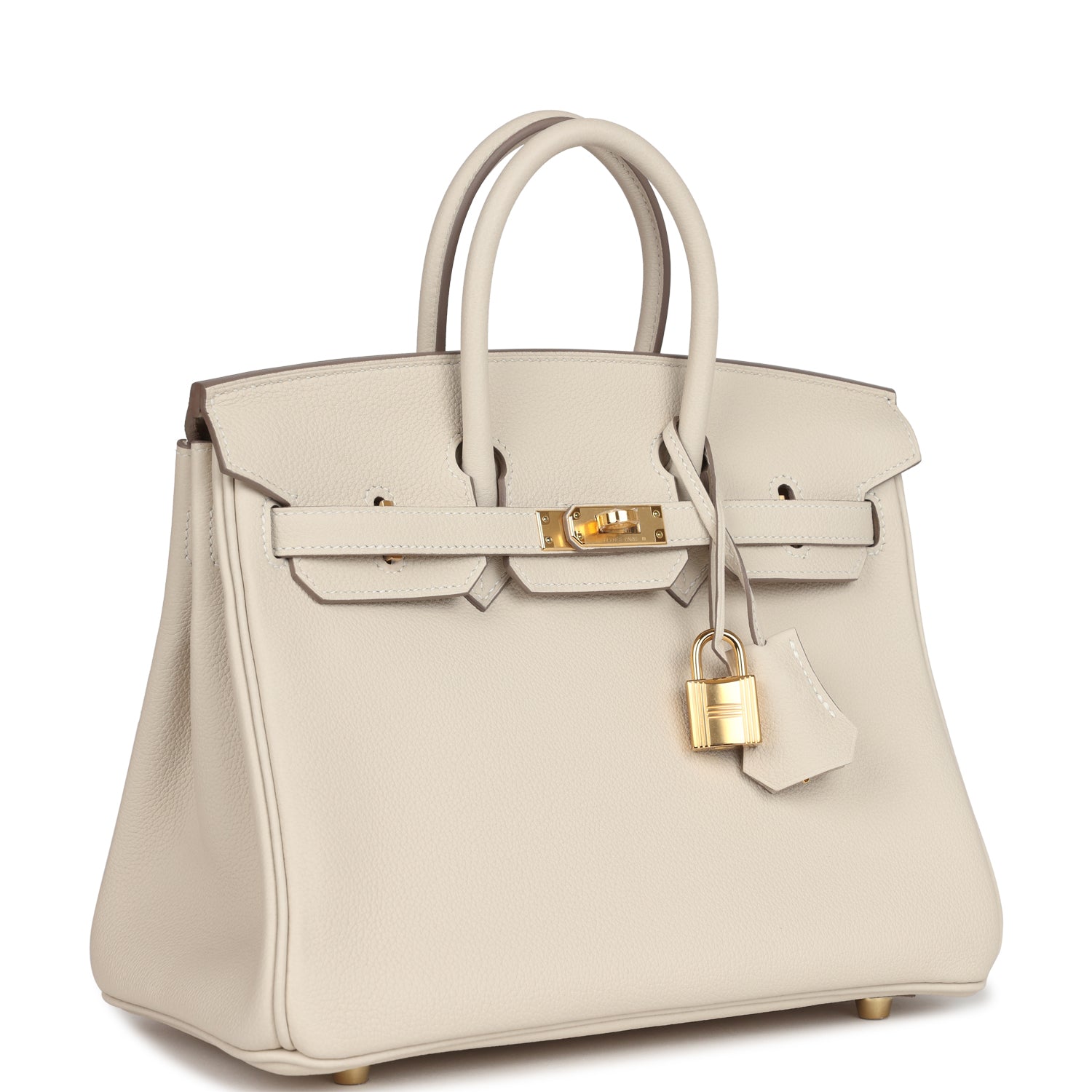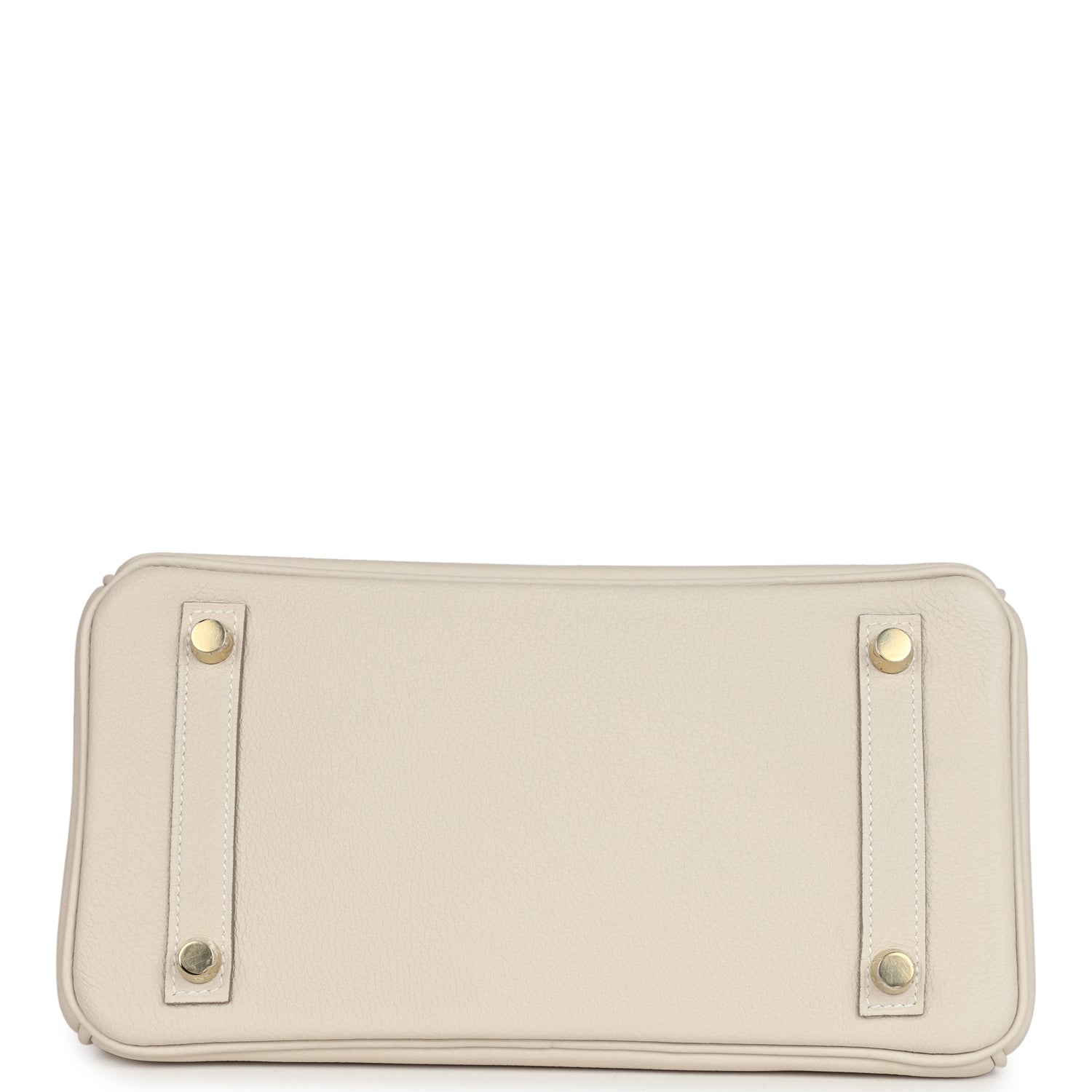 Birkin is in Craie Taurillon Novillo leather with gold hardware, has tonal stitching, front flap, two straps with center toggle closure, clochette with lock and two keys, and double rolled handles.