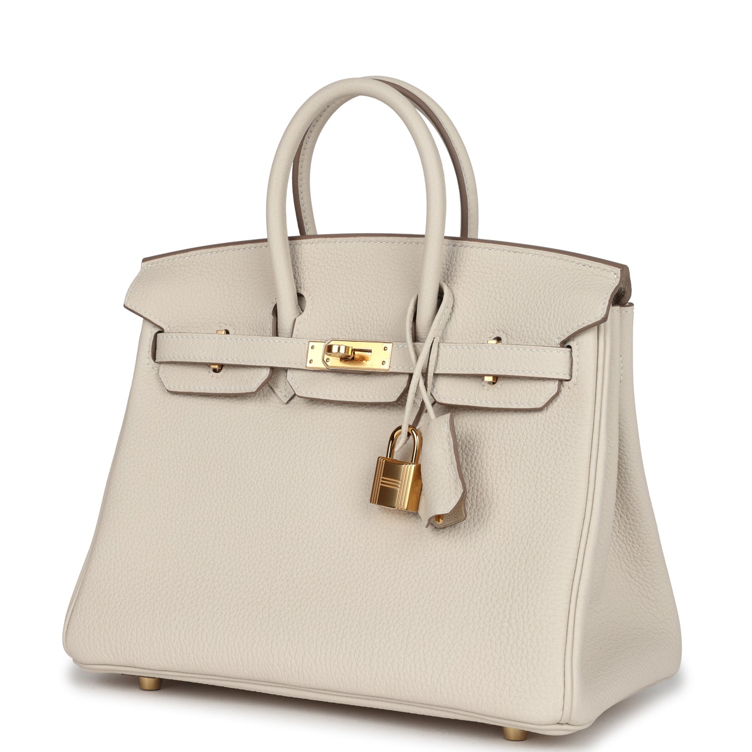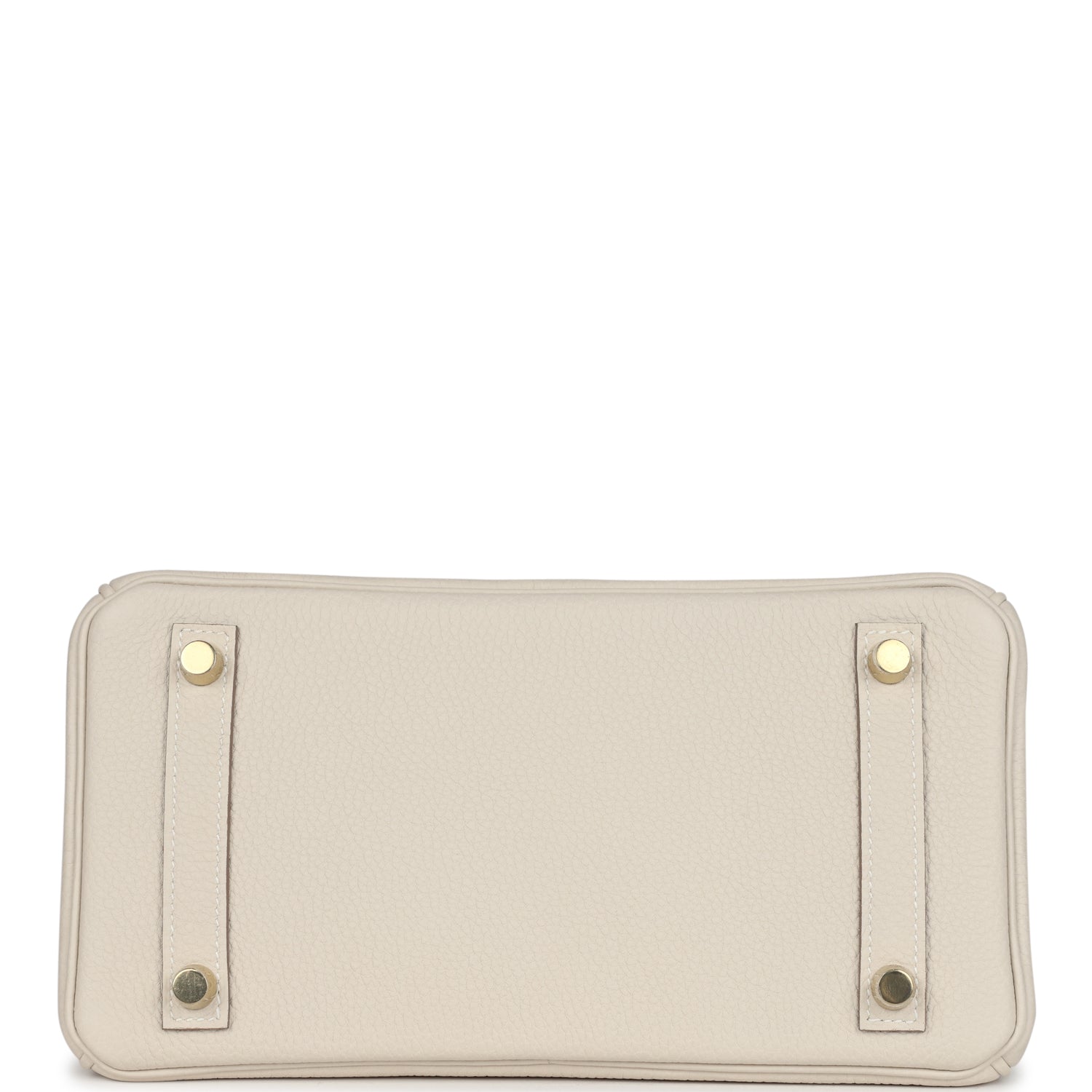 Birkin is in Craie togo leather with gold hardware and has tonal stitching, two straps with front toggle closure, clochette with lock and two keys and double rolled handles.