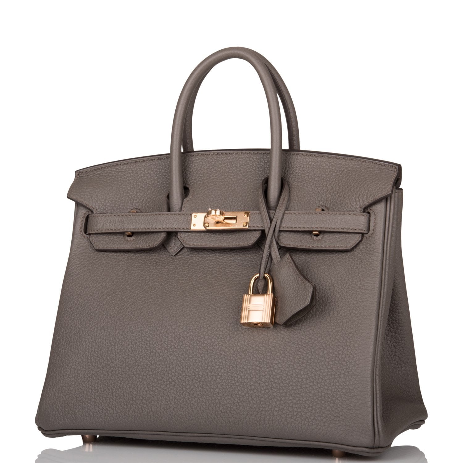 This Birkin is in Etain togo leather with rose gold hardware and has tonal stitching, two straps with front toggle closure, clochette with lock and two keys and double rolled handles.