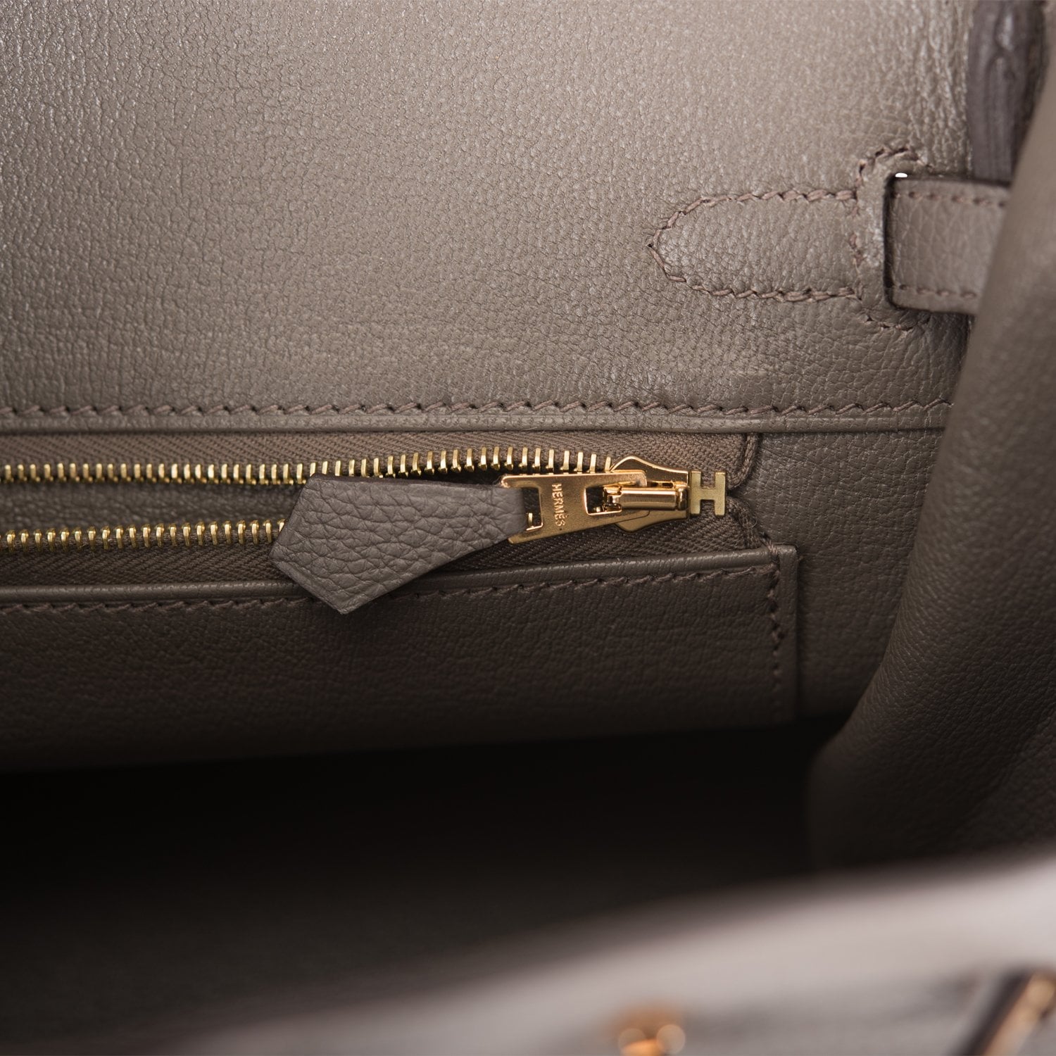 The interior is lined with Etain chevre and has one zip pocket with an Hermes engraved zipper pull and an open pocket on the opposite side.