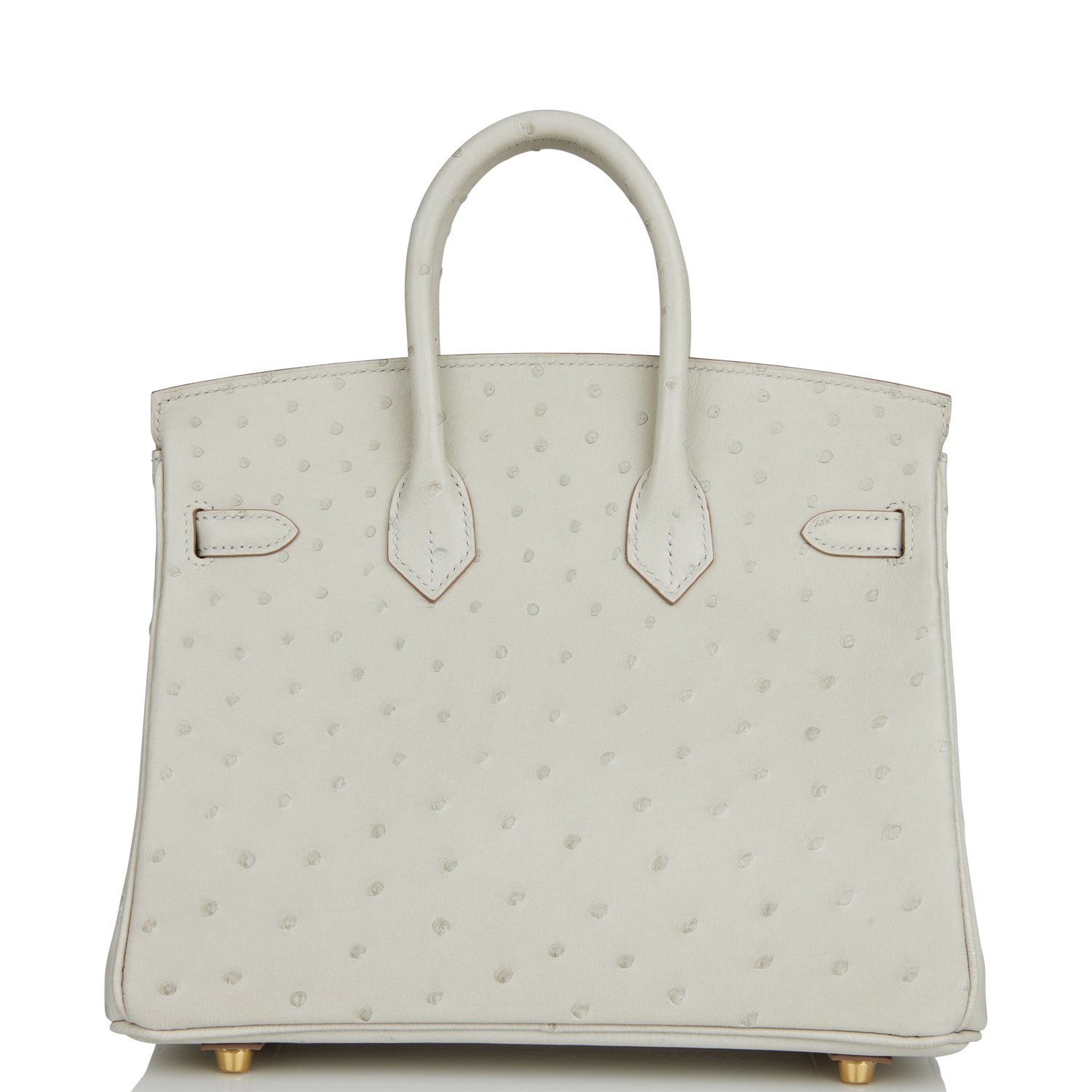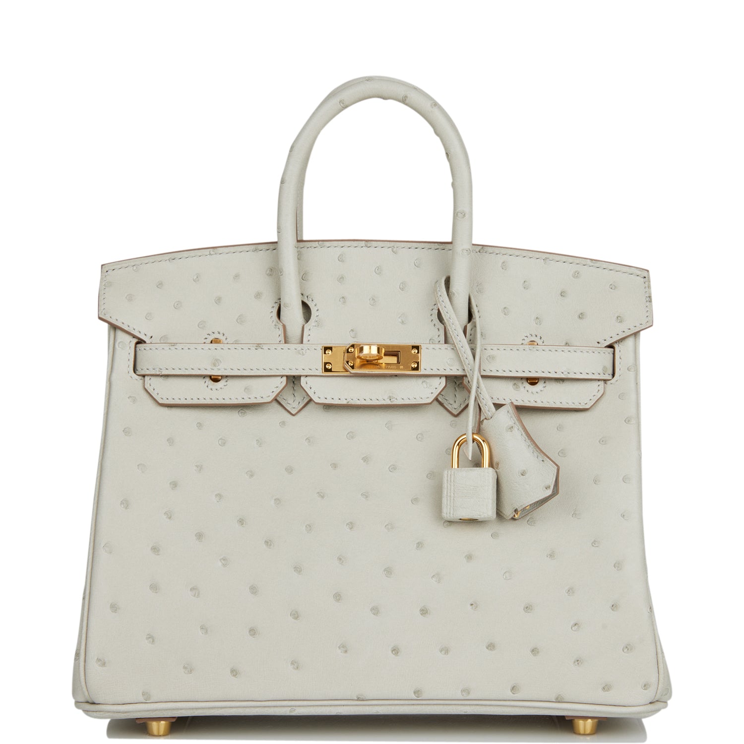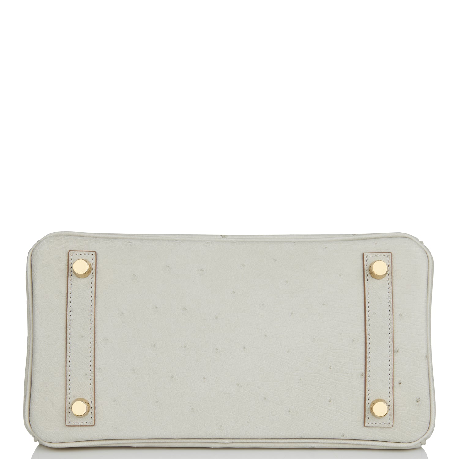 This Birkin is in Gris Perle ostrich with gold hardware and features tonal stitching, front flap, two straps with center toggle closure, clochette with lock and two keys, and double rolled handles.