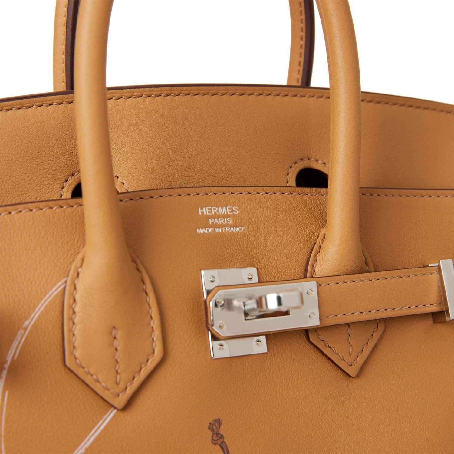 This Limited Edition Birkin is in Biscuit swift leather with palladium hardware and has tonal stitching, front graphics of a rodeo charm, lipstick, pencil, coin purse and other small items found inside a bag, front flap, two straps with center toggle closure, clochette with lock and two keys, and double rolled handles.