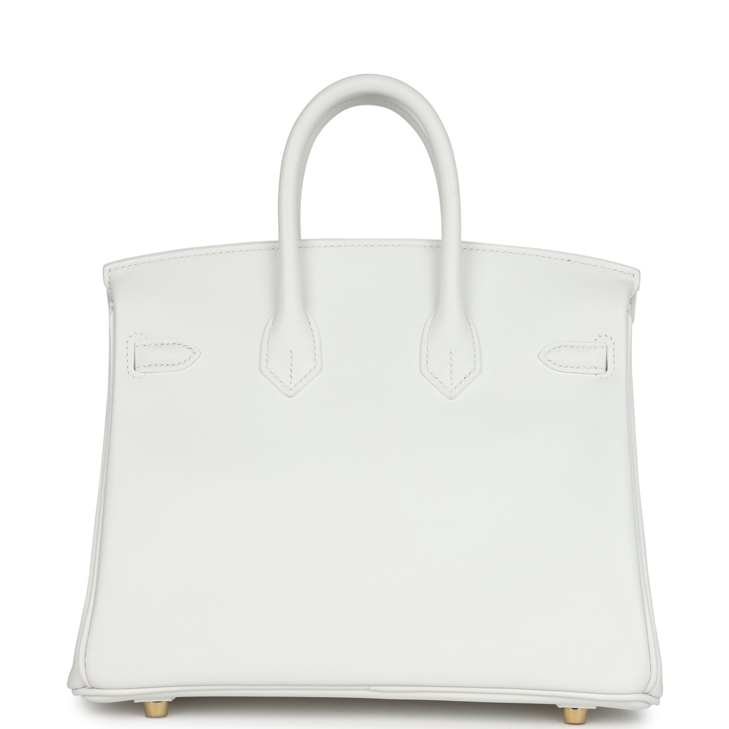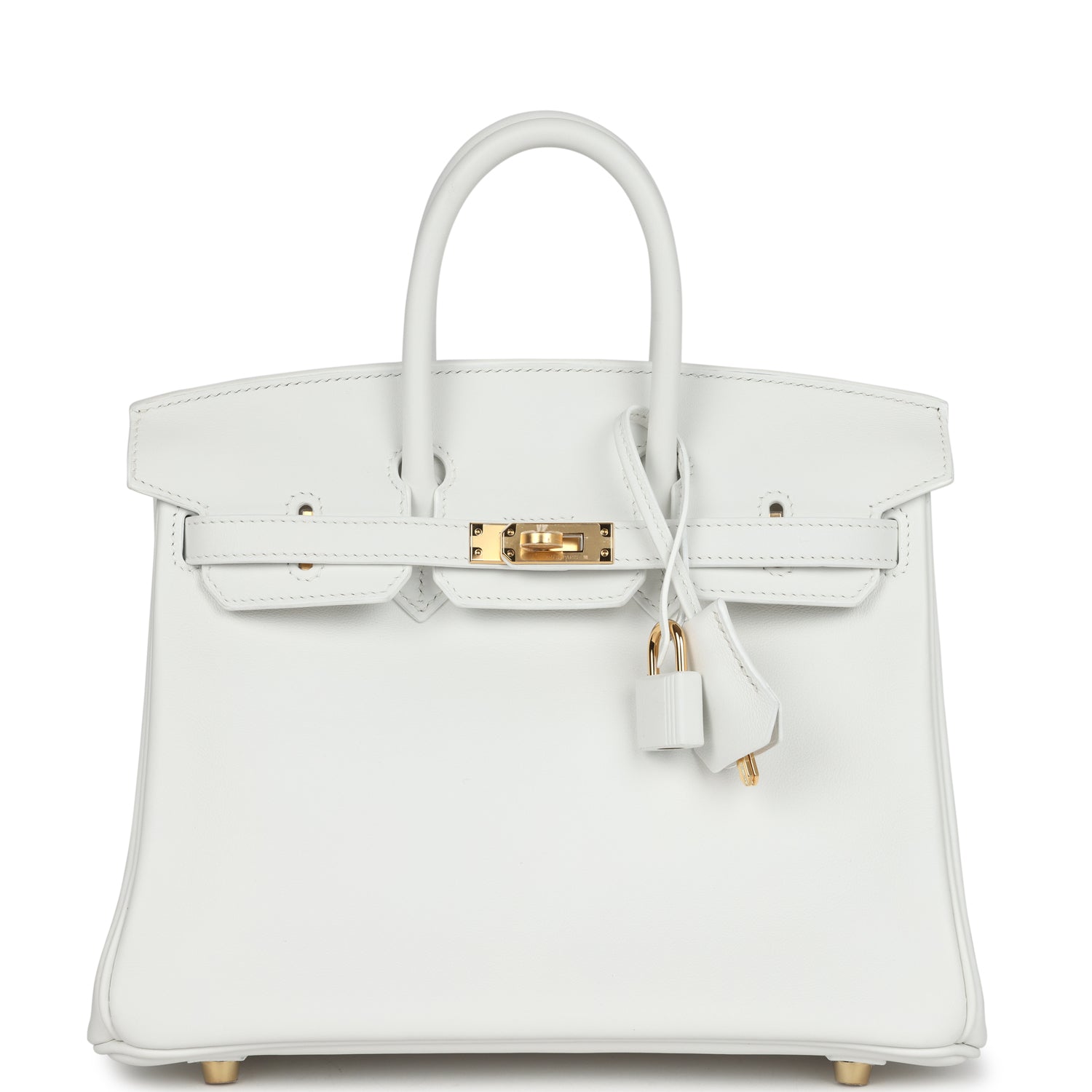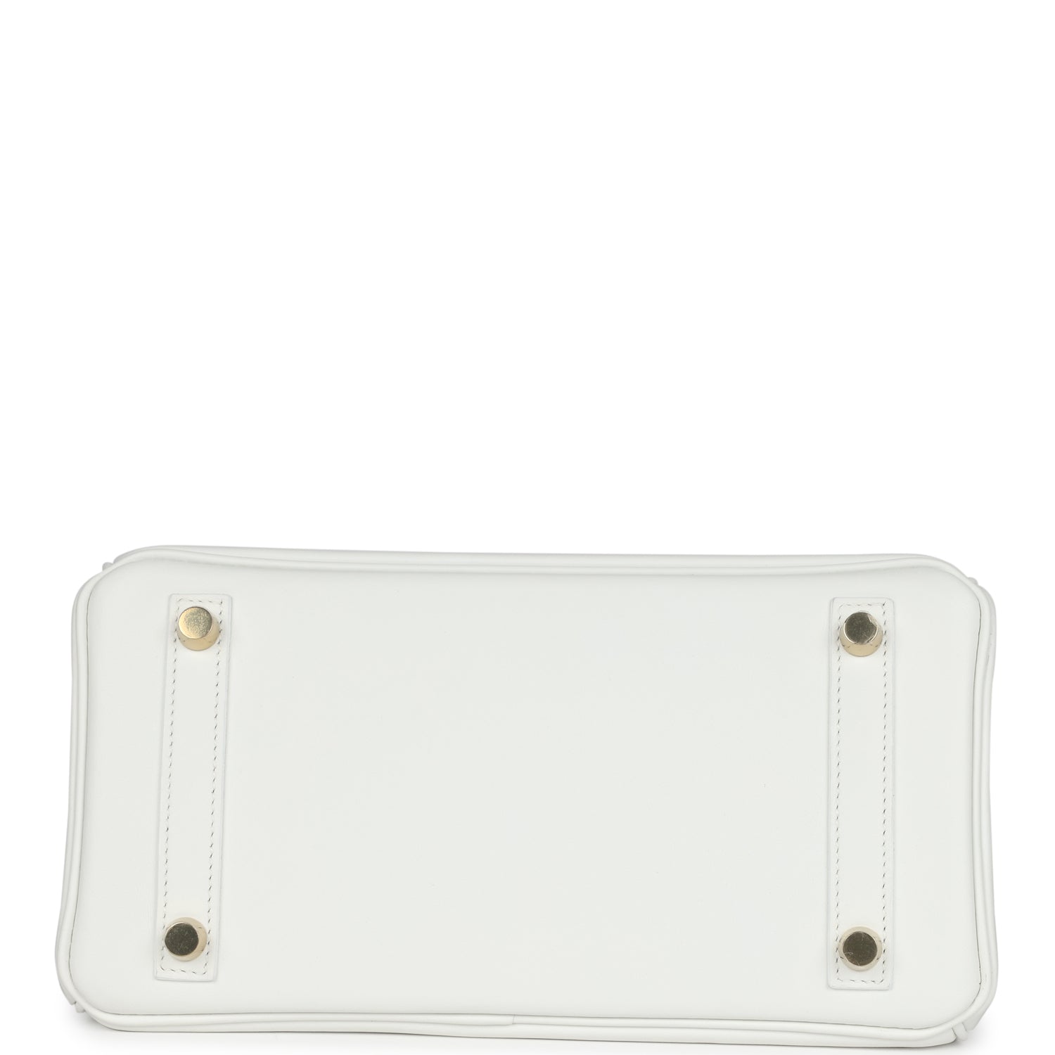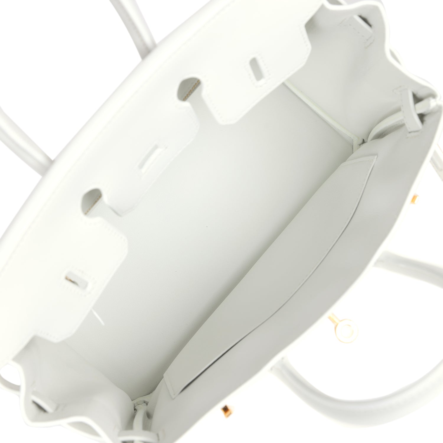 Birkin is of New White Swift leather with gold hardware and features tonal stitching, front flap, two straps with center toggle closure, clochette with lock and two keys, and double rolled handles.