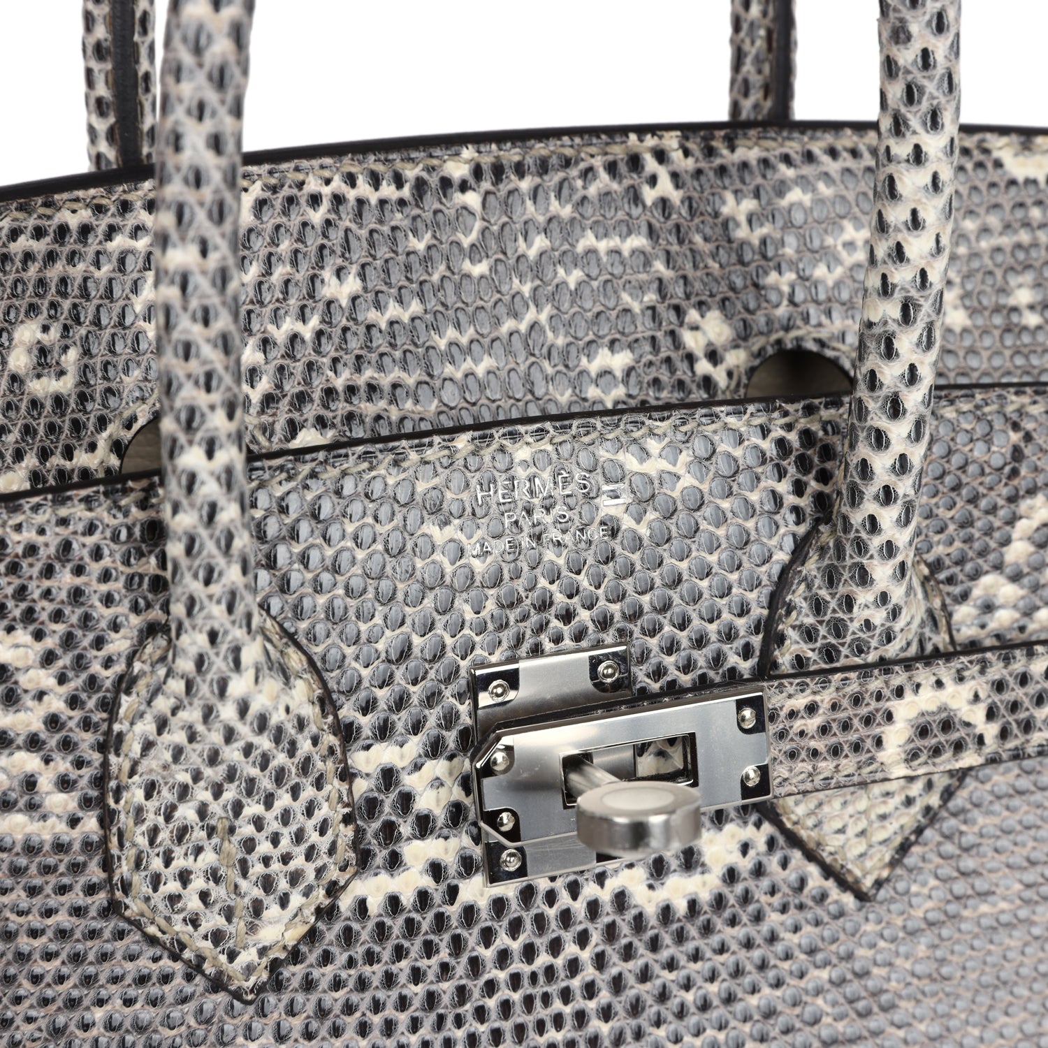 Birkin is in Ombre Varanus Salvator Lizard with palladium hardware and has tonal stitching, front strap, two straps with center toggle closure, clochette with lock and two keys and double rolled handles.