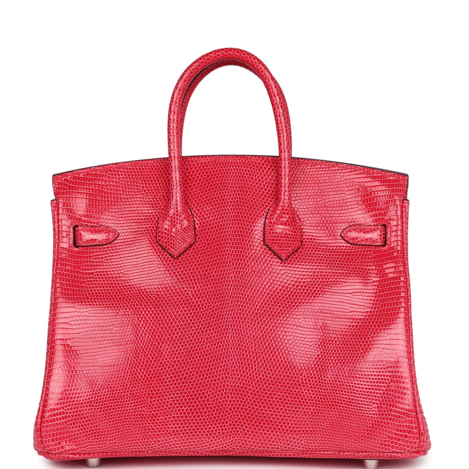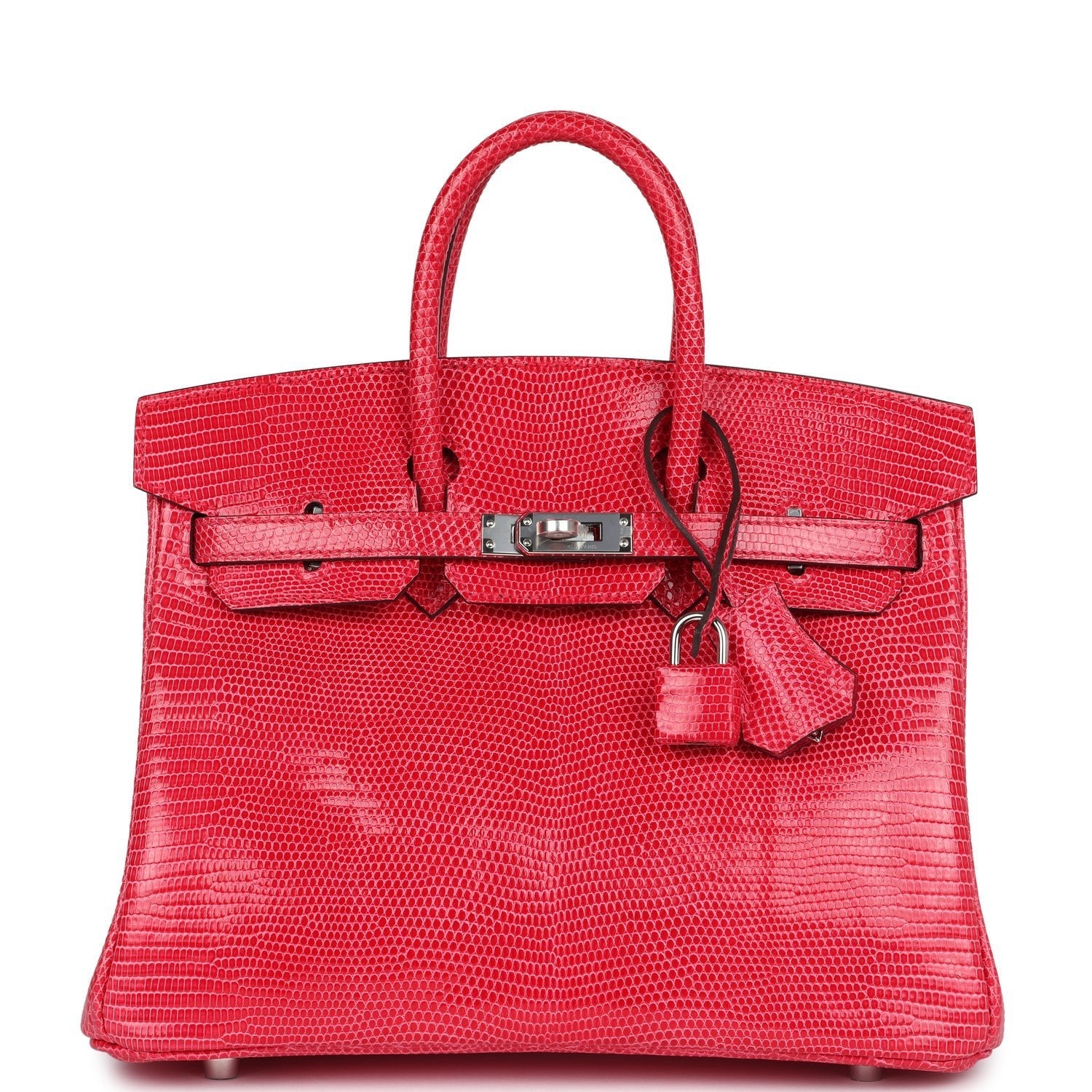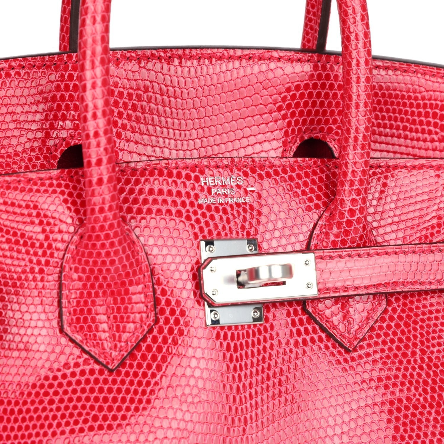 Birkin is in Rose Extreme Varanus Niloticus Lizard leather with palladium hardware and has tonal stitching, front strap, two straps with center toggle closure, clochette with lock and two keys and double rolled handles.