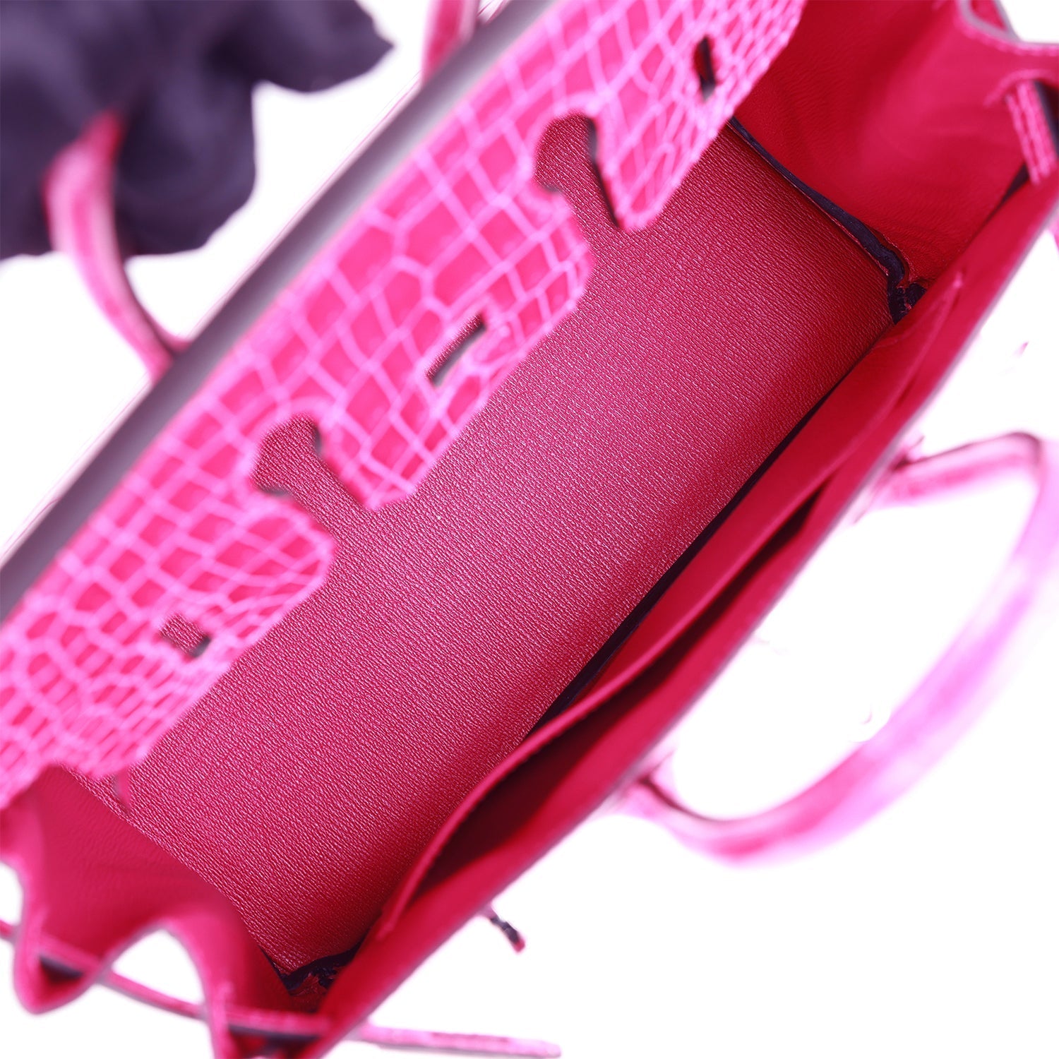 This Birkin is in Rose Mexico shiny Porosus crocodile leather with palladium hardware and has tonal stitching, front strap, two straps with center toggle closure, clochette with lock and two keys and double rolled handles.