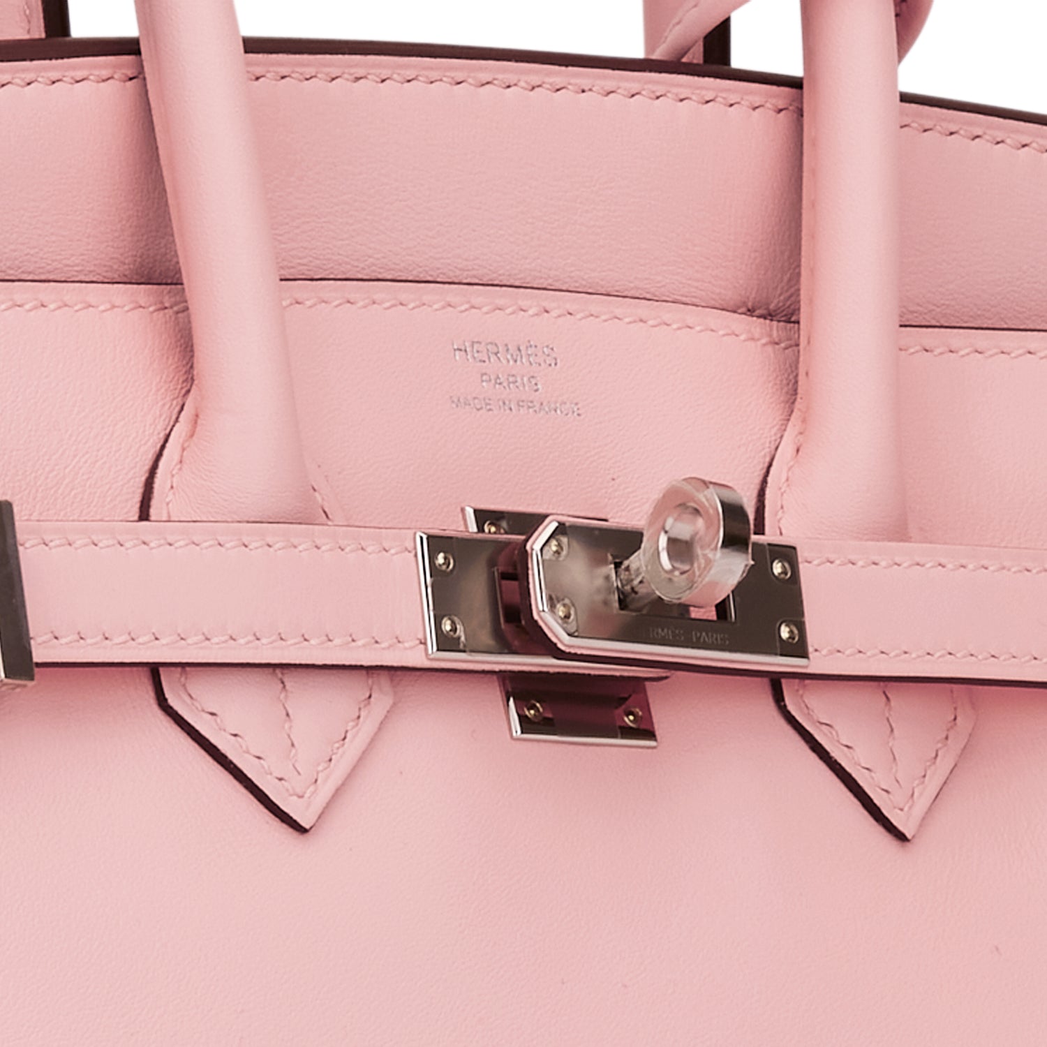 This Birkin is of Rose Sakura Jonathan leather with palladium hardware and features tonal stitching, front flap, two straps with center toggle closure, clochette with lock and two keys, and double rolled handles.