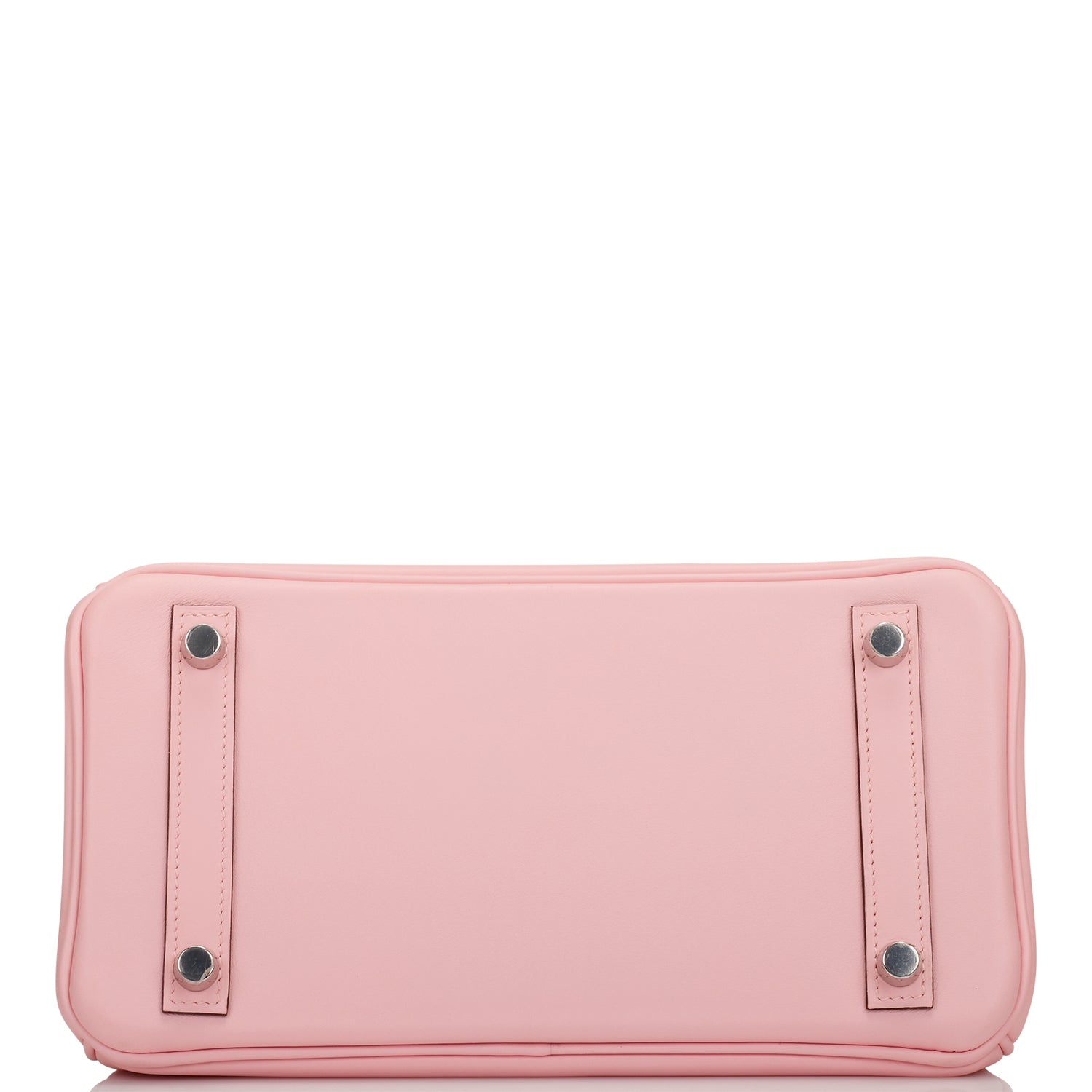 This Birkin is of Rose Sakura Jonathan leather with palladium hardware and features tonal stitching, front flap, two straps with center toggle closure, clochette with lock and two keys, and double rolled handles.