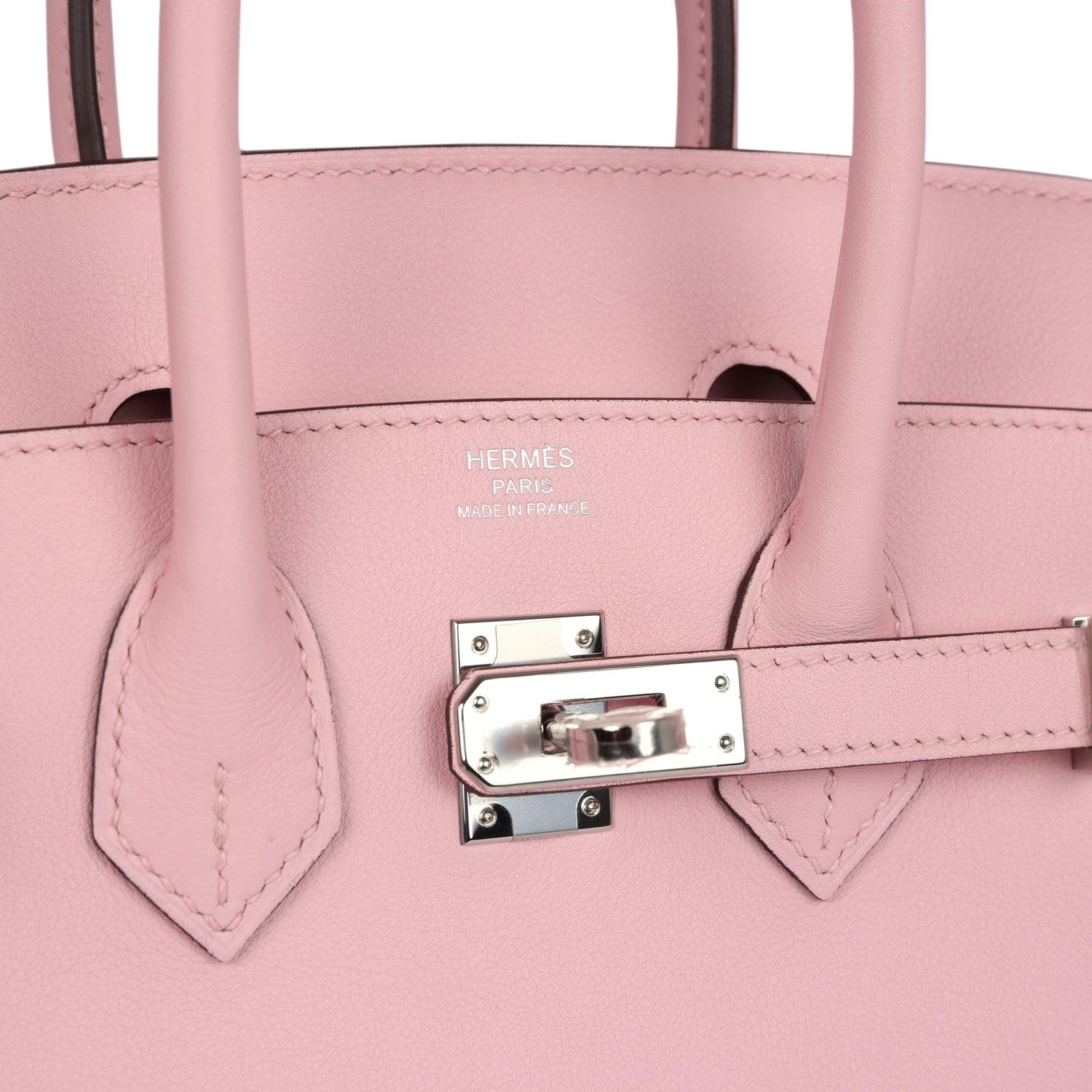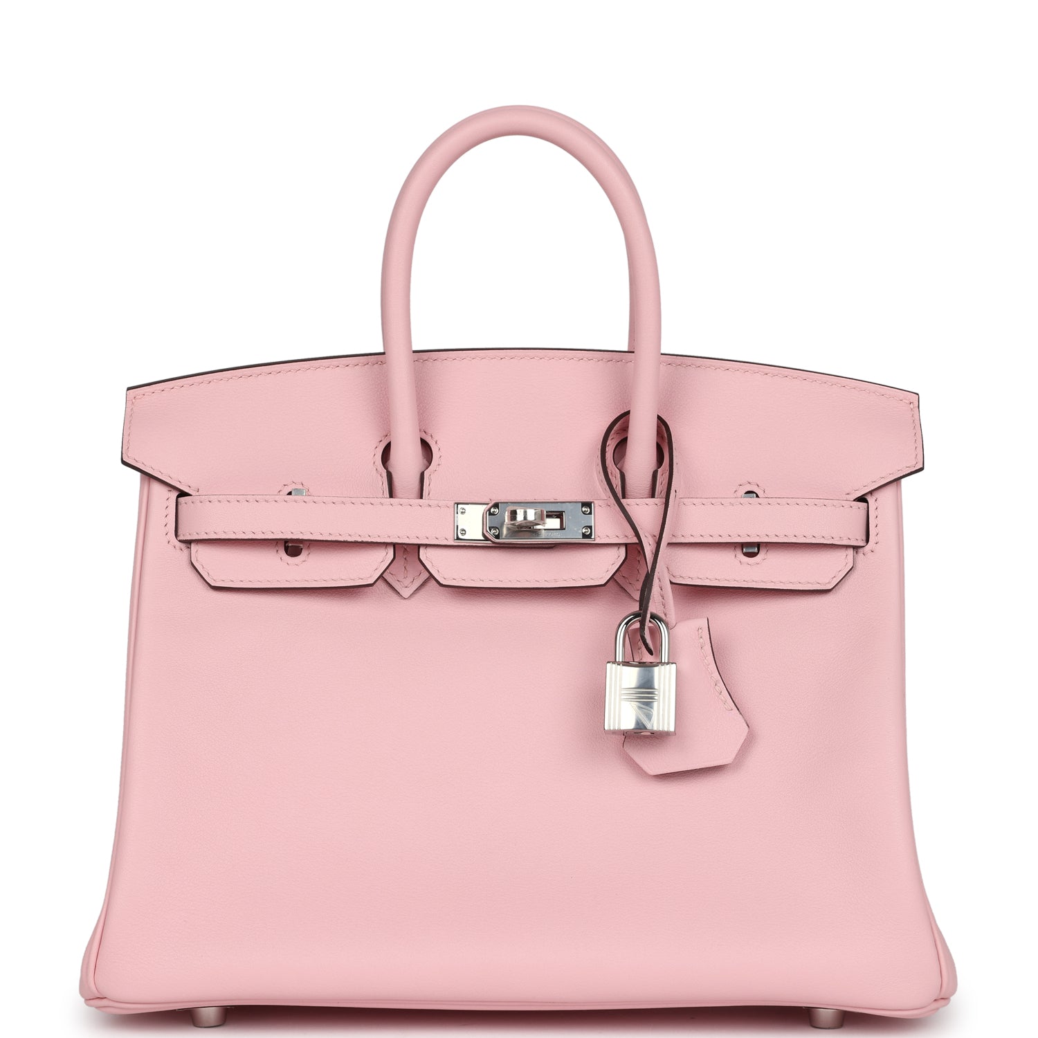 Birkin is in Rose Sakura swift leather with palladium hardware and features tonal stitching, front flap, two straps with center toggle closure, clochette with lock and two keys, and double rolled handles.