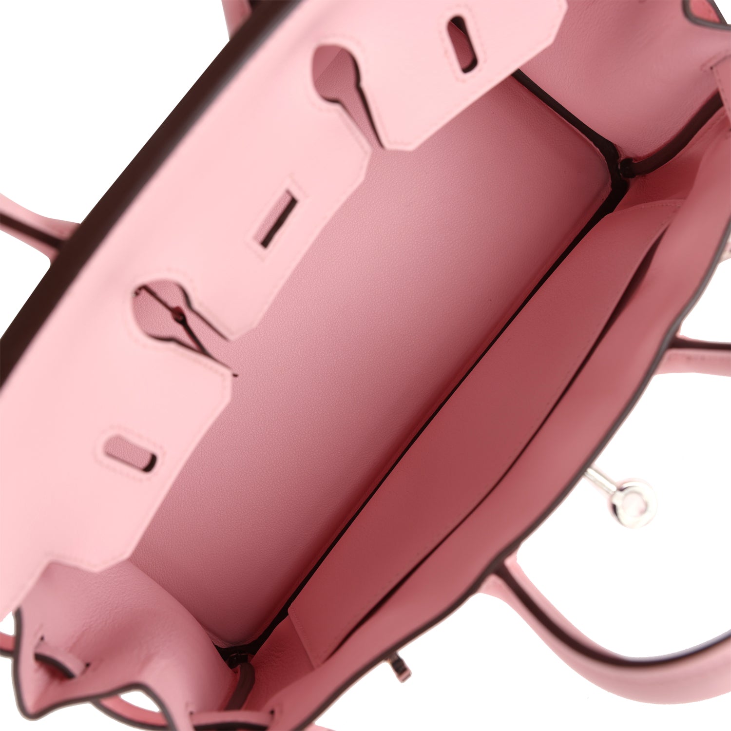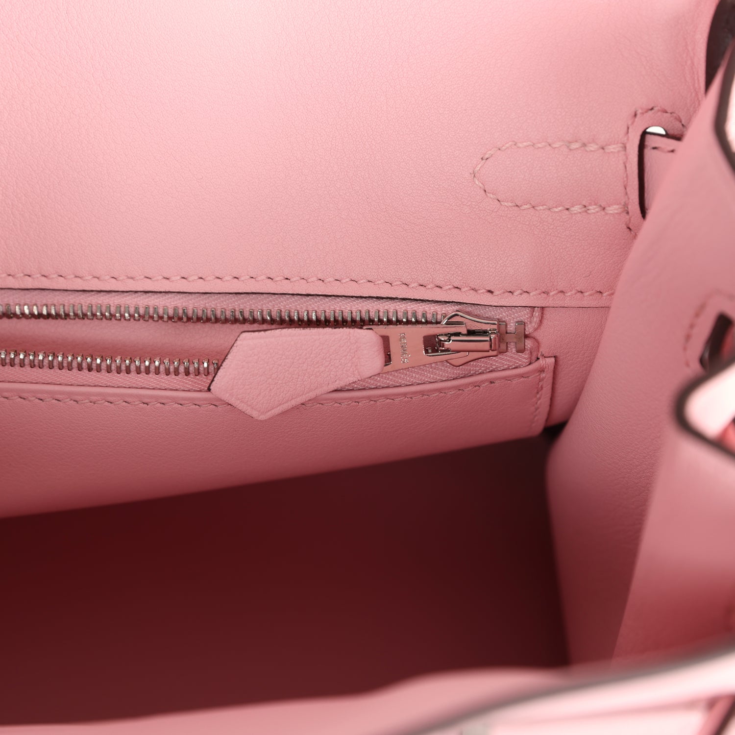 The interior is lined with Rose Sakura swift leather and has one zip pocket with an Hermes engraved zipper pull and an open pocket on the opposite side.