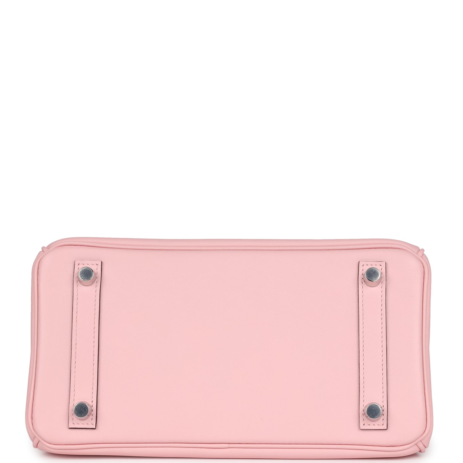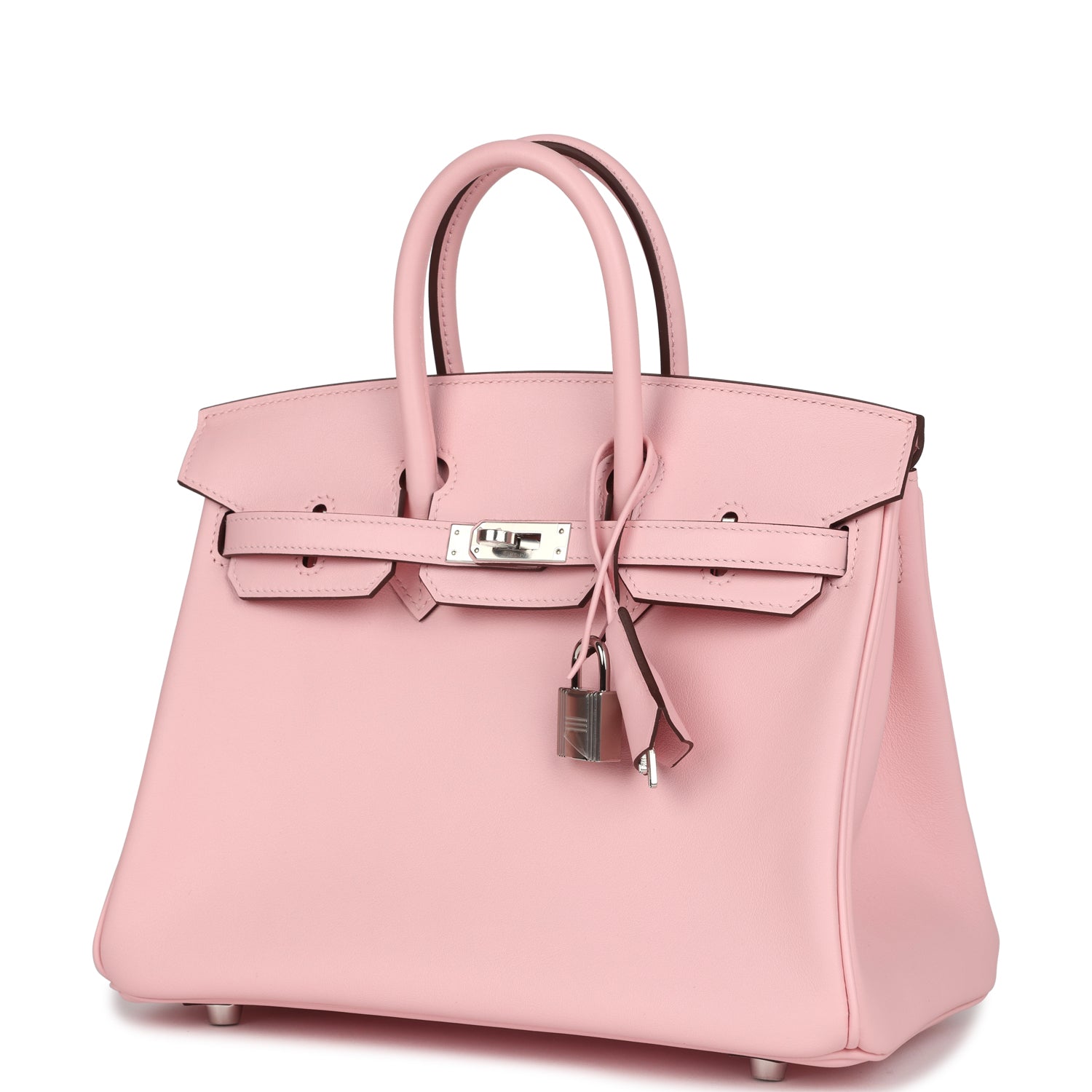 Birkin is in Rose Sakura swift leather with palladium hardware and features tonal stitching, front flap, two straps with center toggle closure, clochette with lock and two keys, and double rolled handles.