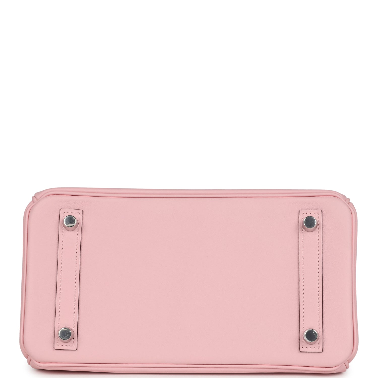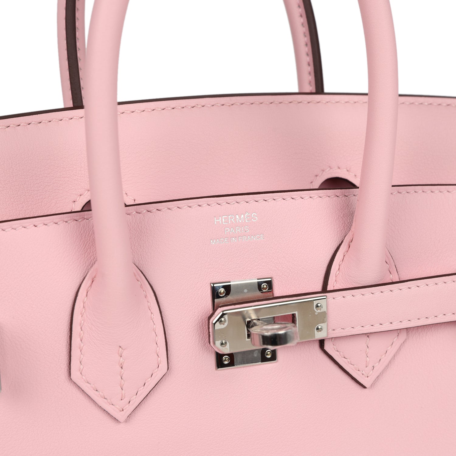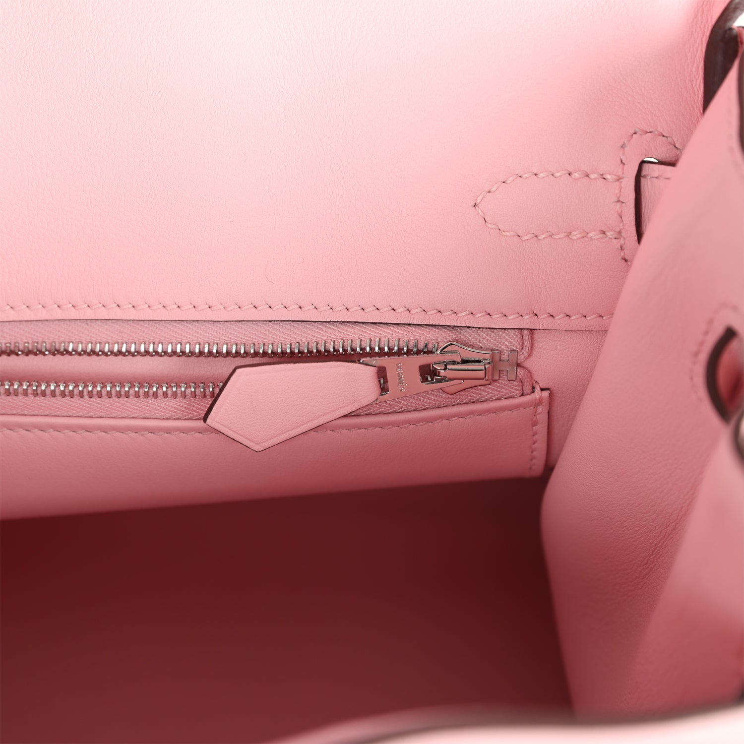 Birkin is in Rose Sakura swift leather with palladium hardware and features tonal stitching, front flap, two straps with center toggle closure, clochette with lock and two keys, and double rolled handles.