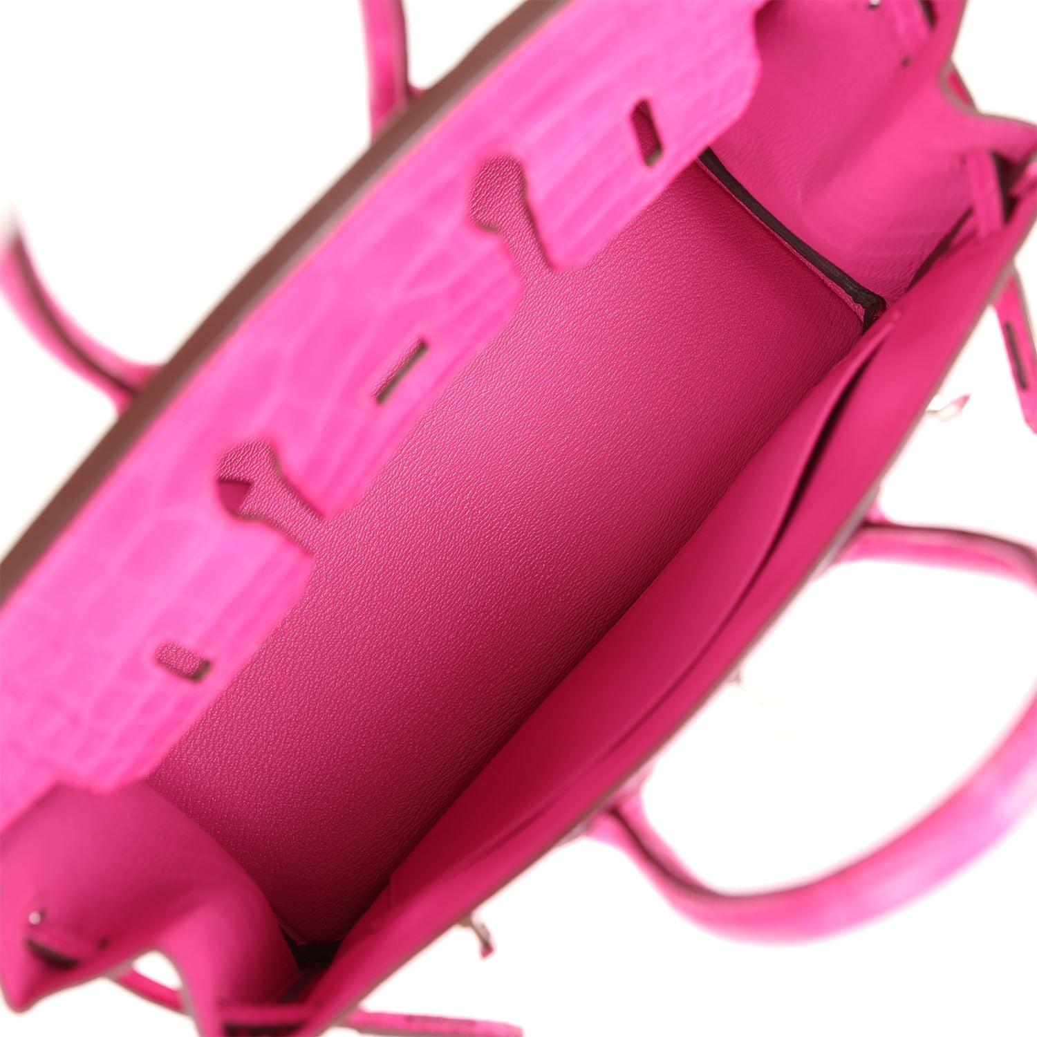 Birkin 25 is in Rose Shocking Matte Alligator Mississippiensis leather with Palladium Hardware, tonal stitching, front flap with two straps, front toggle closure, clochette with lock and two keys and double rolled handles.