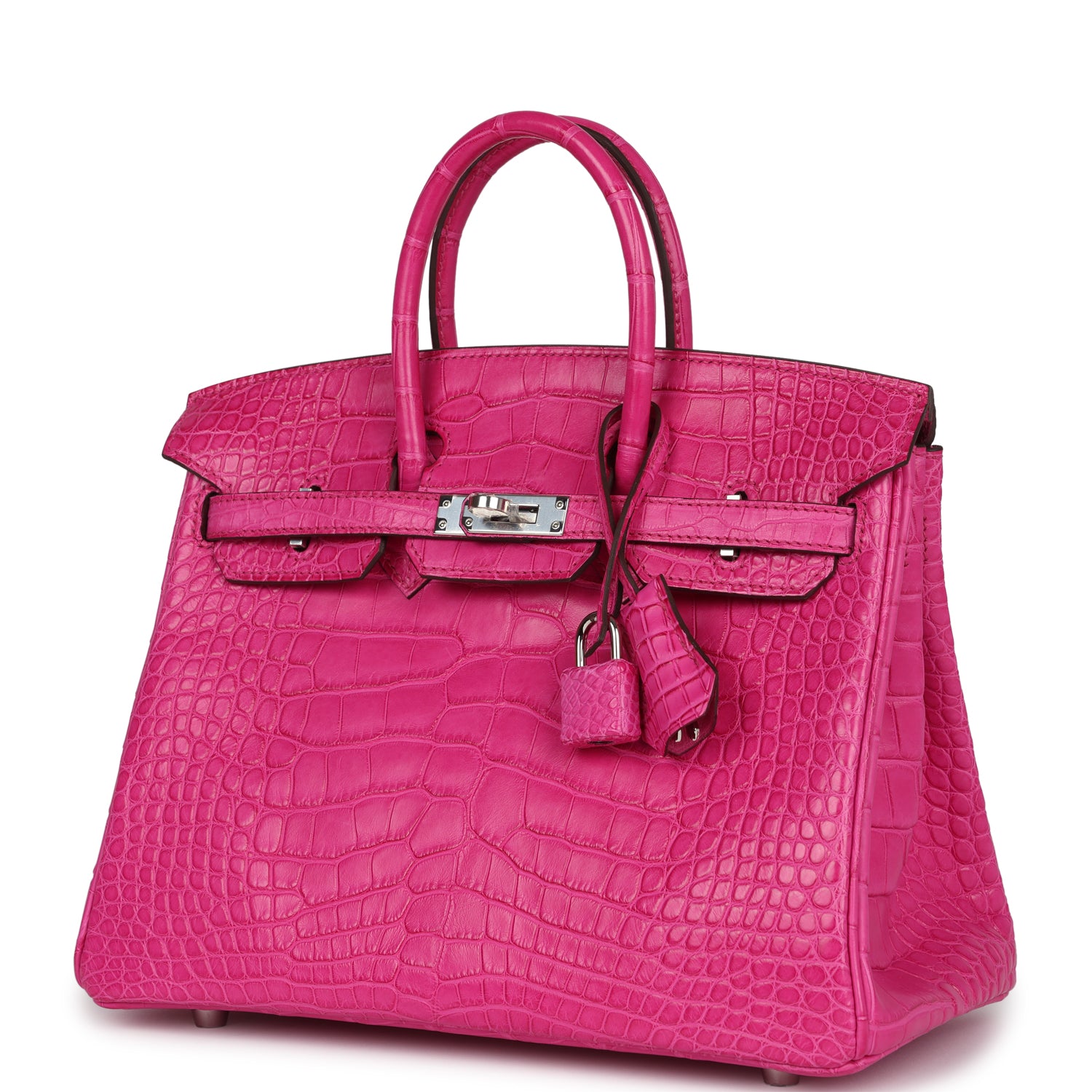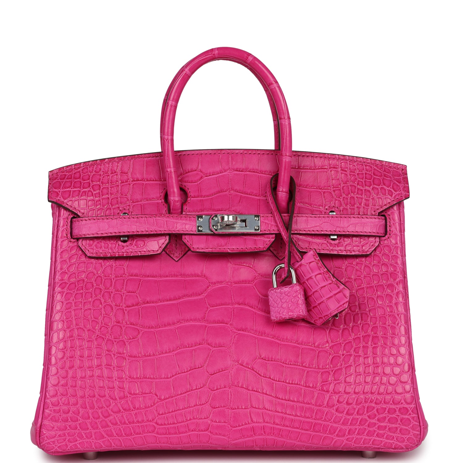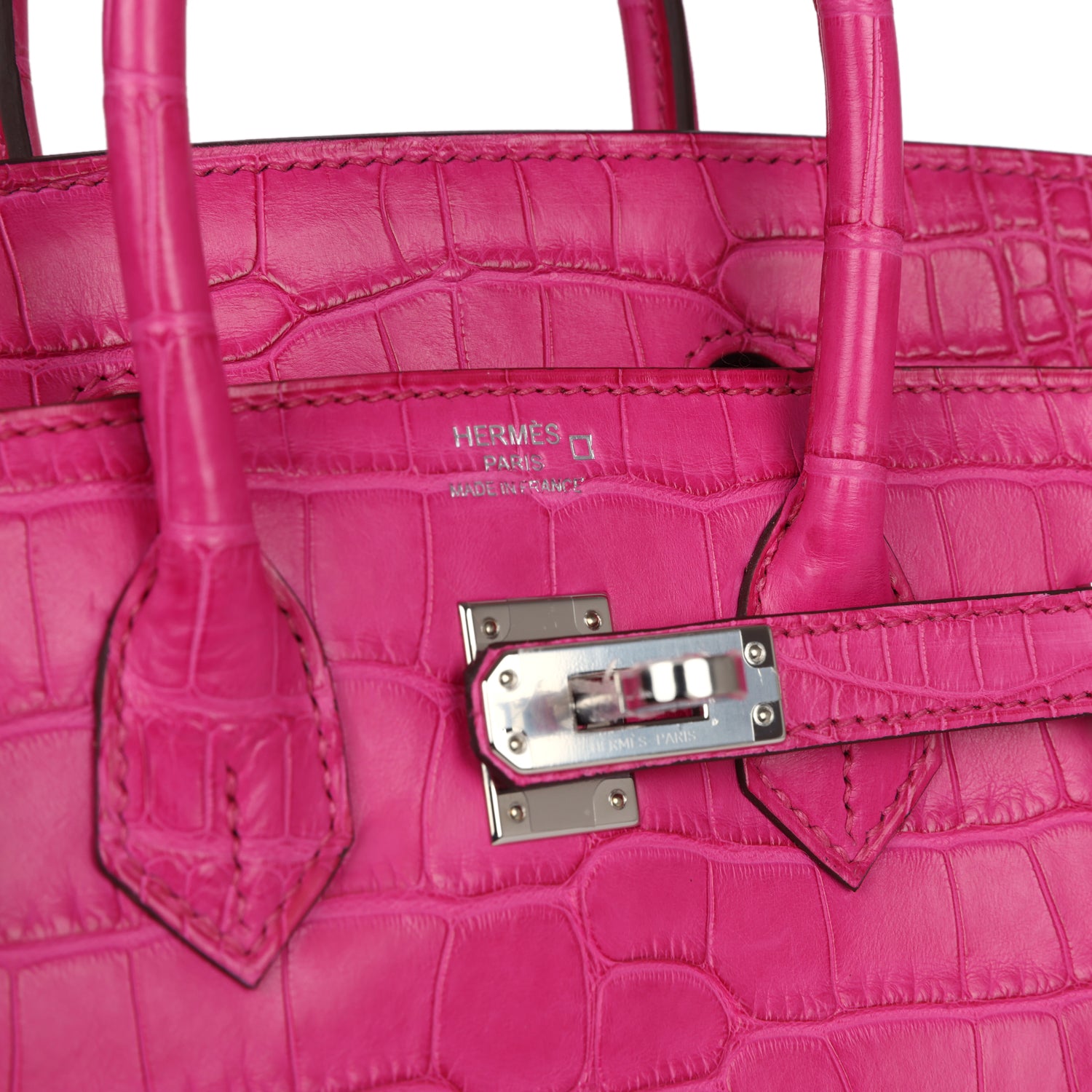 Birkin is in Rose Shocking Matte Alligator Mississippiensis leather with palladium hardware, tonal stitching, front flap with two straps, front toggle closure, clochette with lock and two keys and double rolled handles.