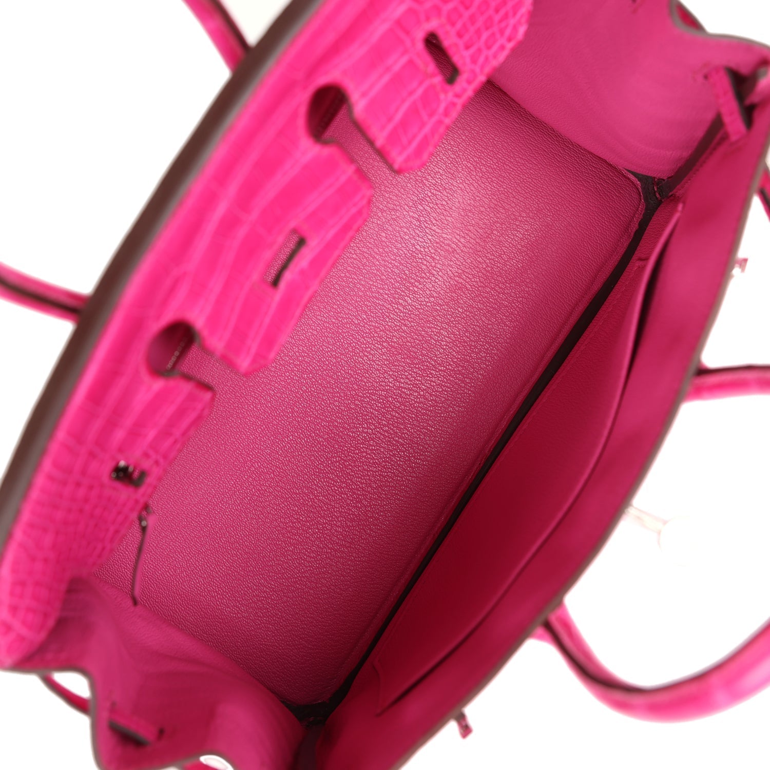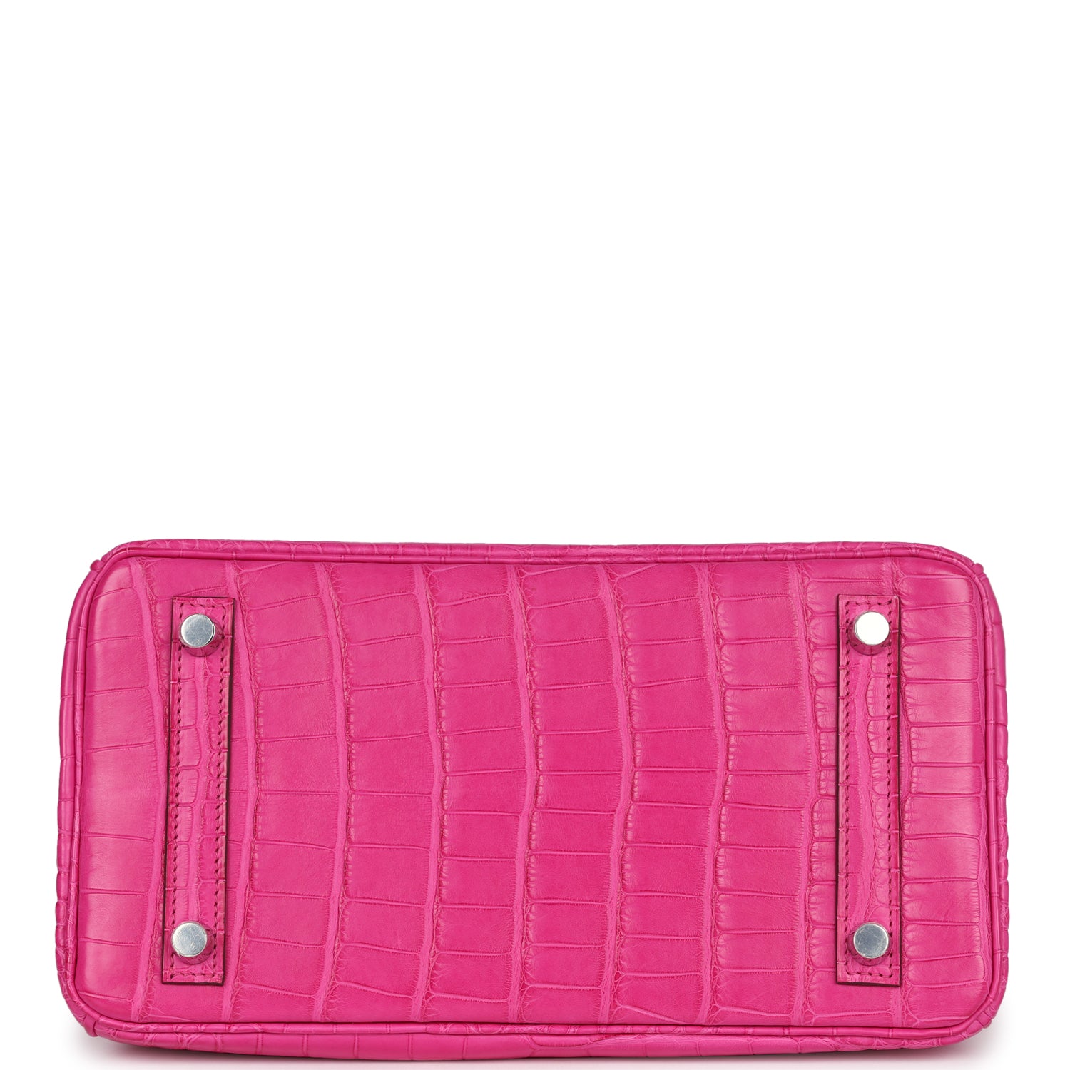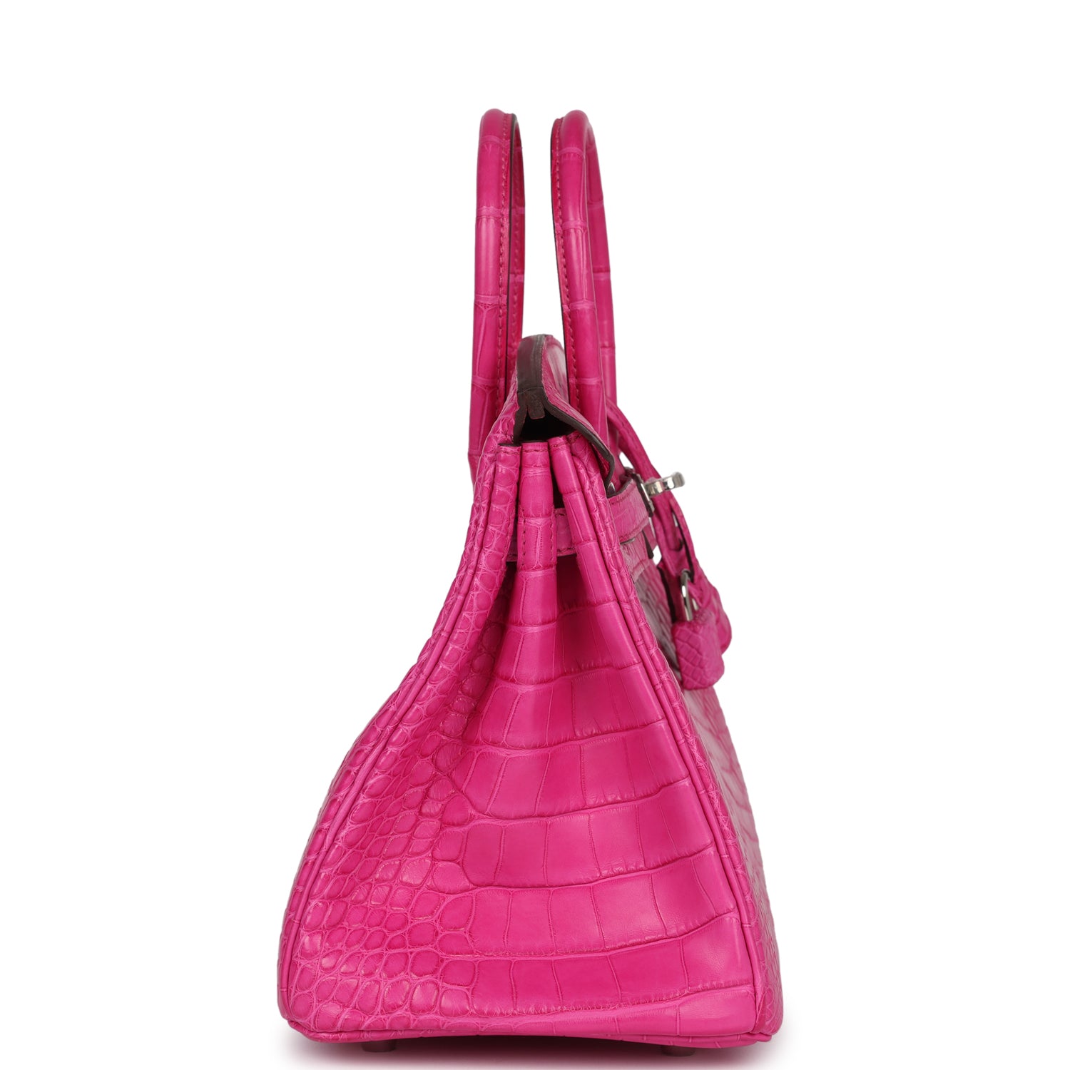 Birkin is in Rose Shocking Matte Alligator Mississippiensis leather with palladium hardware, tonal stitching, front flap with two straps, front toggle closure, clochette with lock and two keys and double rolled handles.