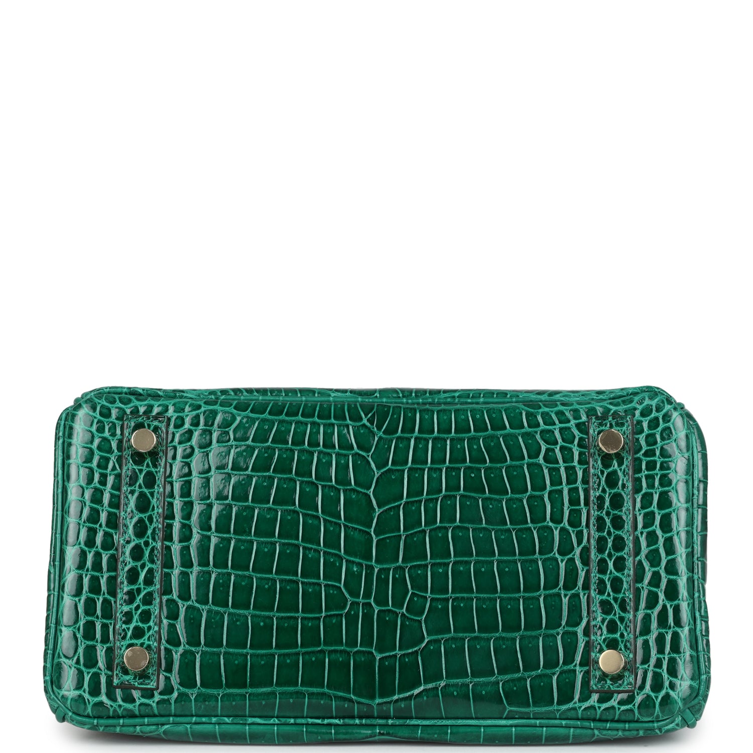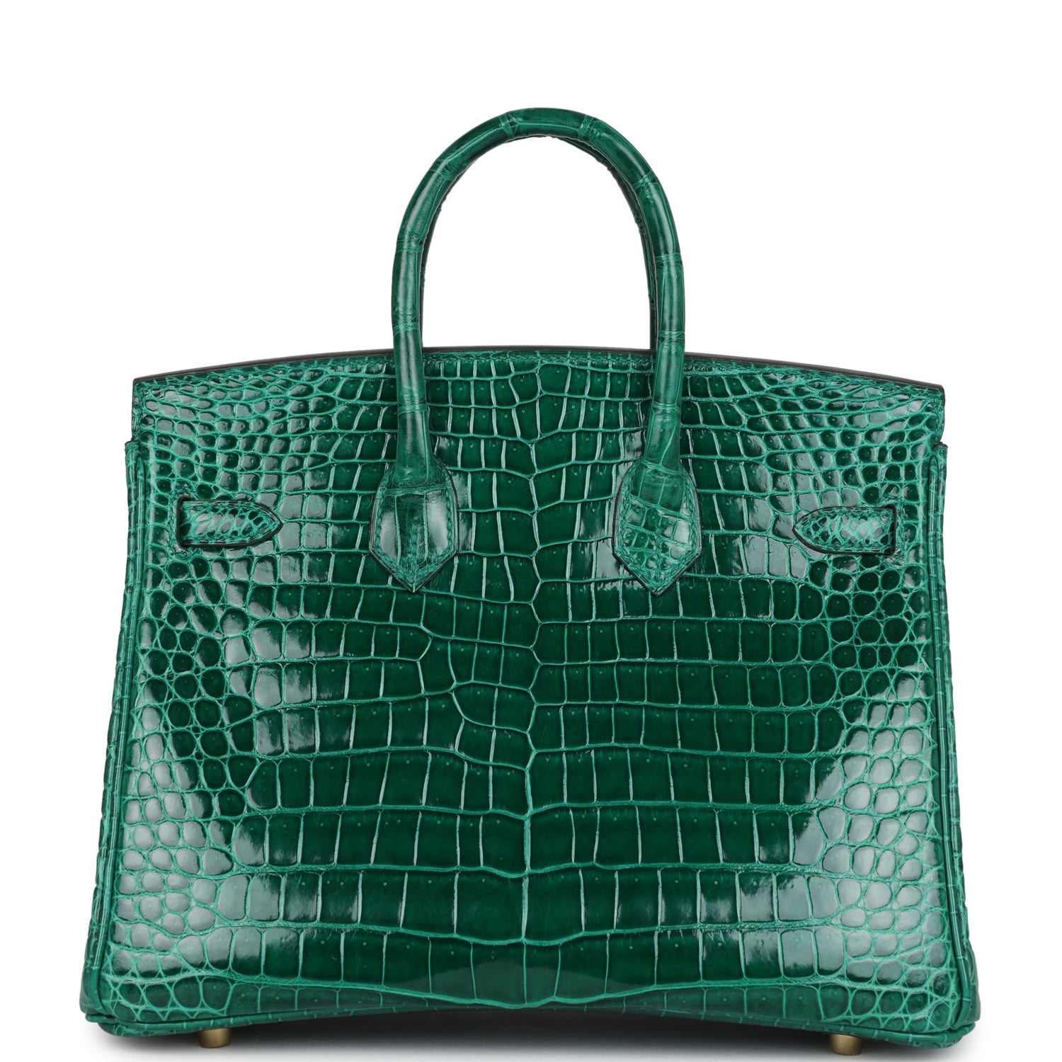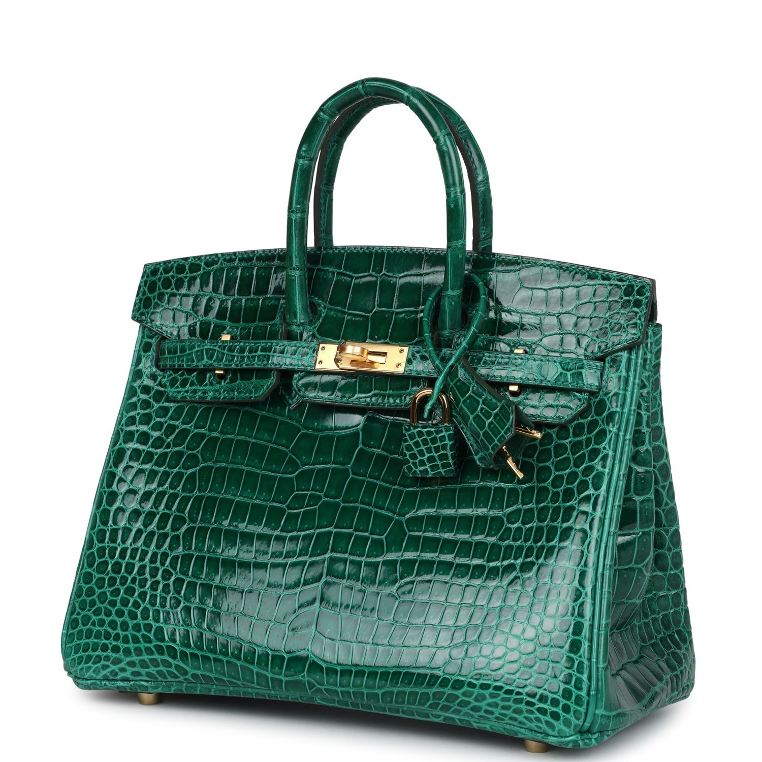 Birkin is in Vert Emeraude shiny porosus crocodile with gold hardware and has tonal stitching, front flap, two straps with center toggle closure, clochette with lock and two keys, and double rolled handles.