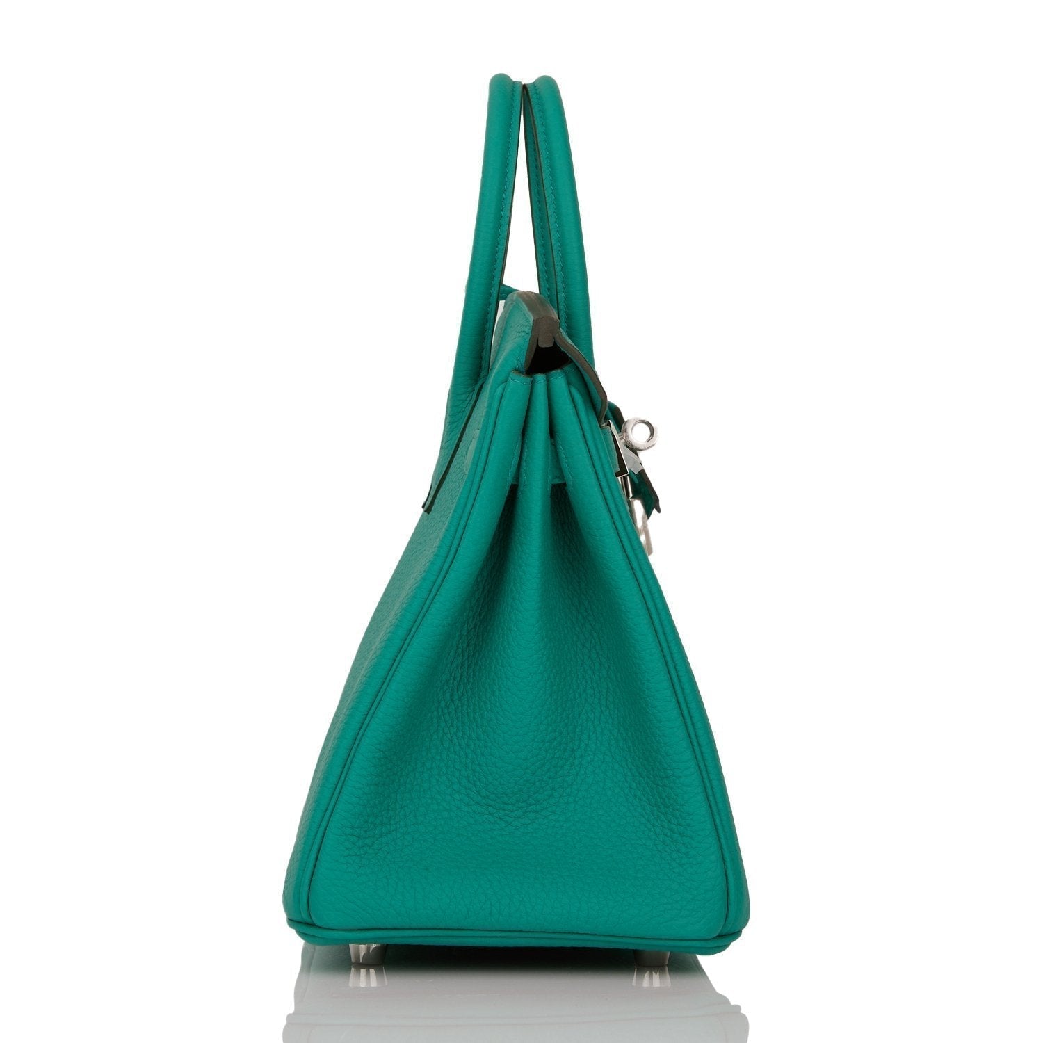 This Birkin is in Vert Verone togo leather with palladium hardware and has tonal stitching, two straps with front toggle closure, clochette with lock and two keys and double rolled handles.