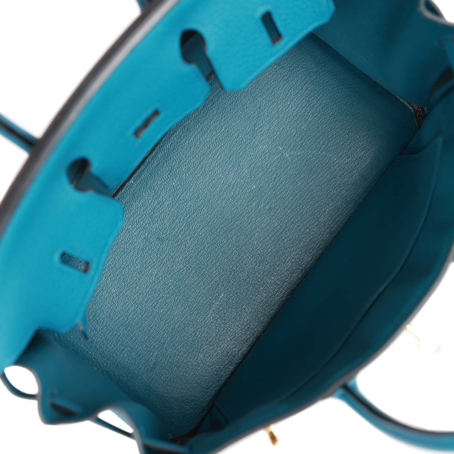 Preowned Birkin is in Cobalt togo leather with gold hardware and has tonal stitching, front flap, two straps with center toggle closure, clochette with lock and two keys, and double rolled handles.