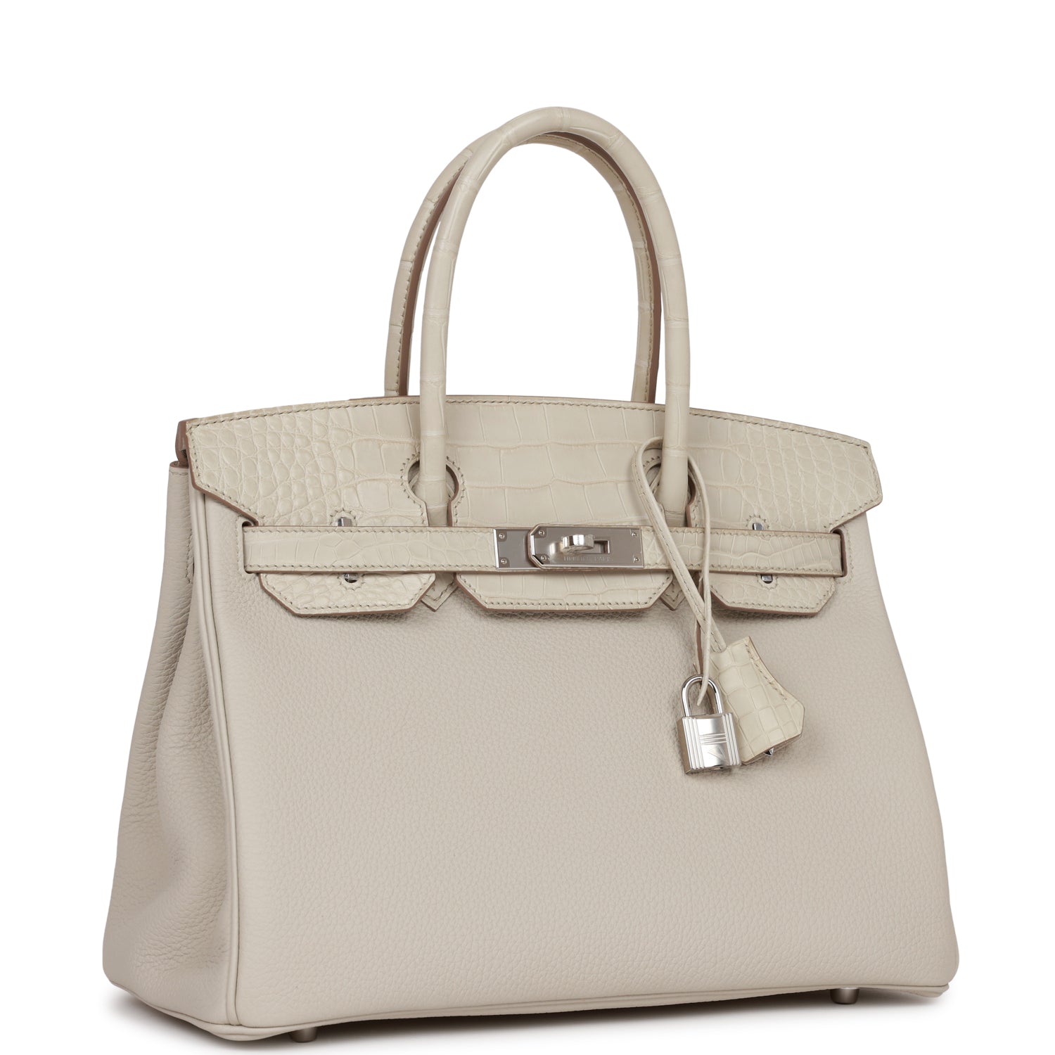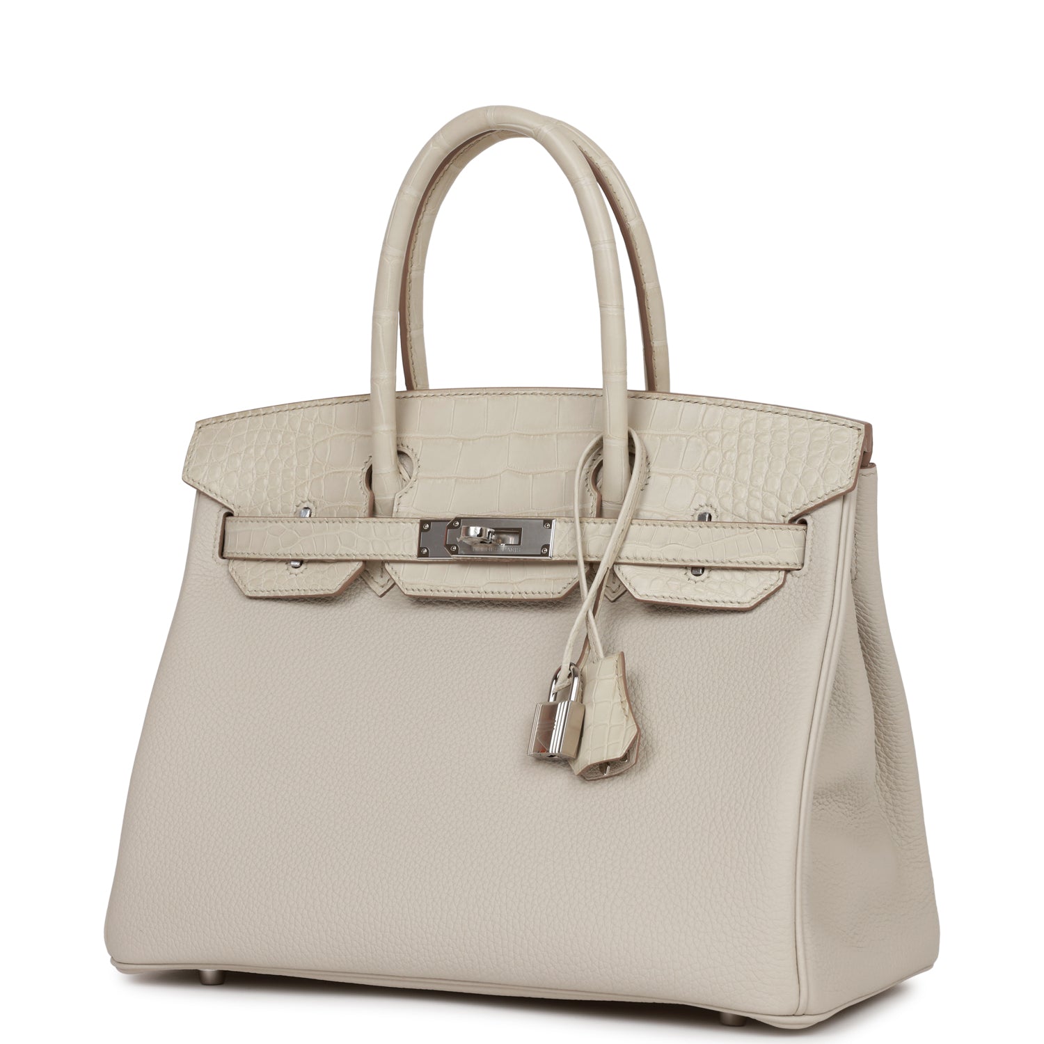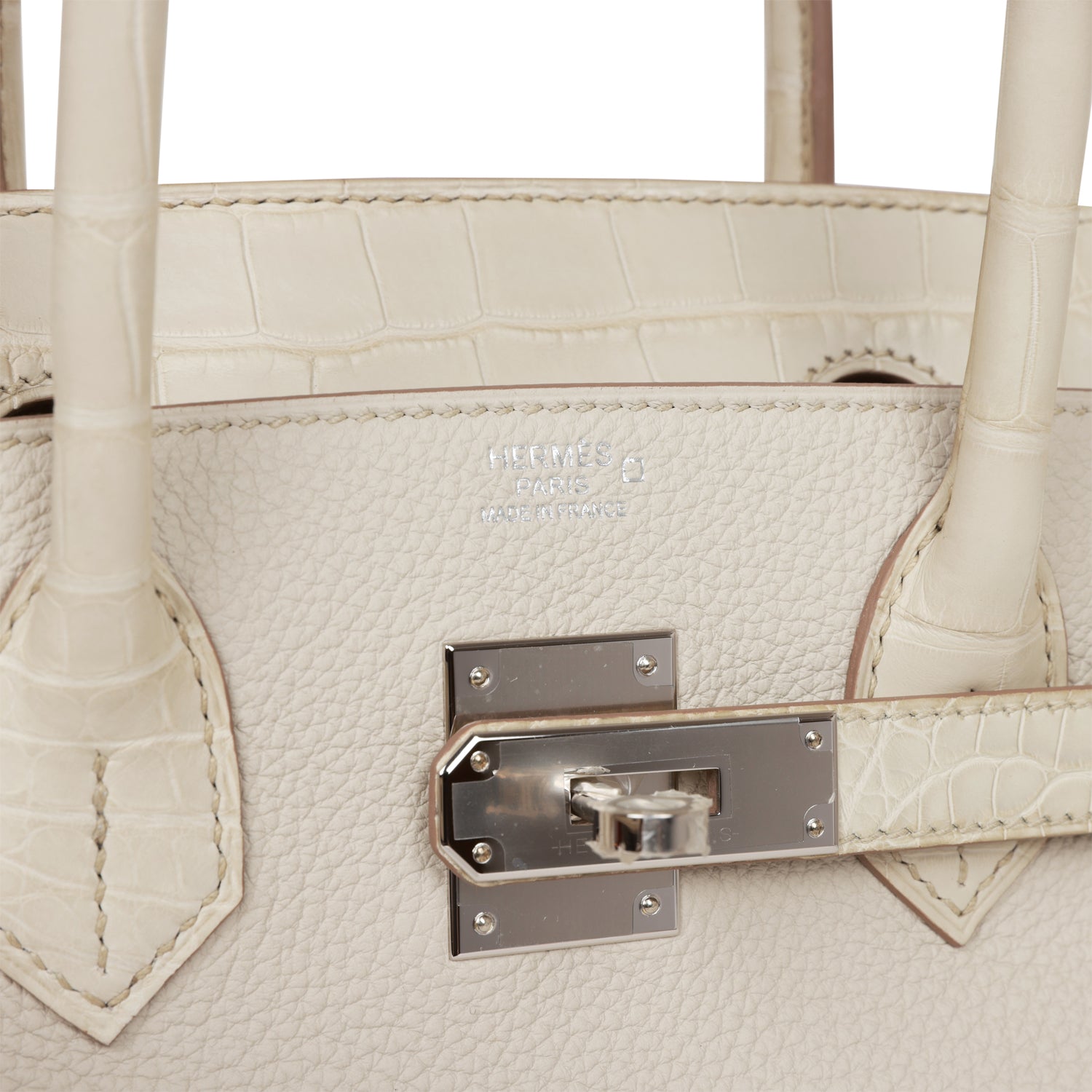 This Birkin "Touch" is in Beton matte alligator and Beton togo leather with palladium hardware and has tonal stitching, two straps with front toggle closure, clochette with lock and two keys and double rolled crocodile handles.