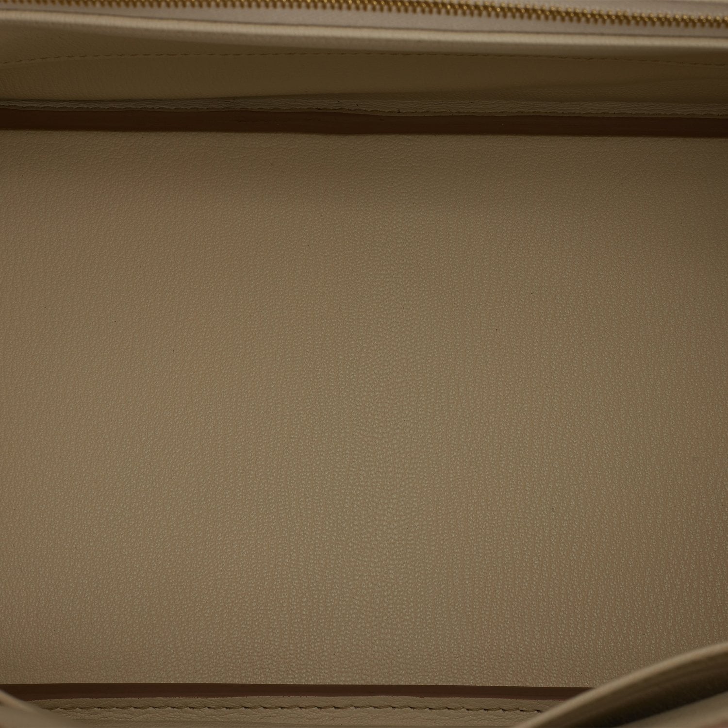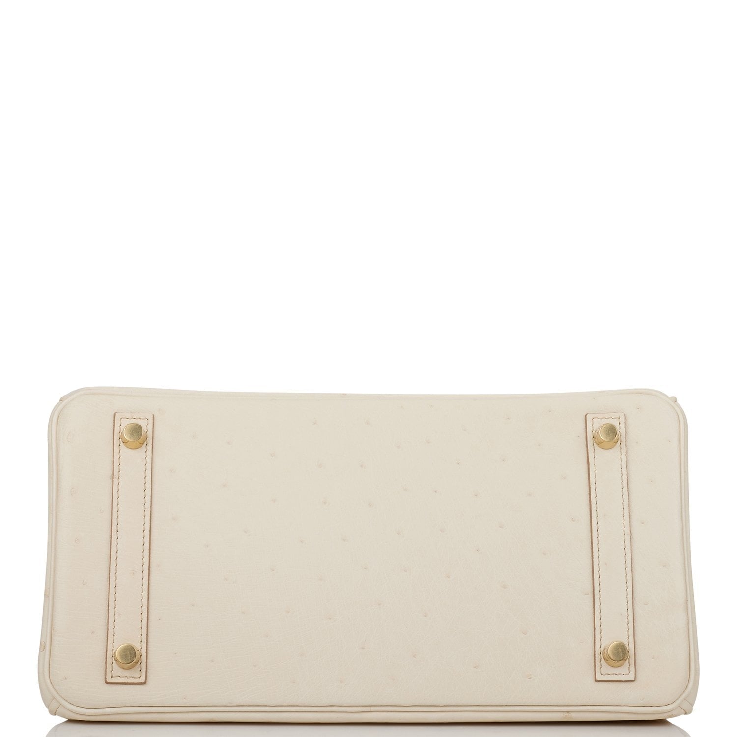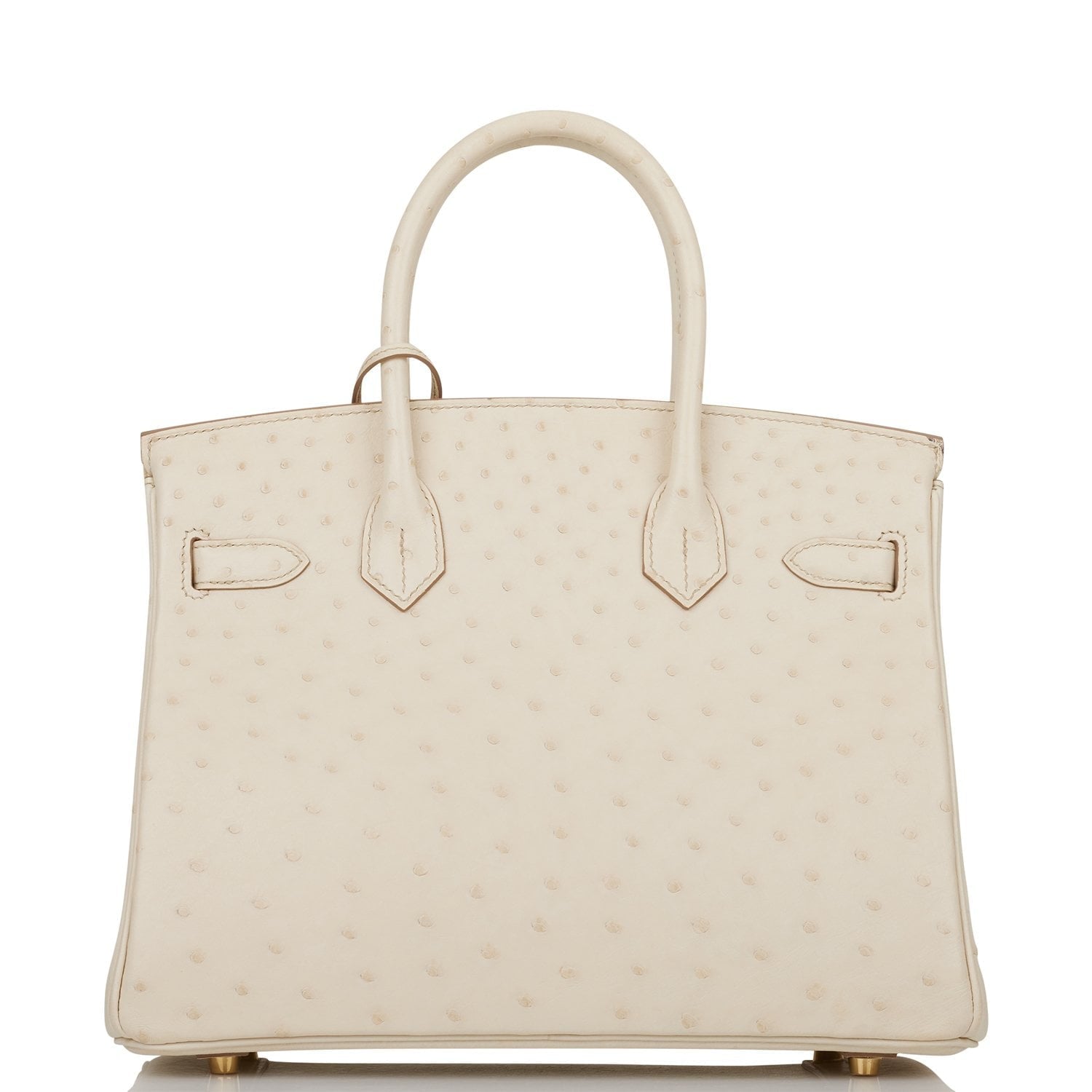This Birkin is in Beton ostrich with gold hardware and features tonal stitching, front flap, two straps with center toggle closure, clochette with lock and two keys, and double rolled handles.
