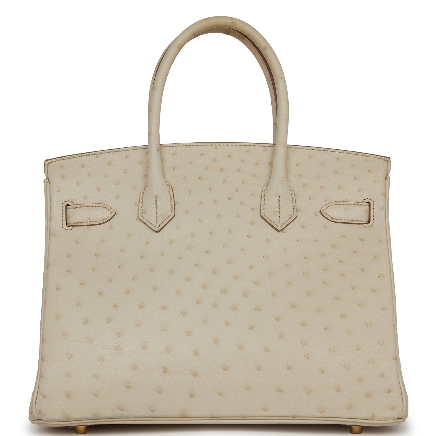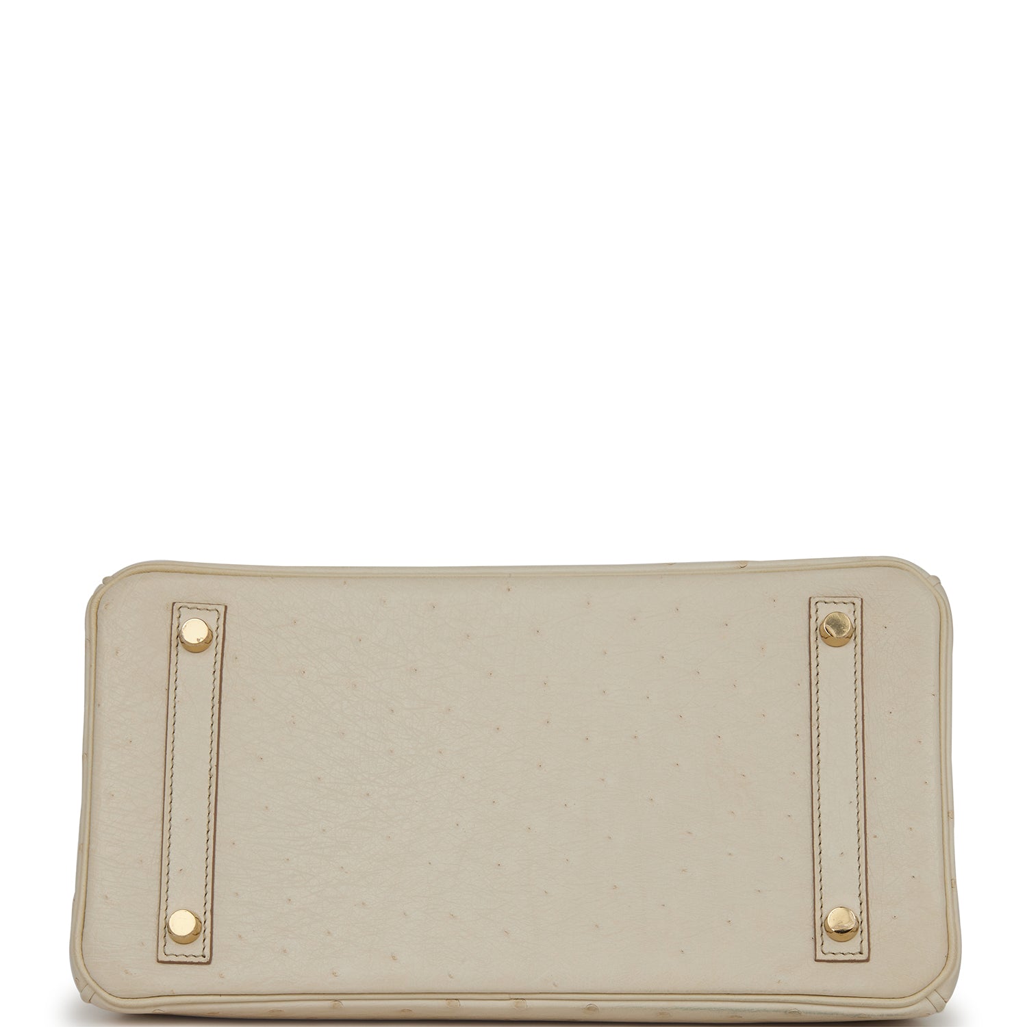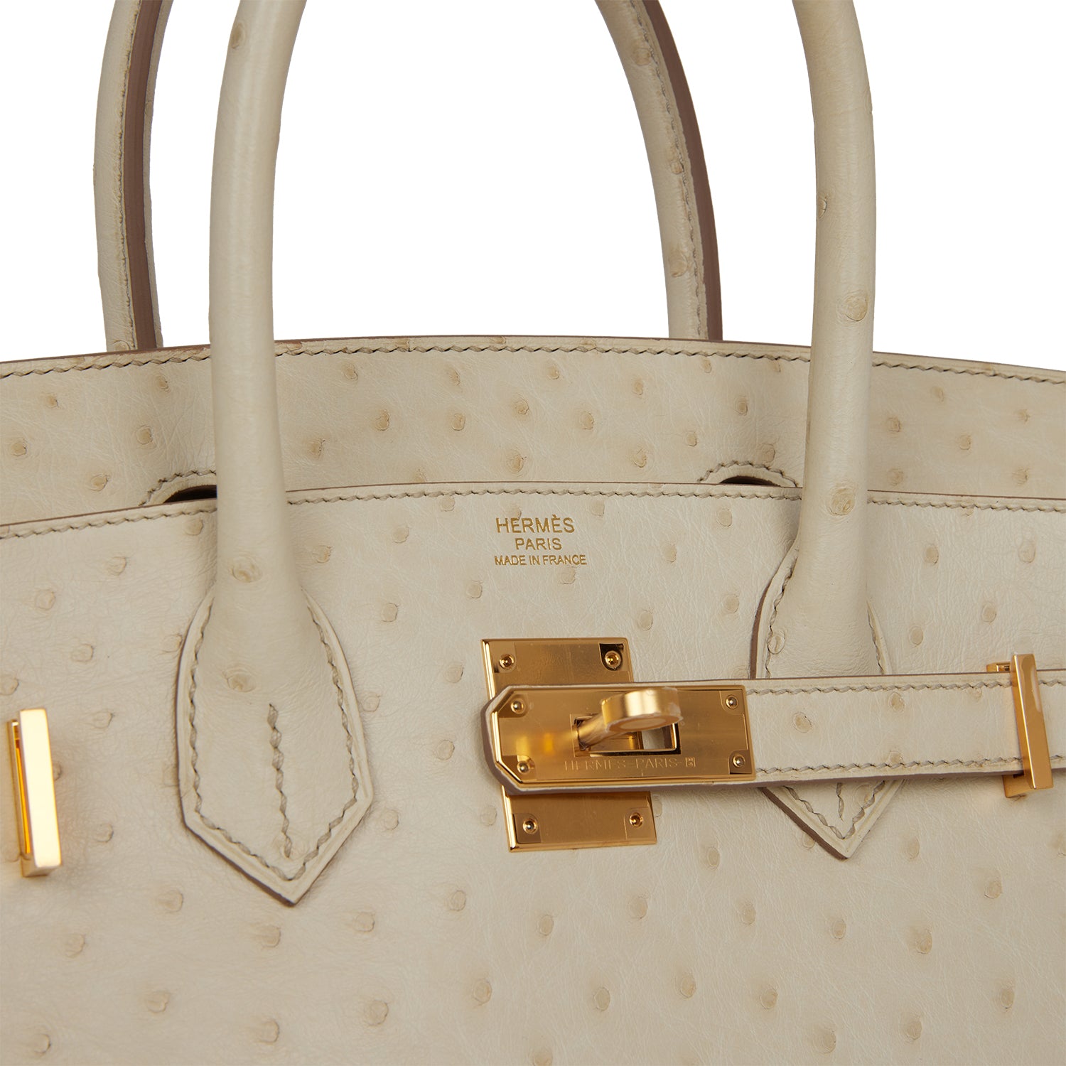 This Birkin is in Beton ostrich with gold hardware and features tonal stitching, front flap, two straps with center toggle closure, clochette with lock and two keys, and double rolled handles.