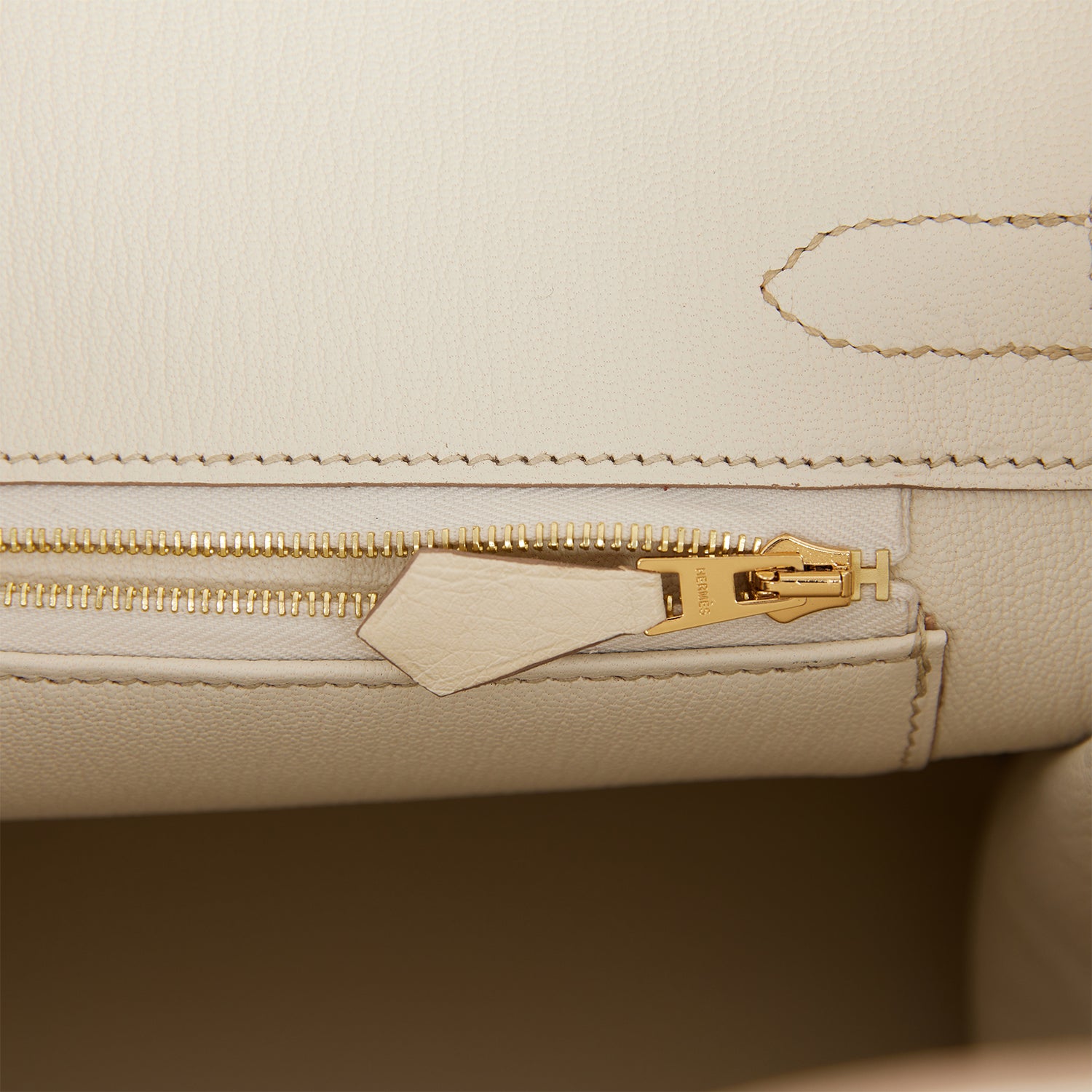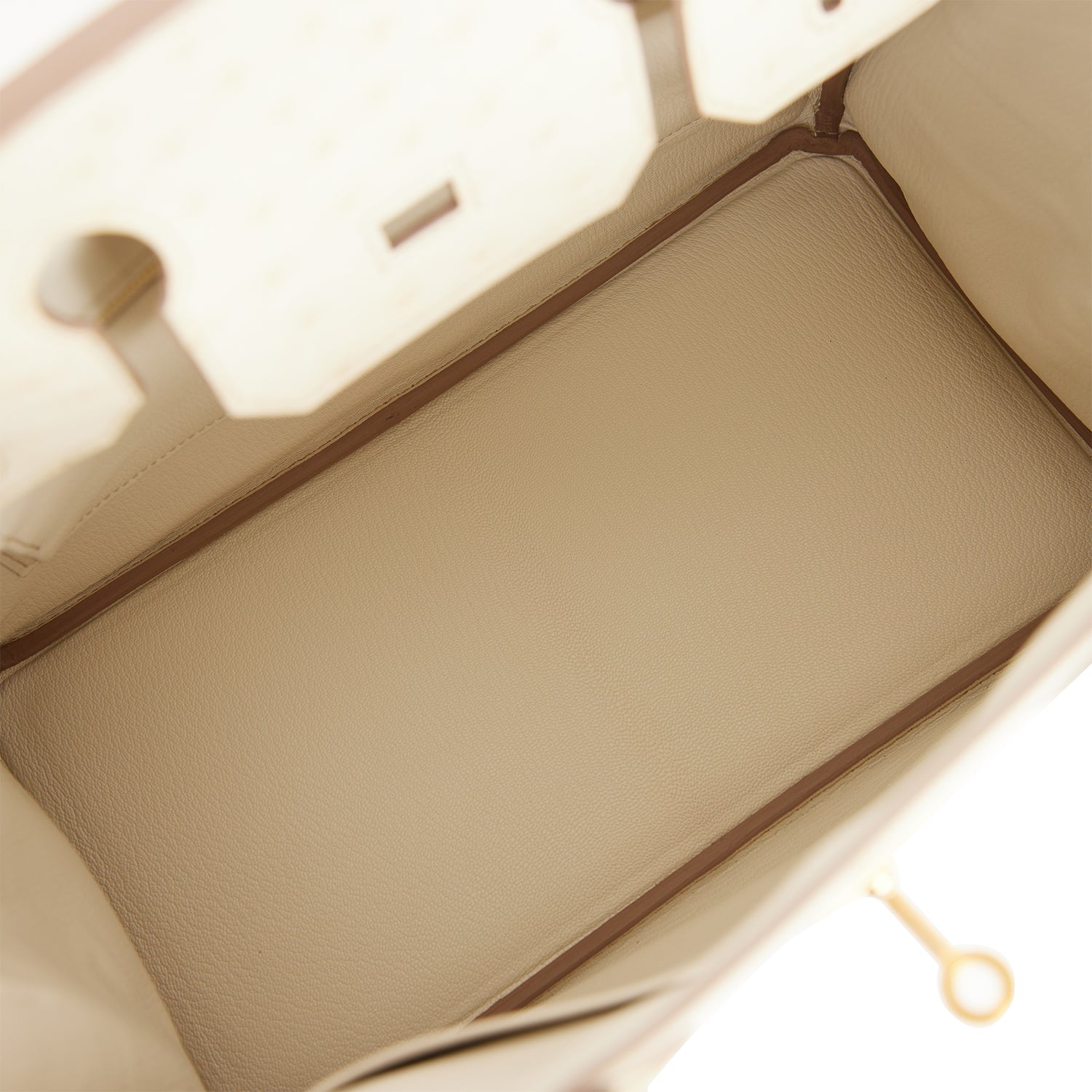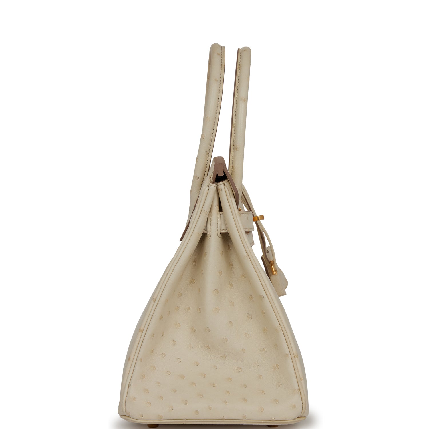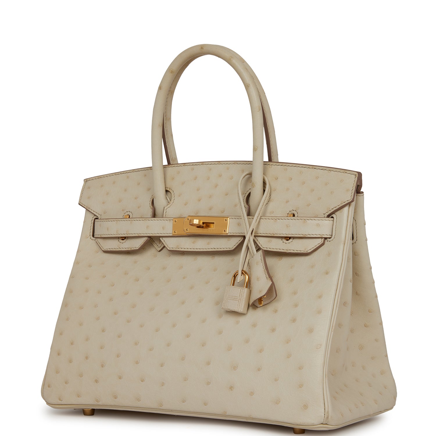 This Birkin is in Beton ostrich with gold hardware and features tonal stitching, front flap, two straps with center toggle closure, clochette with lock and two keys, and double rolled handles.