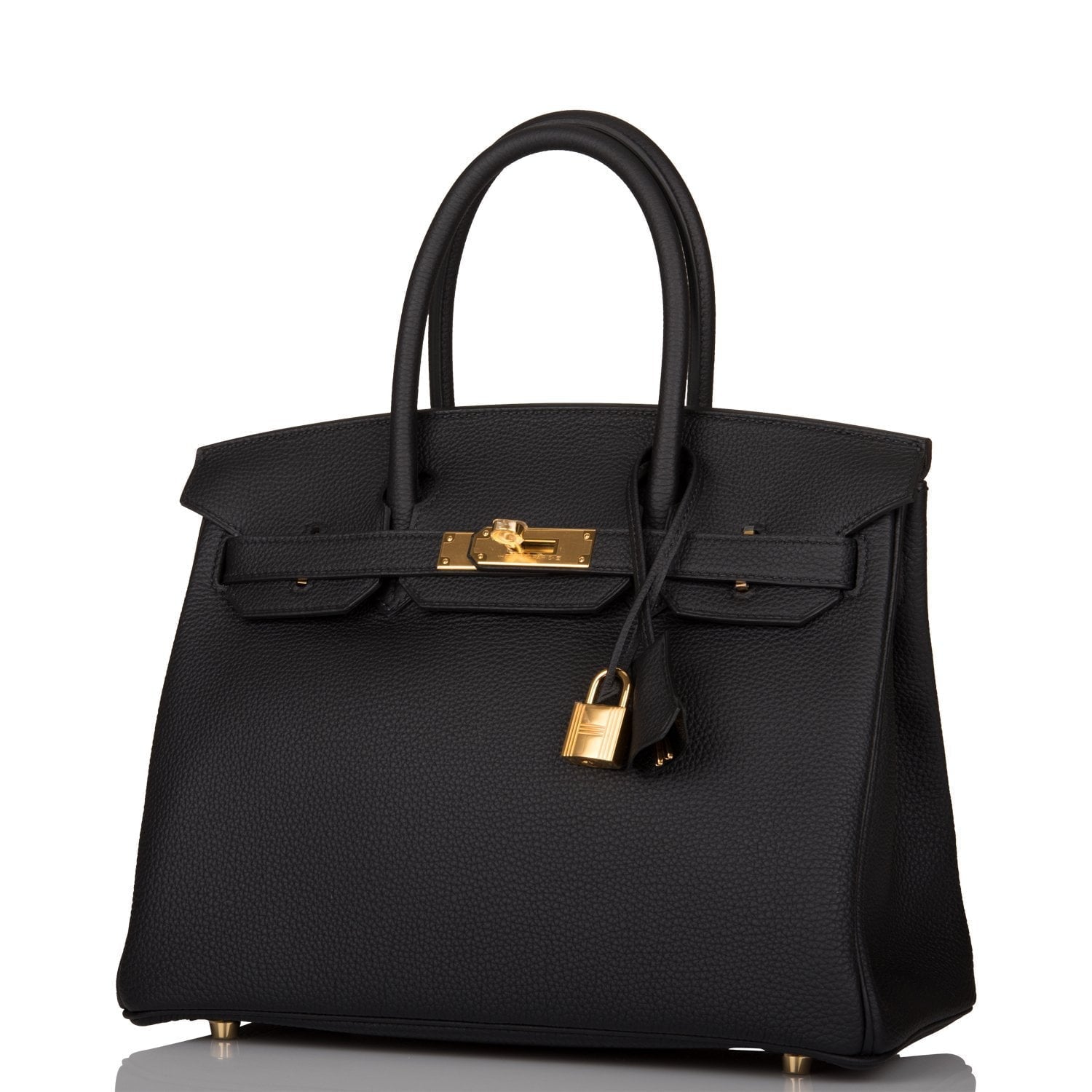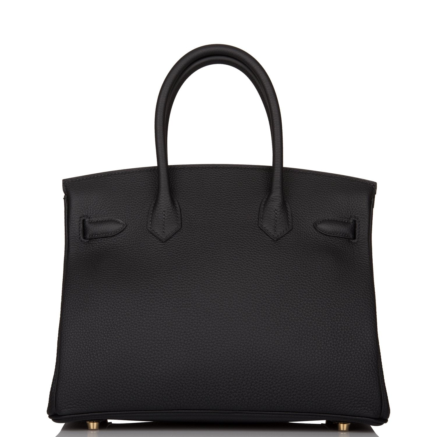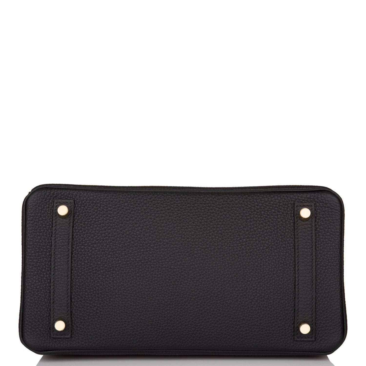 This Birkin is in Black togo leather with gold hardware and has tonal stitching, front flap, two straps with center toggle closure, clochette with lock and two keys, and double rolled handles.