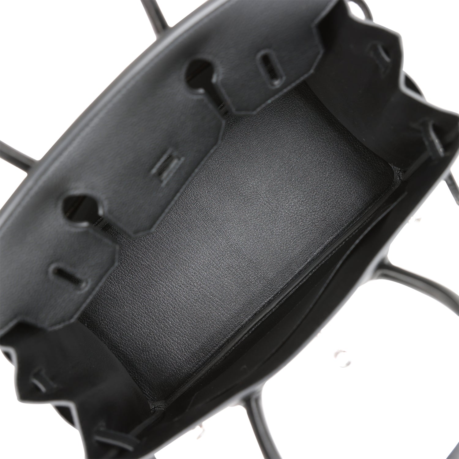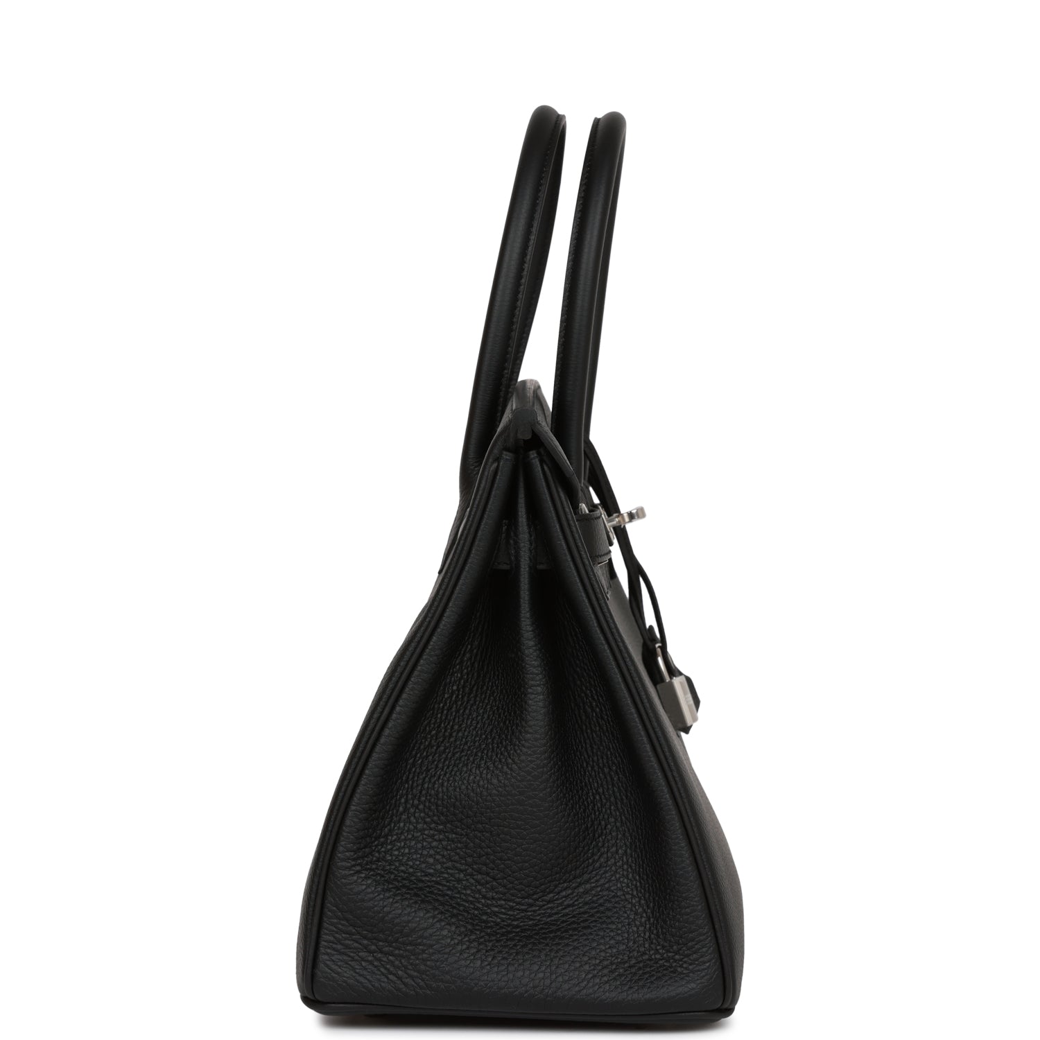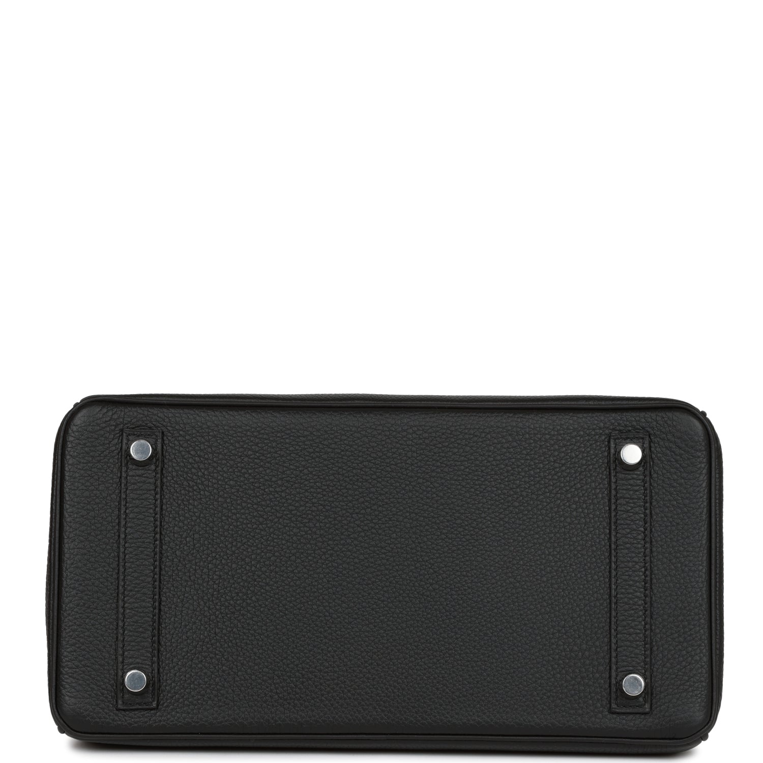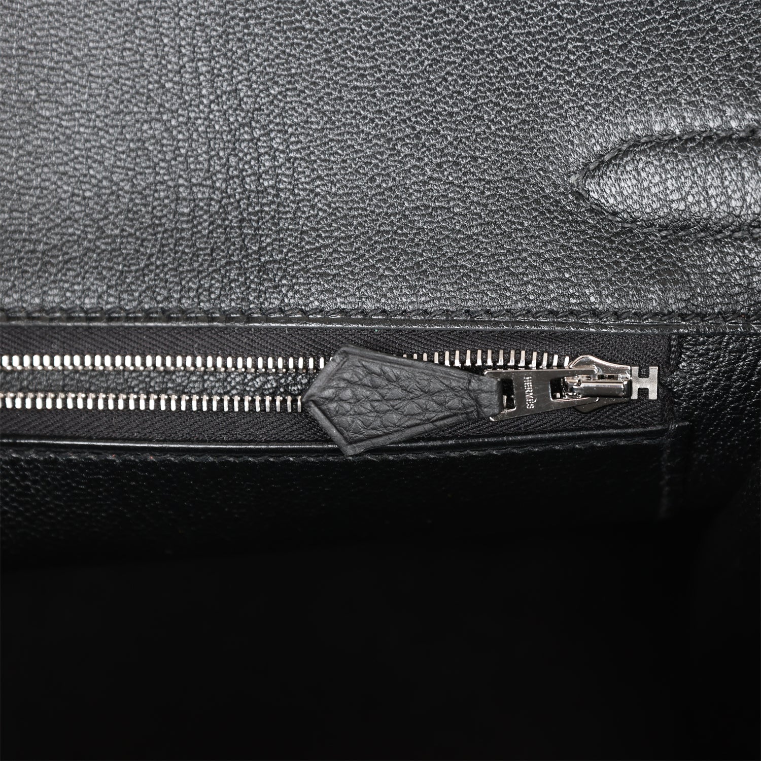 This Birkin is in Black togo leather with palladium hardware and has tonal stitching, front flap, two straps with center toggle closure, clochette with lock and two keys, and double rolled handles.