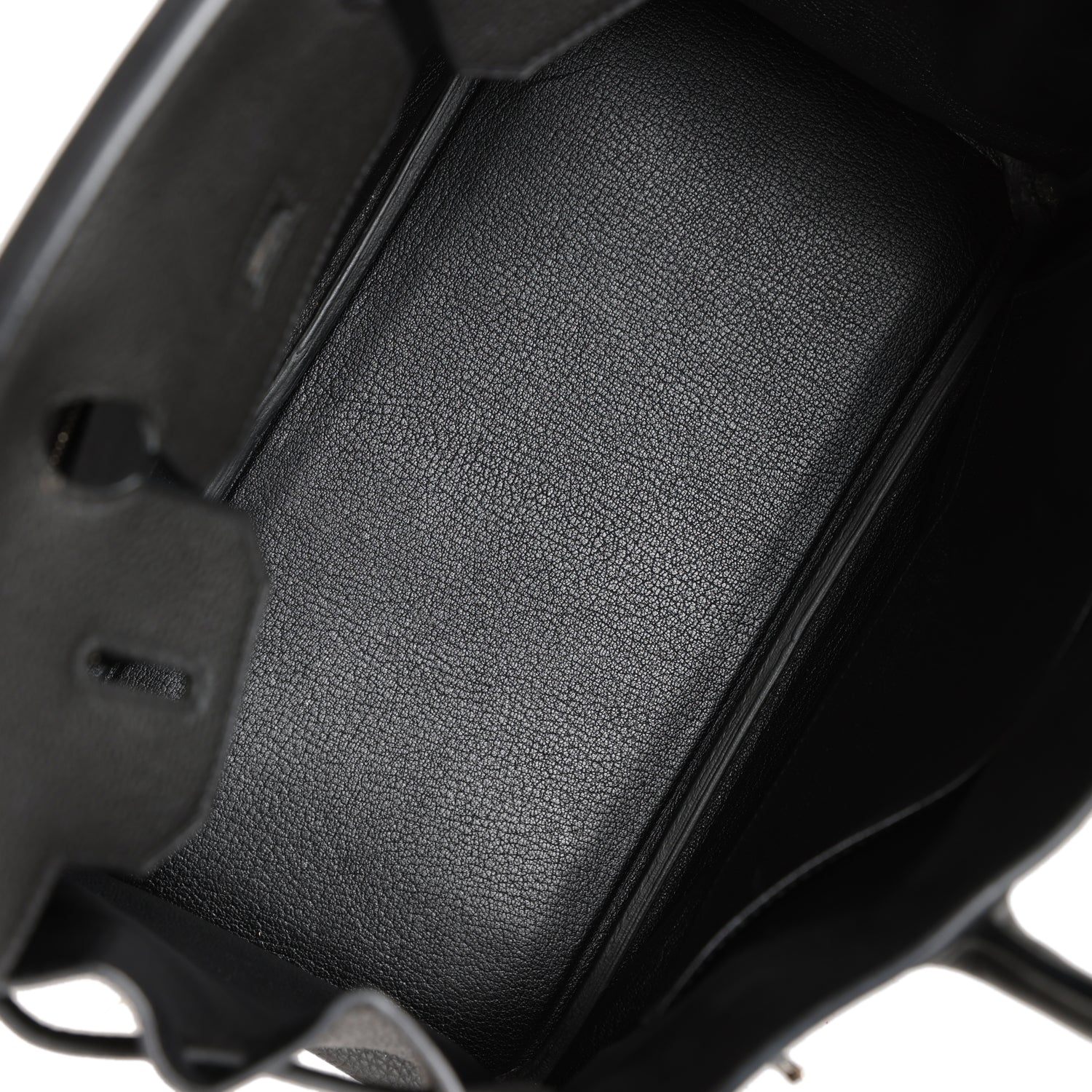 The interior is lined with black chevre and has one zip pocket with an Hermes engraved zipper pull and an open pocket on the opposite side.