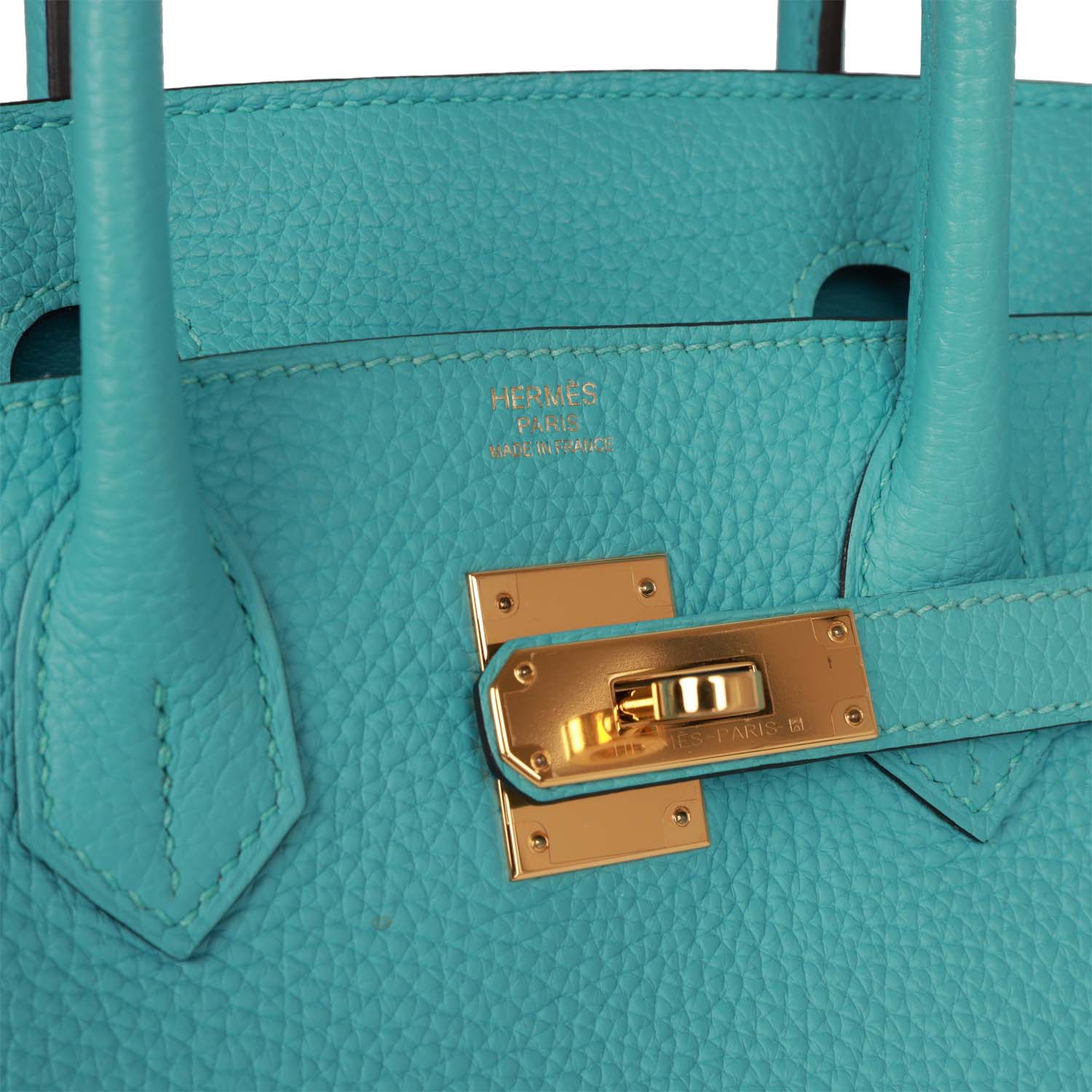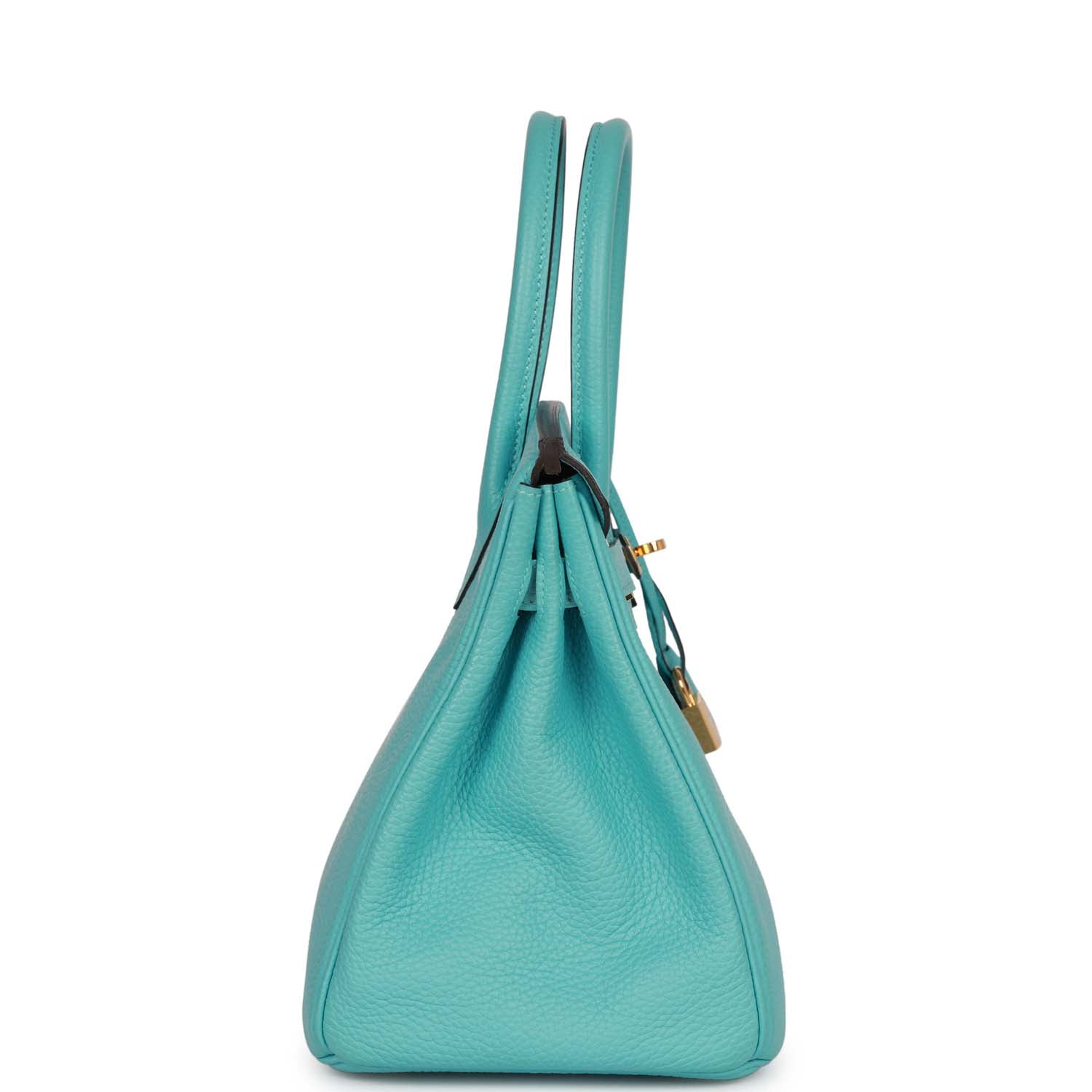 This Birkin is in Bleu Atoll clemence leather with gold hardware and has tonal stitching, front flap, two straps with center toggle closure, clochette with lock and two keys, and double rolled handles.