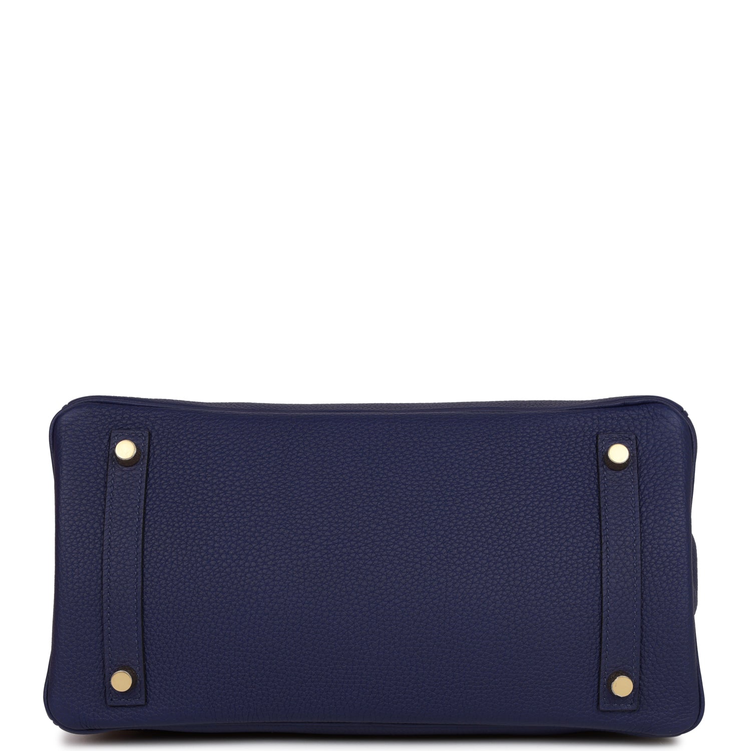This Birkin is in Bleu Encre togo leather with gold hardware and has tonal stitching, front flap, two straps with center toggle closure, clochette with lock and two keys, and double rolled handles.