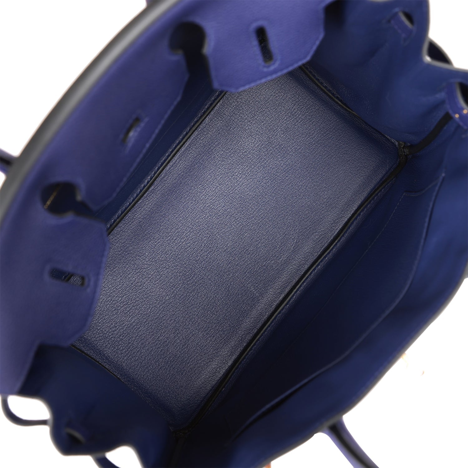 The interior is lined with Bleu Encre chevre and has one zip pocket with an Hermes engraved zipper pull and an open pocket on the opposite side.